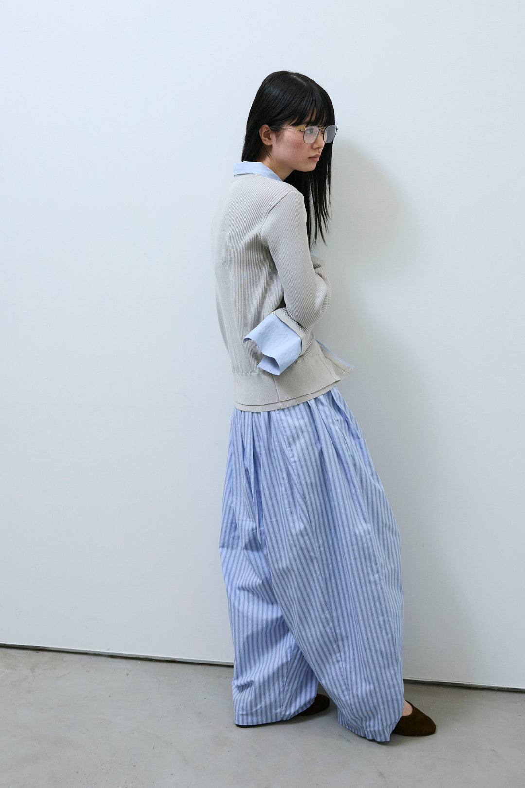 [予約/SET]襟ドッキングカーディガン+ランダムストライプタックカーブパンツ(2set)
