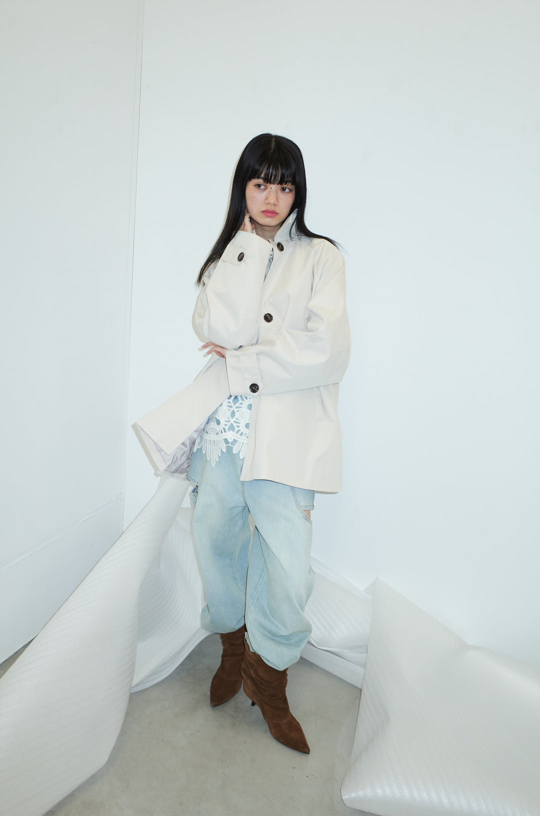 [予約/SET]TRツイルAラインショートトレンチ+レース編みブラウス+スラッシュカットデニム(3set)