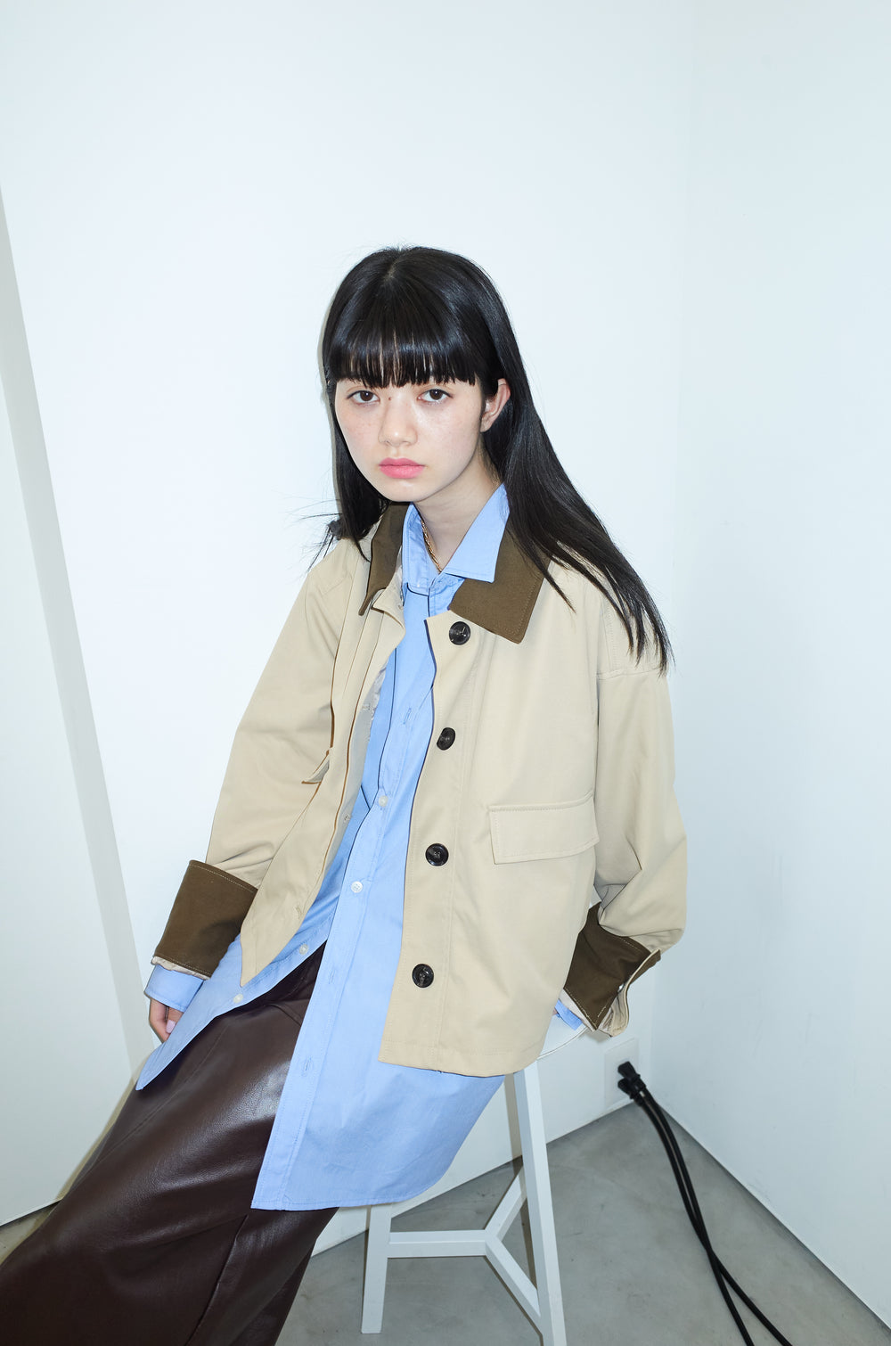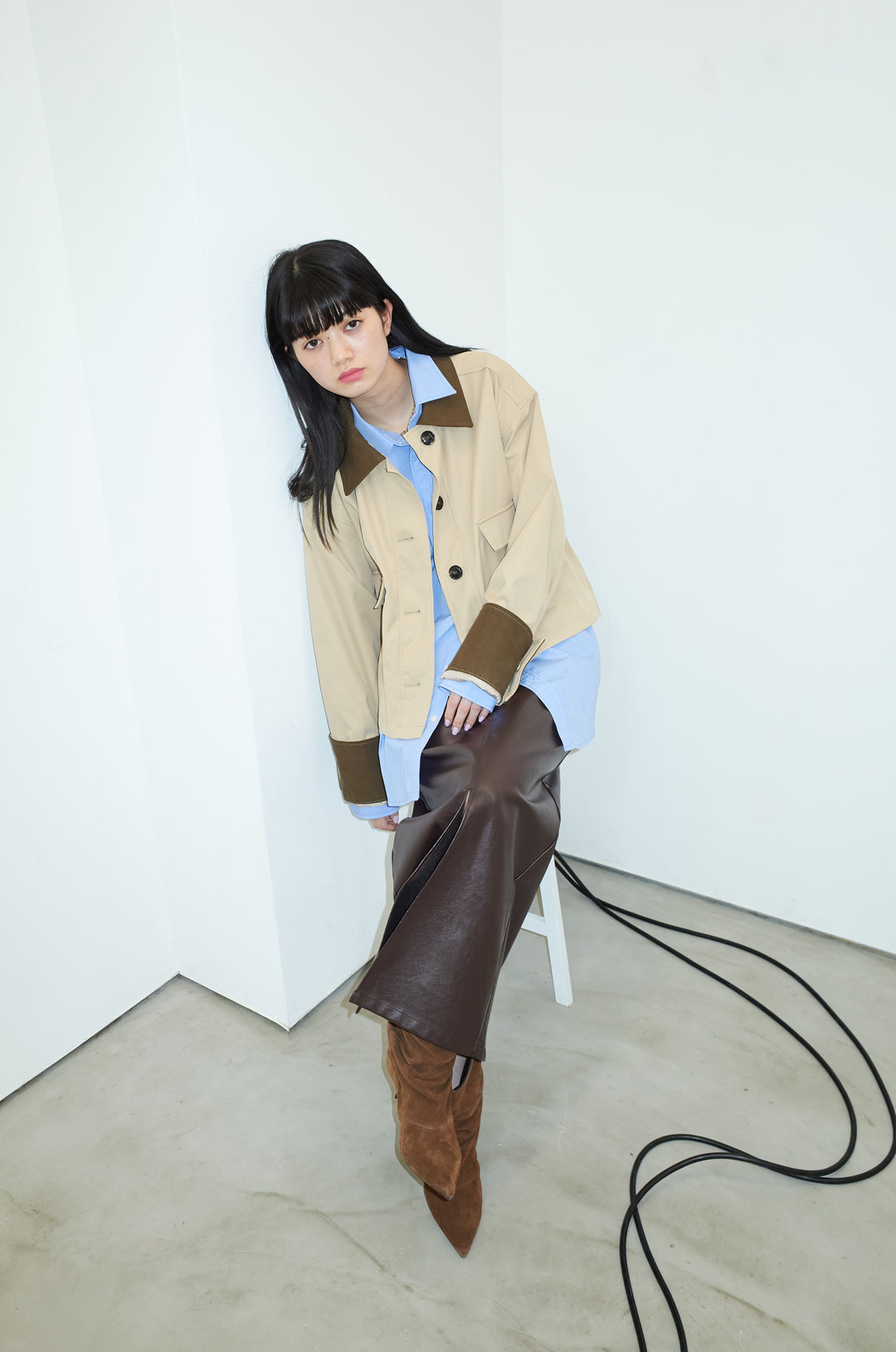 [予約/SET]襟配色カバーオール+エコレザーバックスリットペンシルスカート(2set)