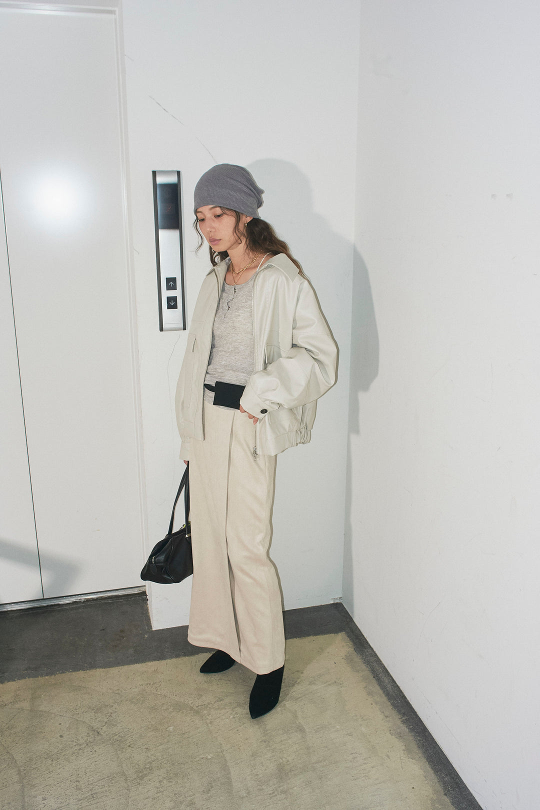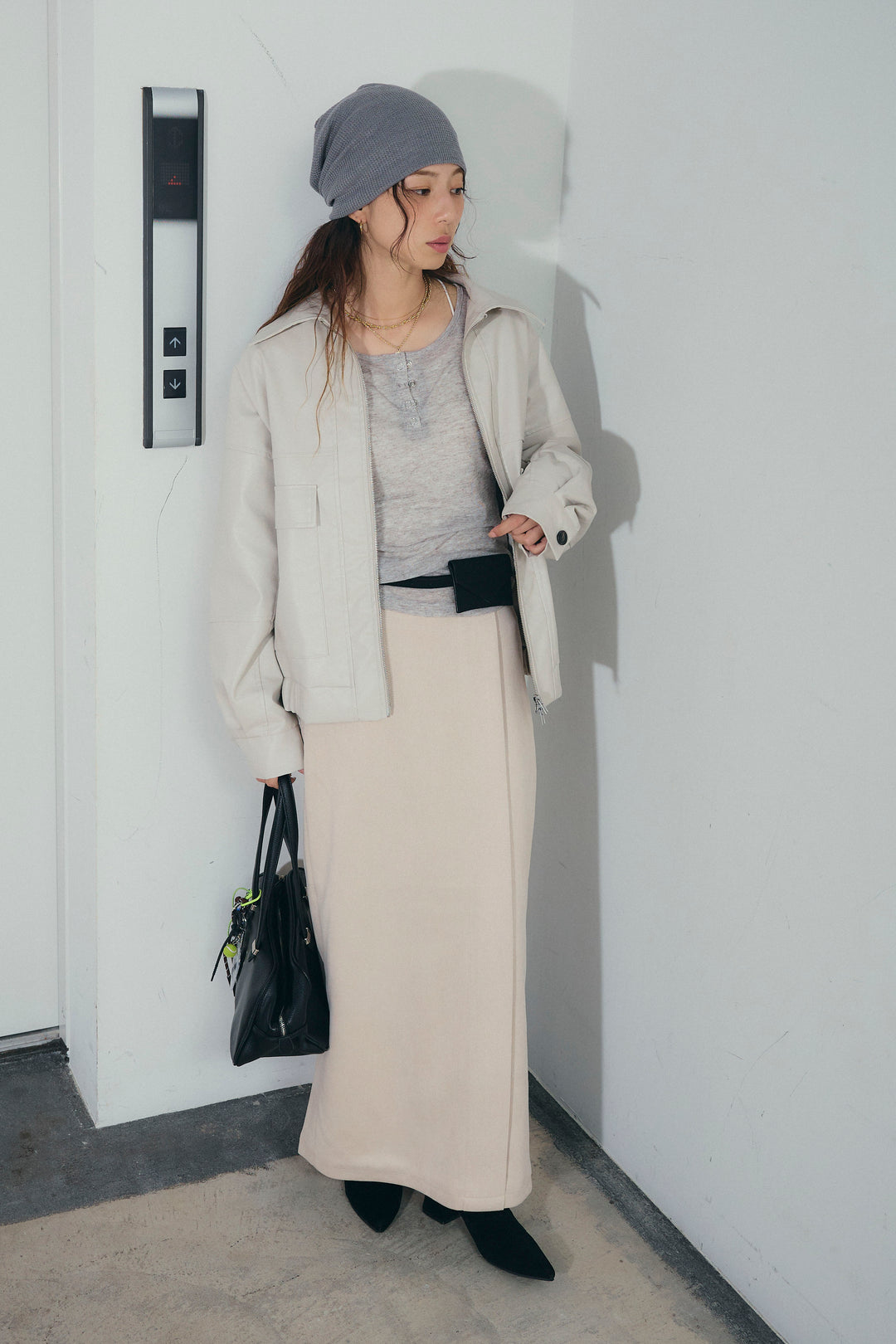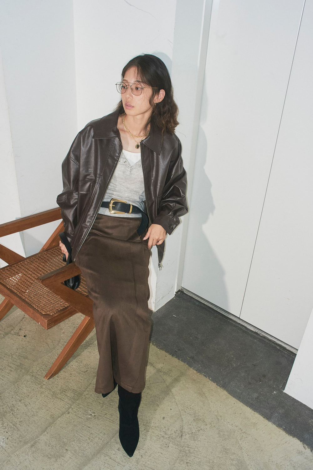 [予約/SET]エコレザー襟付きブルゾン+シアーヘンリーネックロンT+フェイクスエードラップ風Iラインスカート(3set)