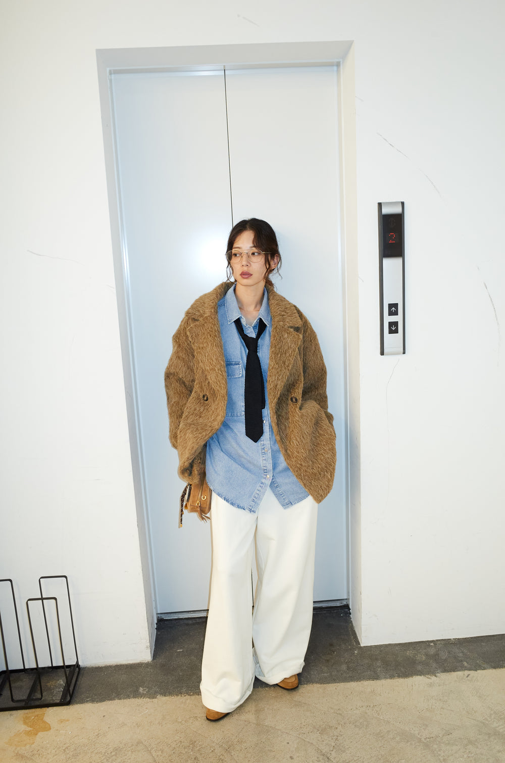 [予約/SET]シャギーミドルコート+オーバーサイズデニムシャツ+エフォートレススウェットパンツ+剣先三角シルクニットタイ(4set)