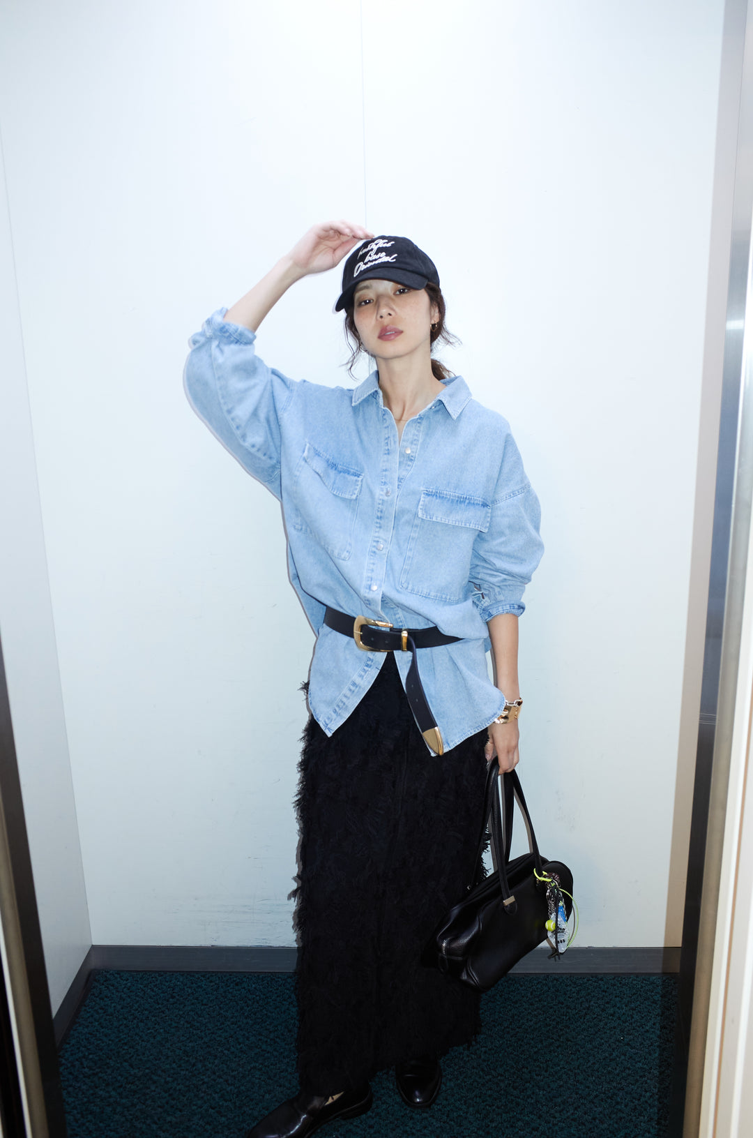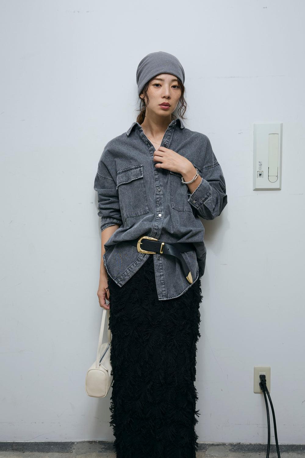 [予約/SET]オーバーサイズデニムシャツ+カットフリンジニットタイトスカート(2set)