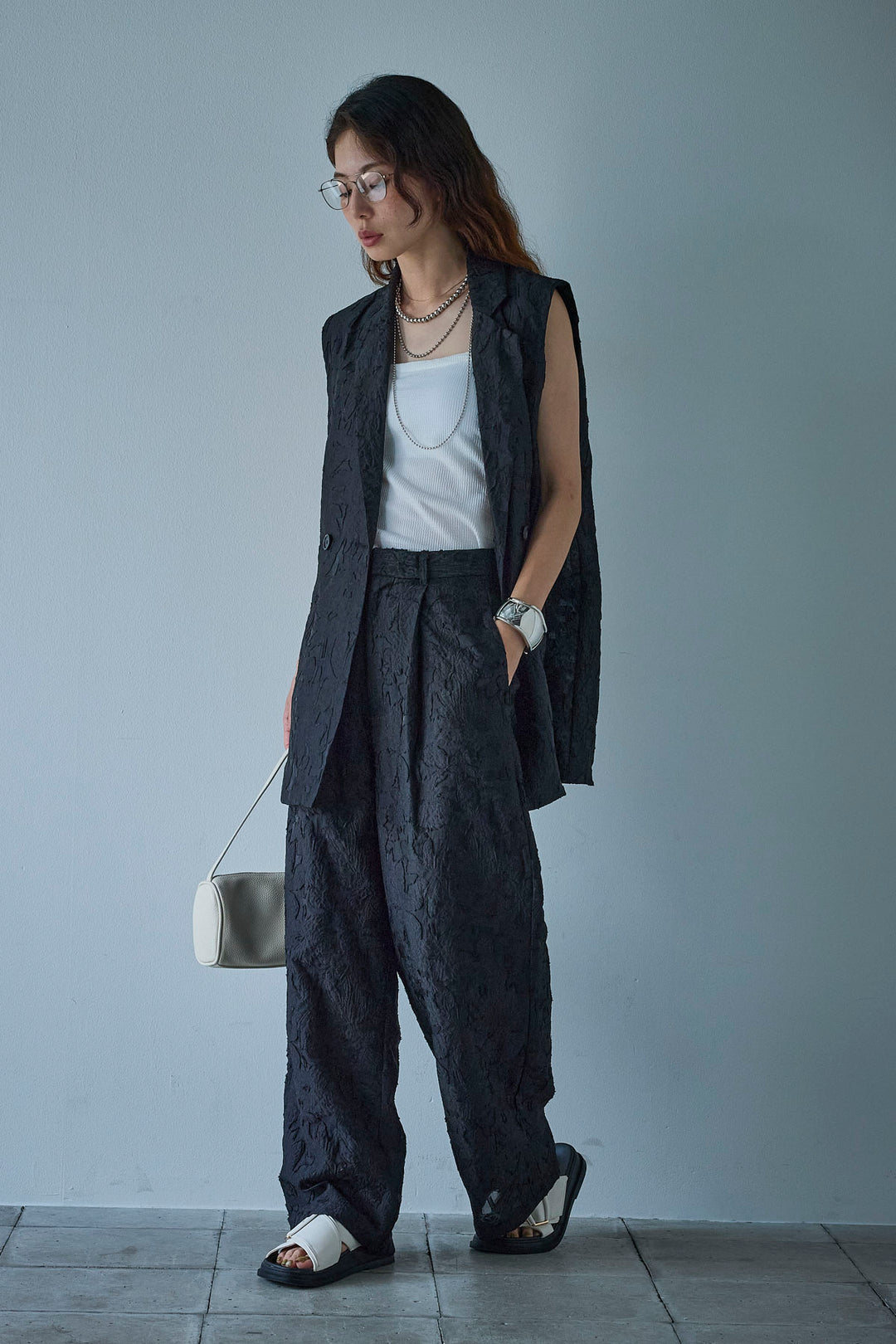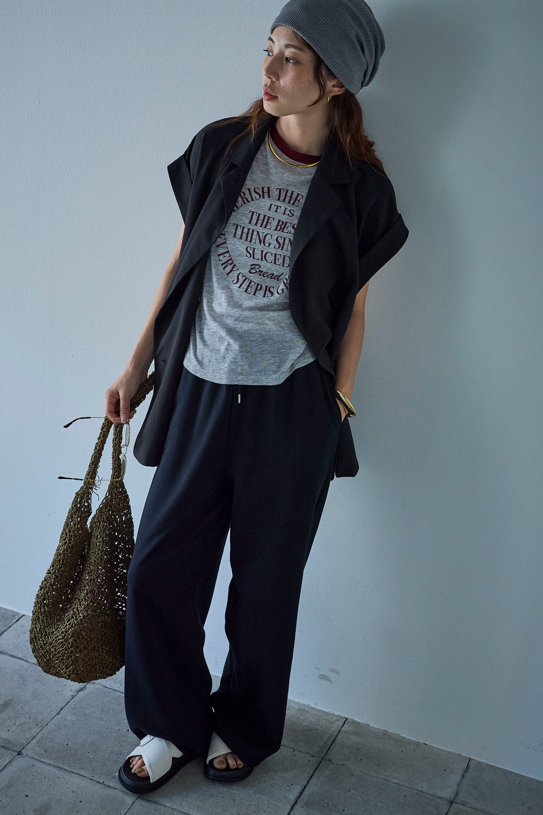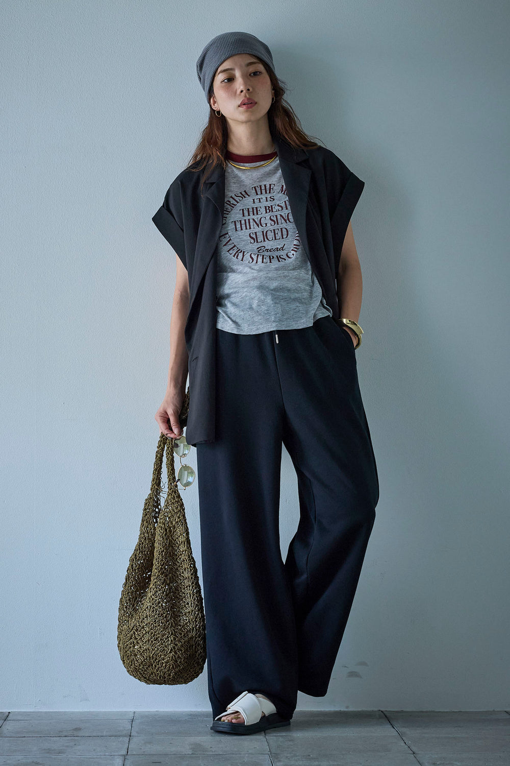 [予約/SET]クレープノースリーブダブルジレ+シアーリンガーロゴT+裏毛ワイドパンツ(3set)