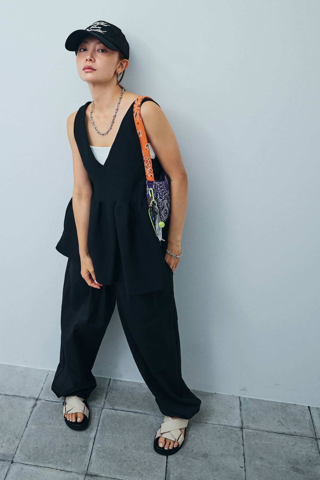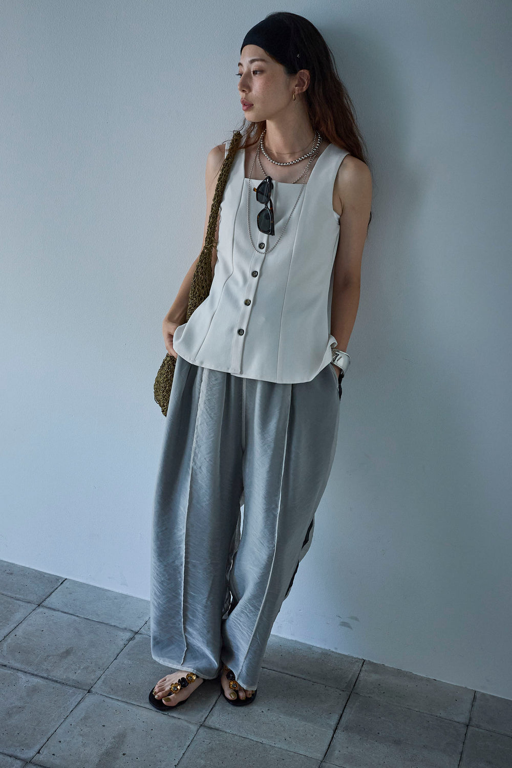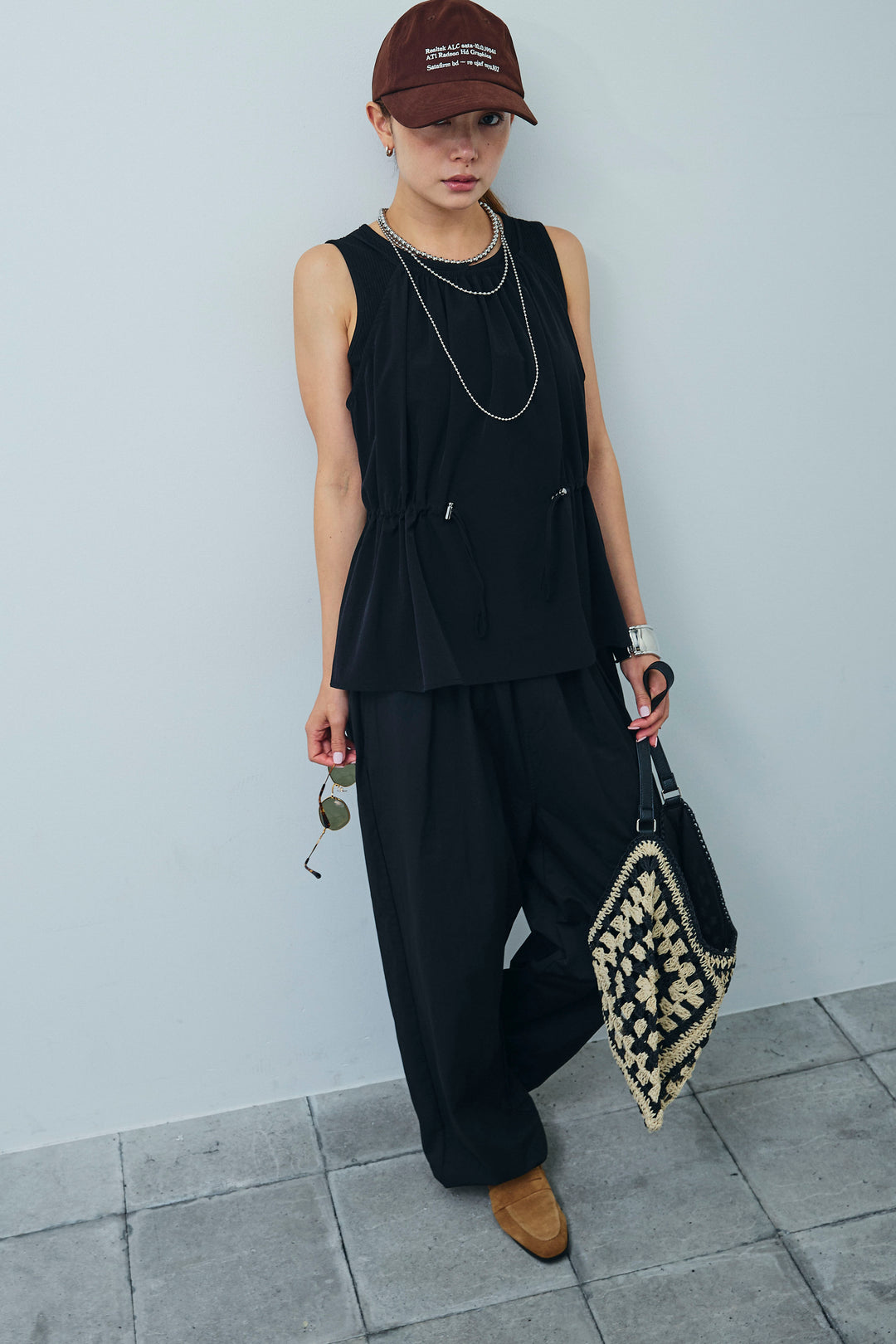 [予約/SET]ドロストギャザーキャミ+セルフカットリブヘンリーネックノースリーブトップス+裾ドロストナイロンパンツ(3set)