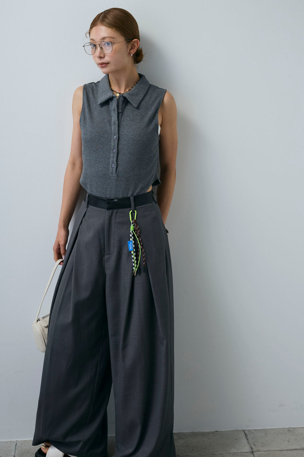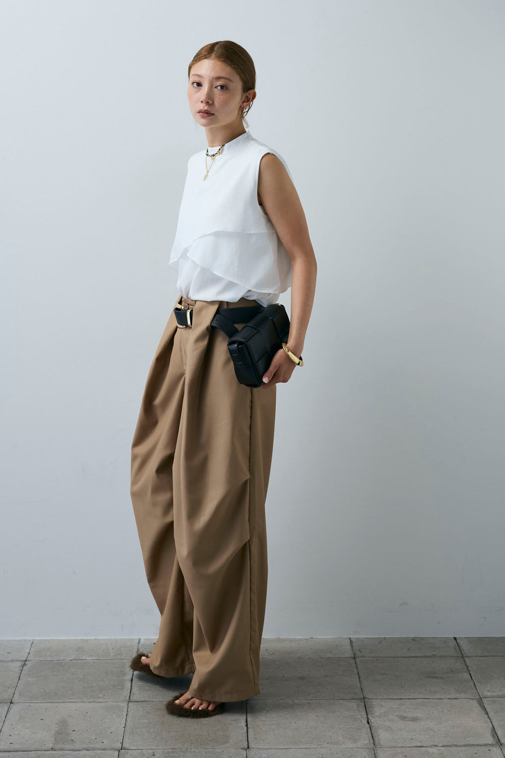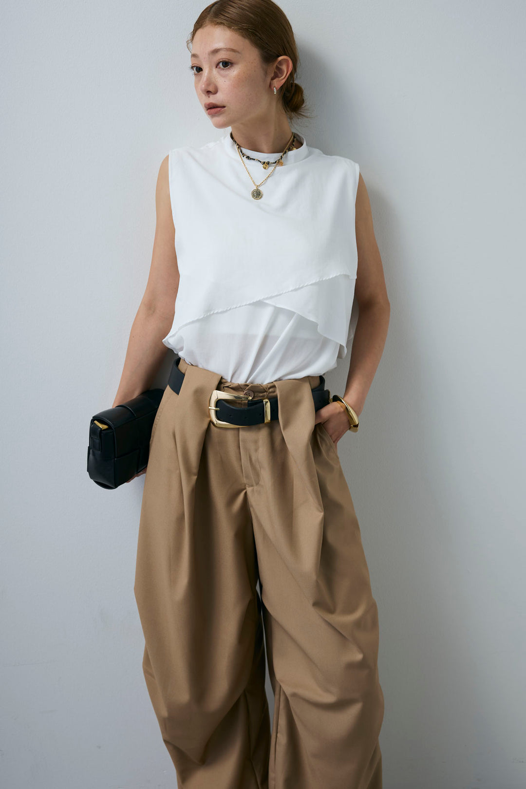 [予約/SET]アシンメトリーフレアーノースリーブブラウス+フェイクレザーベルトセンタータックパンツ(2set)