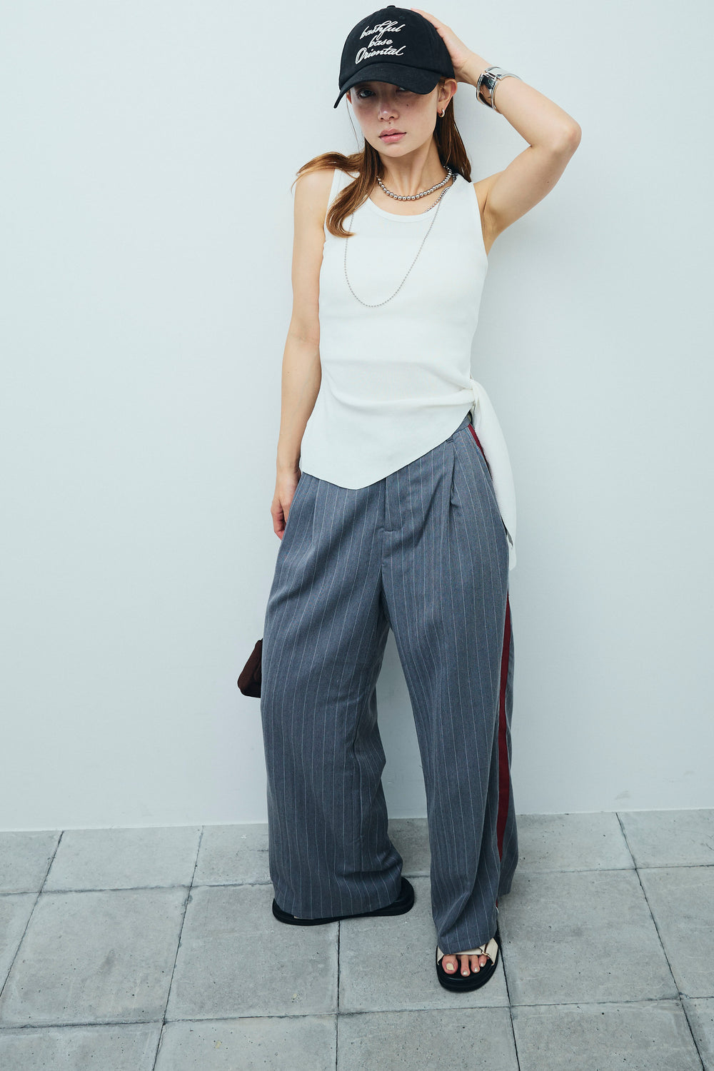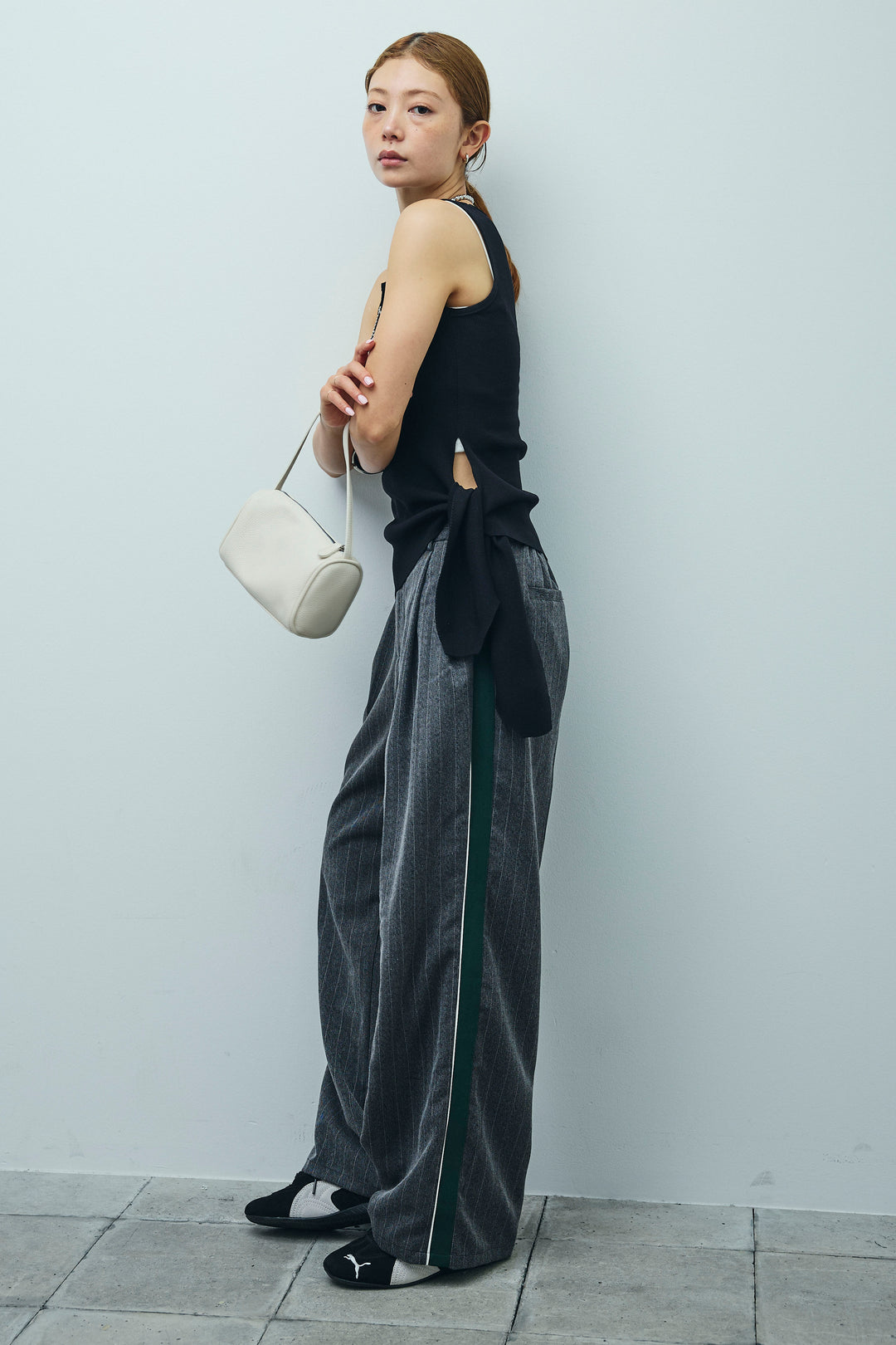 [予約/SET]サイドリボンニットタンク+ピンストライプサイドラインワイドパンツ(2set)