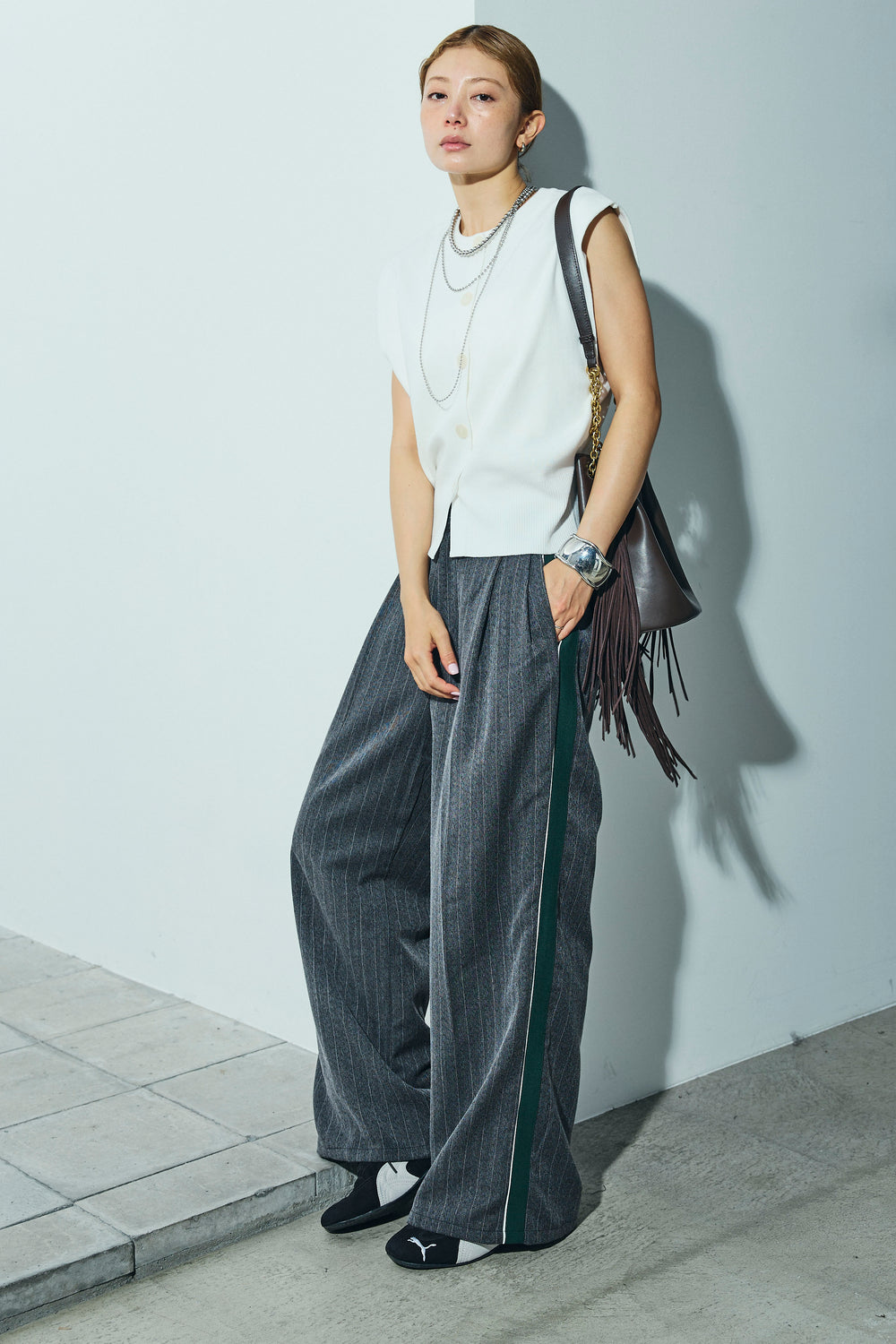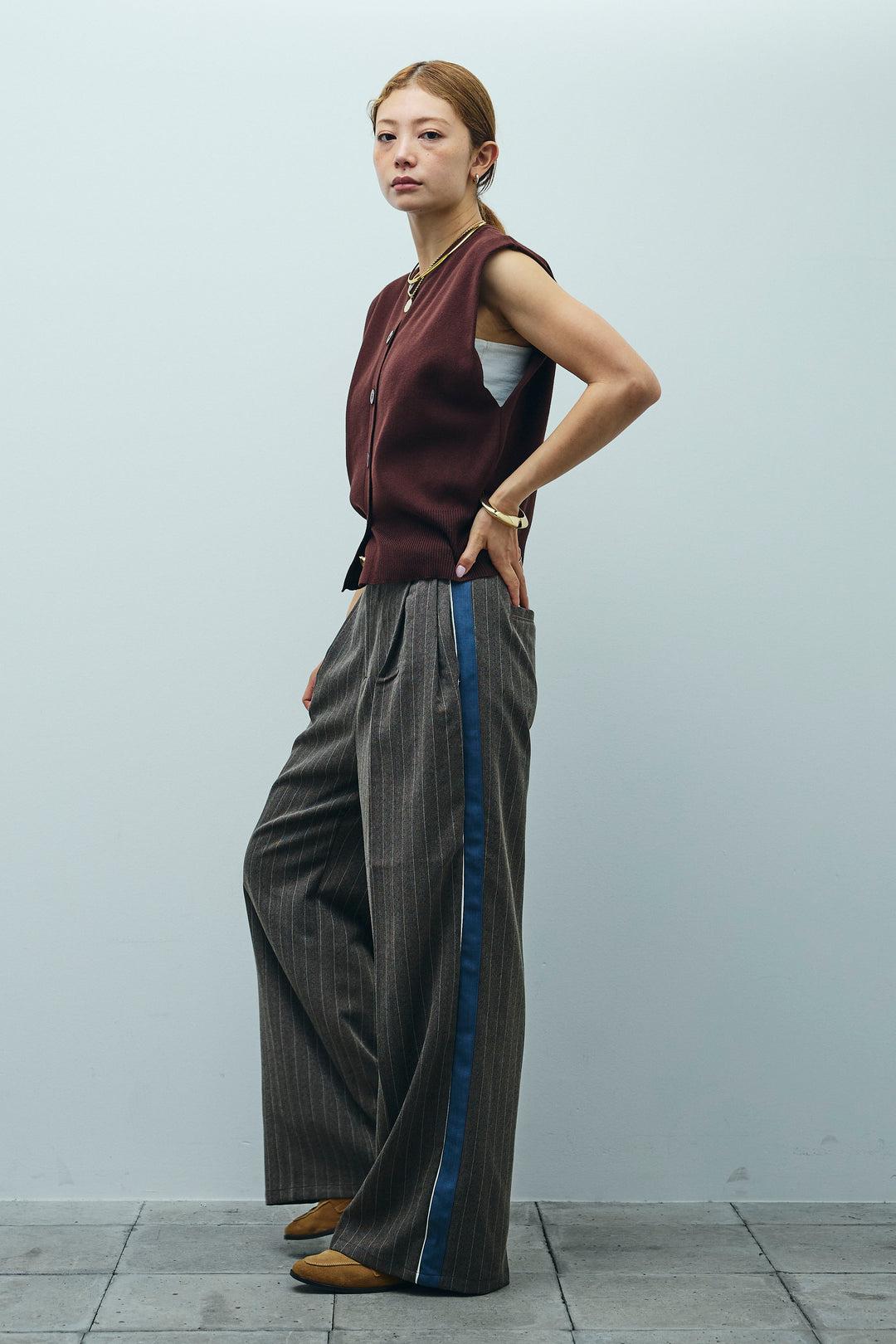 [予約/SET]ボクシーニットベスト+ピンストライプサイドラインワイドパンツ(2set)