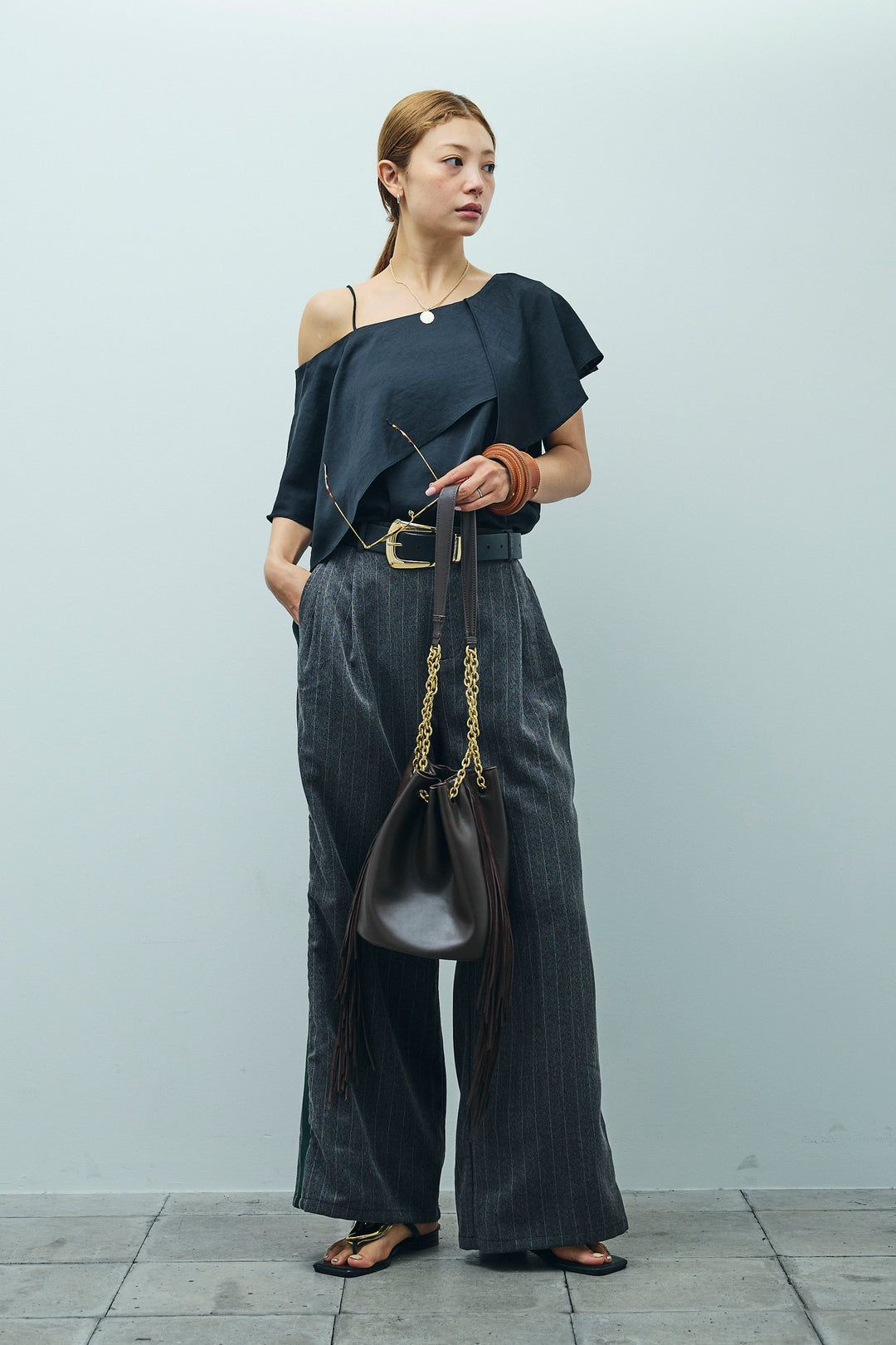 [予約/SET]アシメブラウス+ピンストライプサイドラインワイドパンツ(2set)