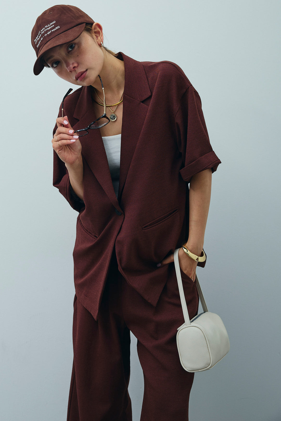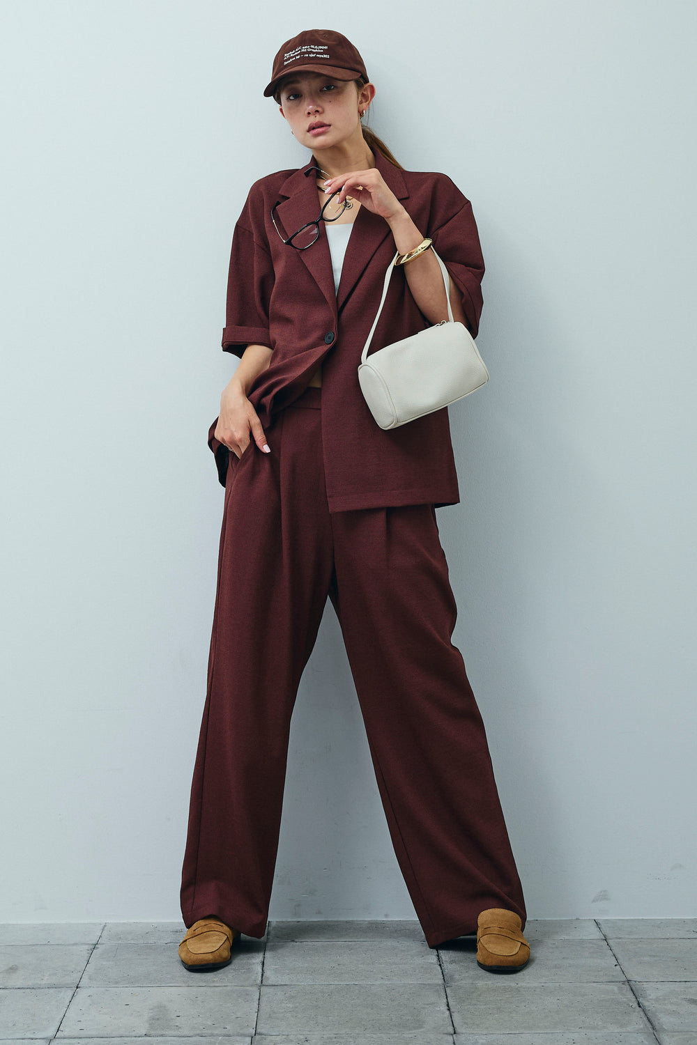 [予約/SET]サマースラブツイードハーフスリーブテーラードジャケット+サマースラブツイードタック入りワイドパンツ(2set)