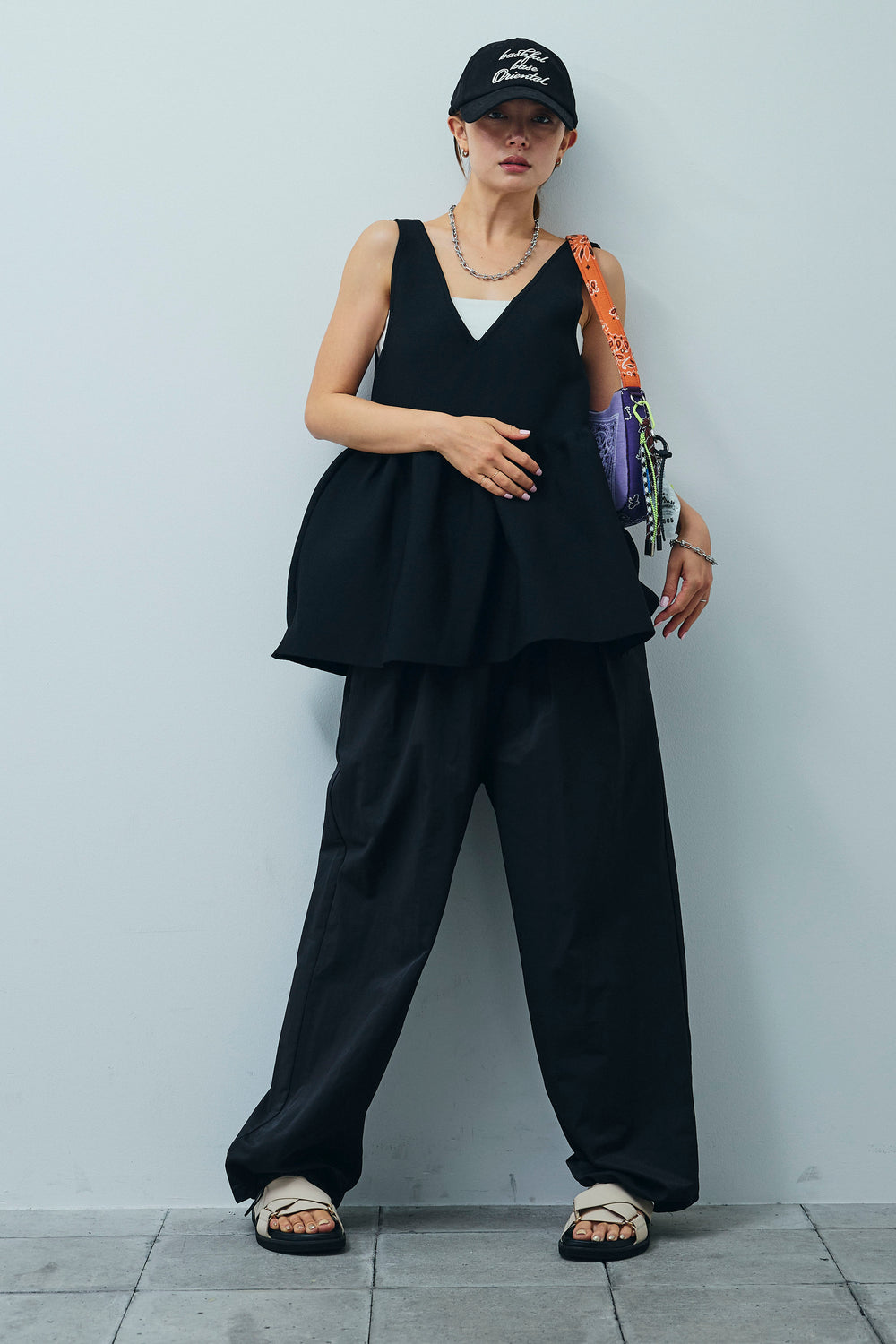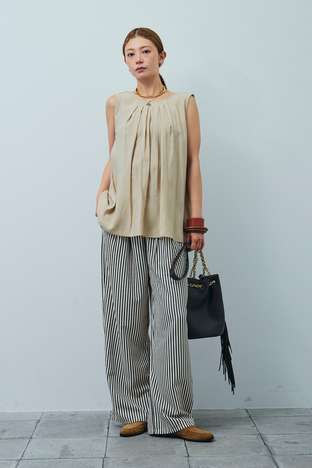 [予約/SET]アシンメトリーフレアーノースリーブブラウス+デザインタックパンツ(2set)
