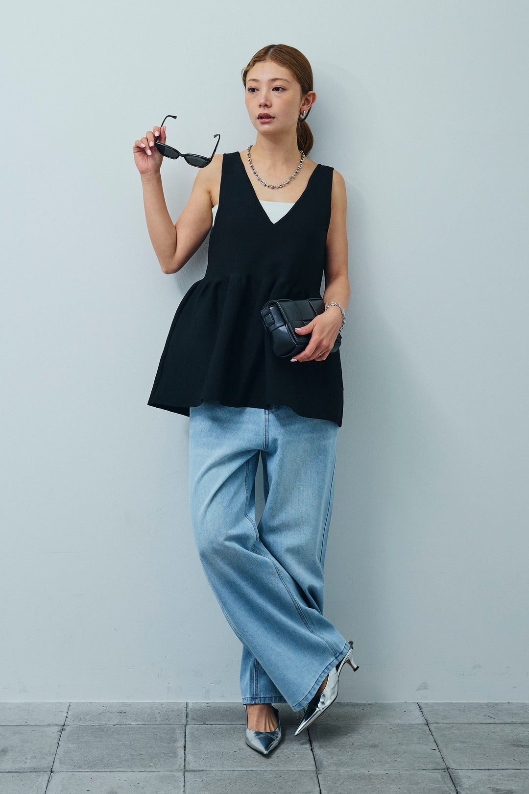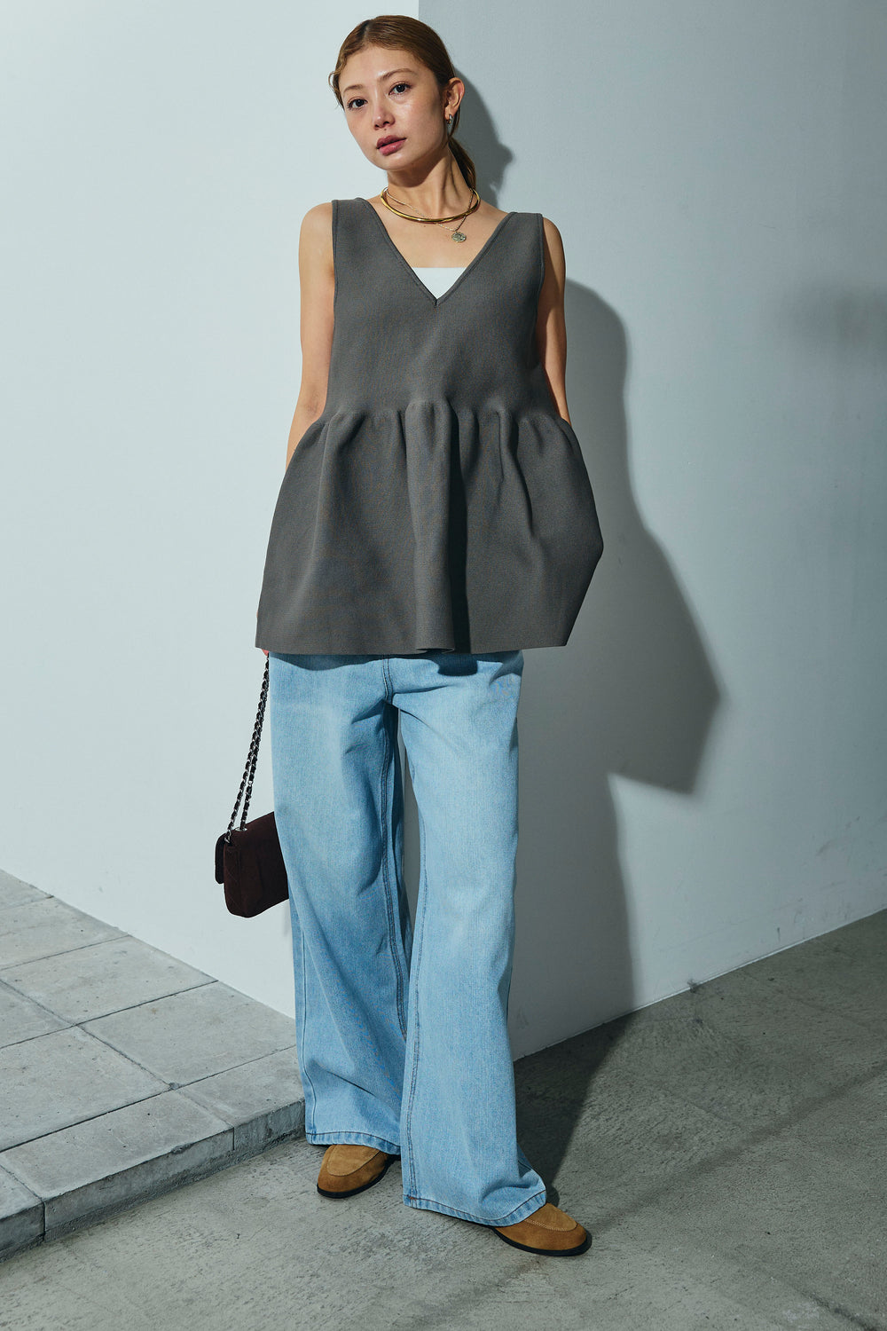 [予約/SET]2wayぺプラムニットトップス+デニムルーズポケットパンツ(2set)