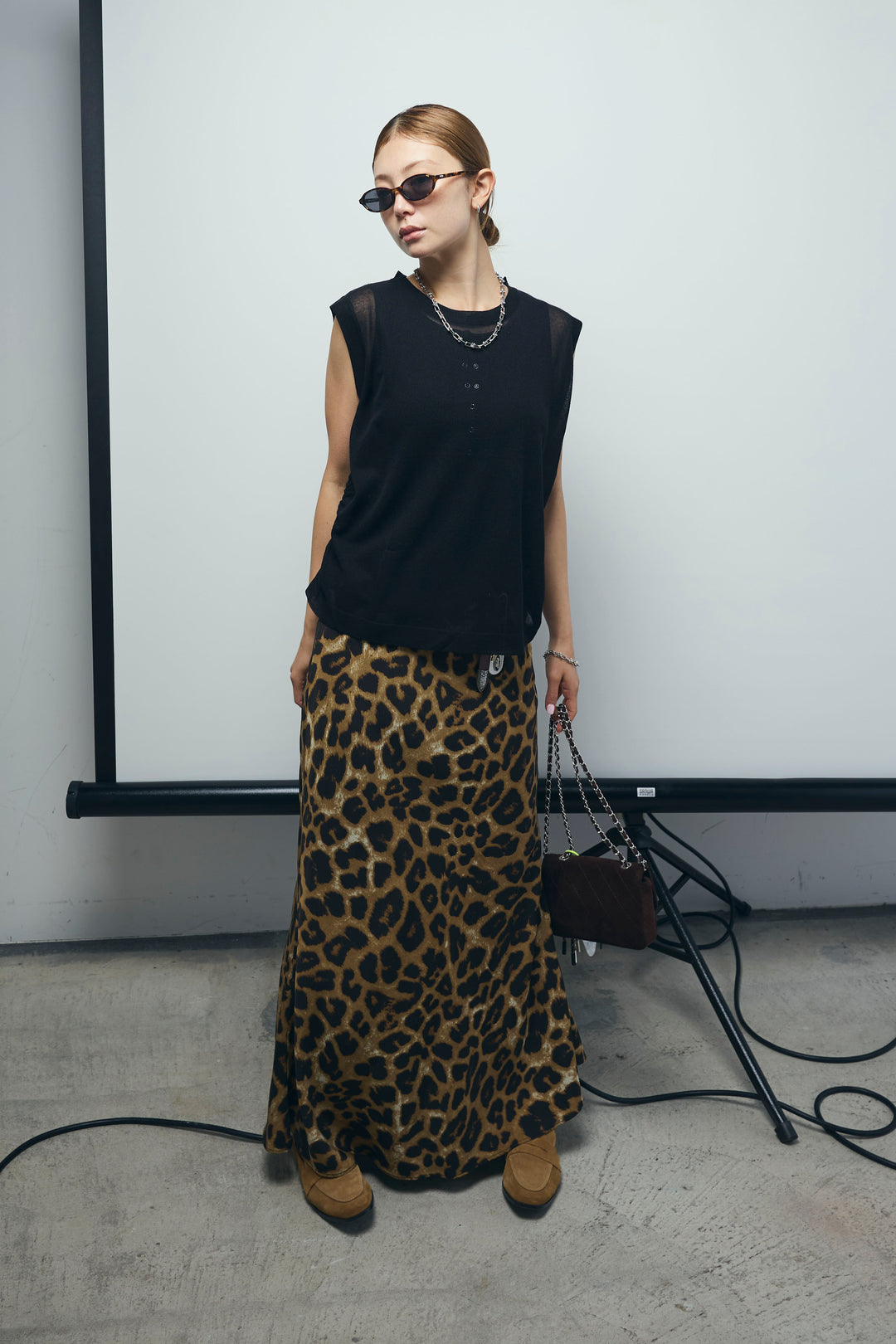 [予約/SET]リネン混ギャザーシアーニット+セルフカットリブヘンリーネックノースリーブトップス+レオパードナロースカート(3set)