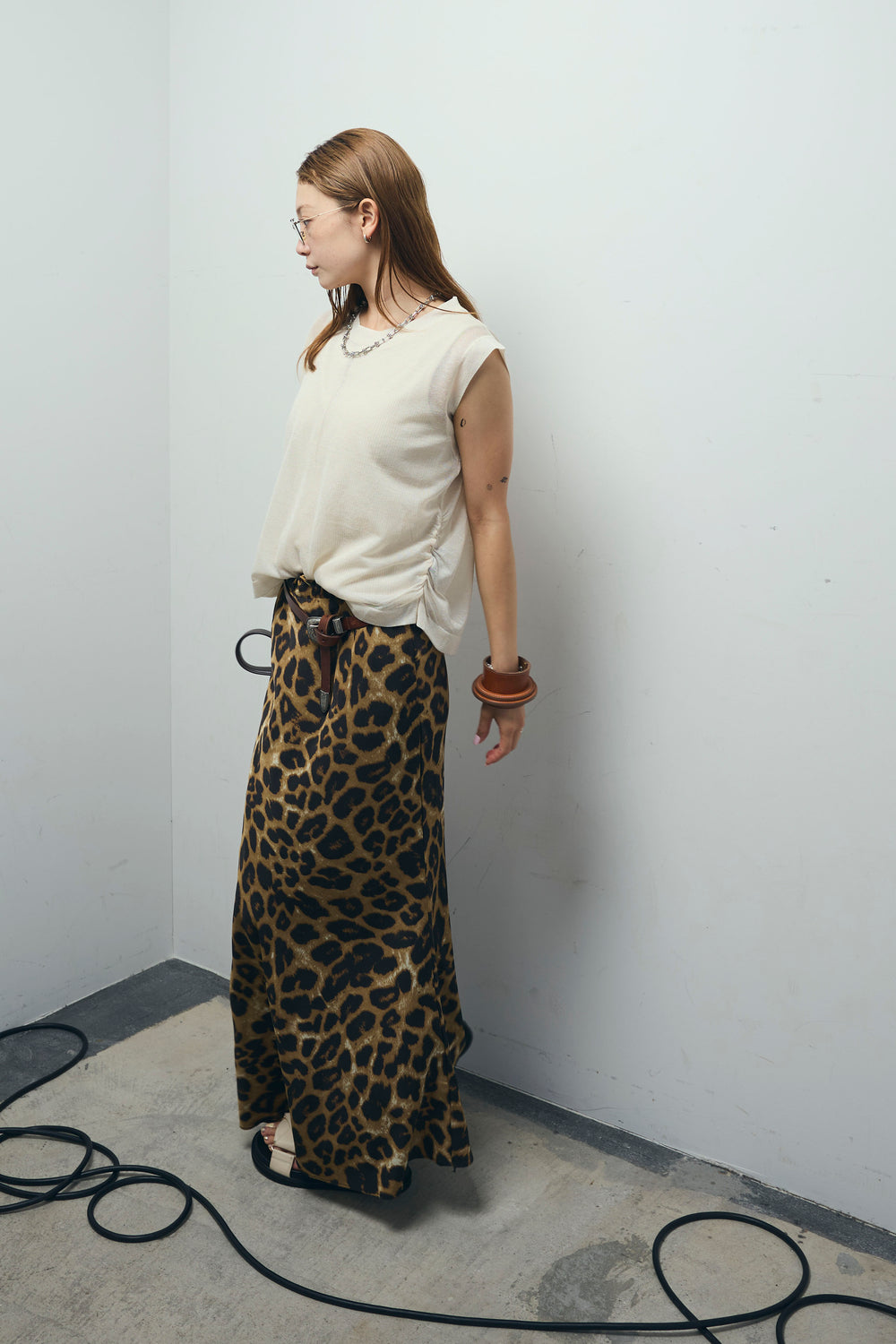 [予約/SET]サイドシャーリングレイヤードTシャツ+レオパードナロースカート(2set)