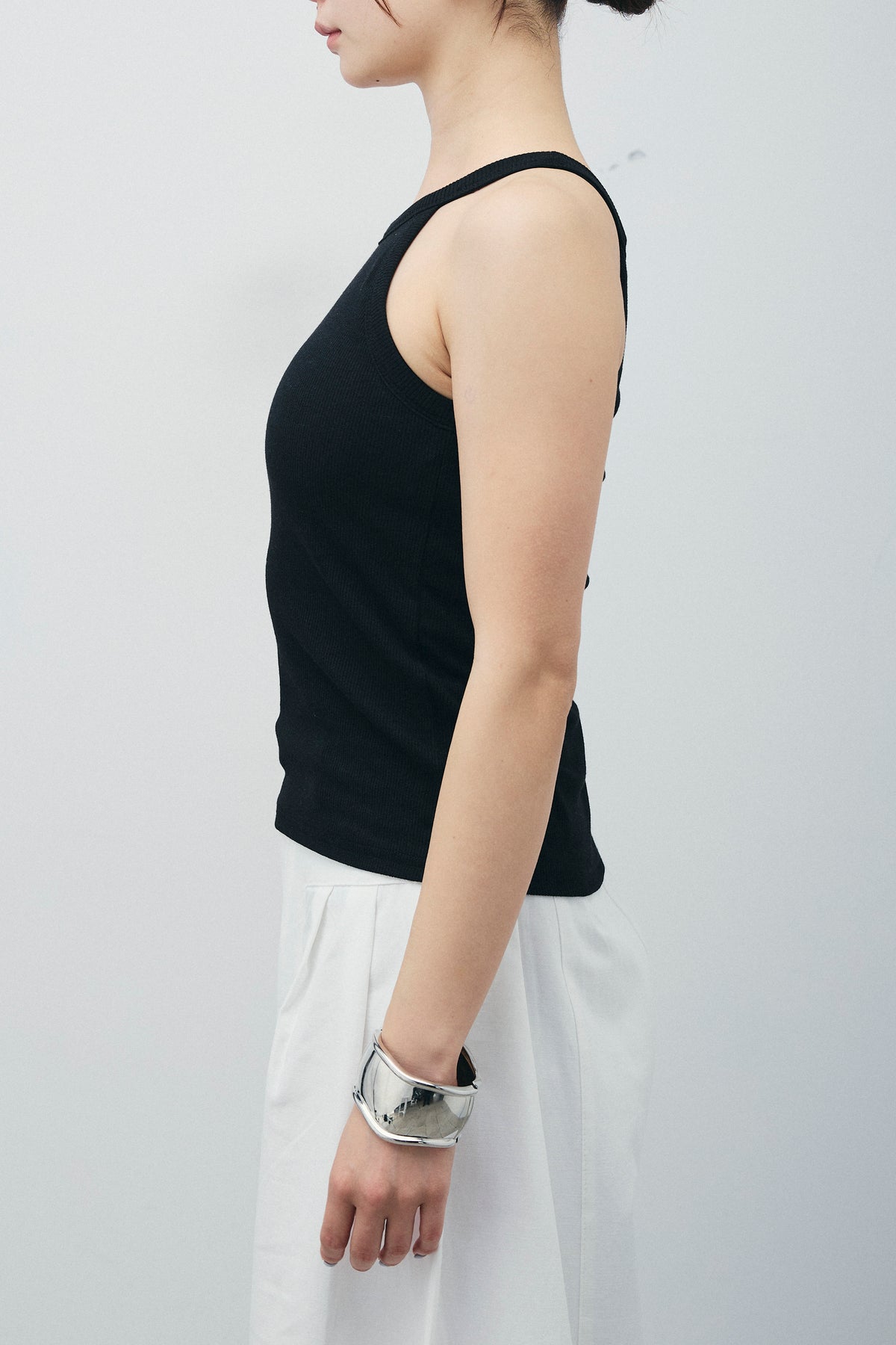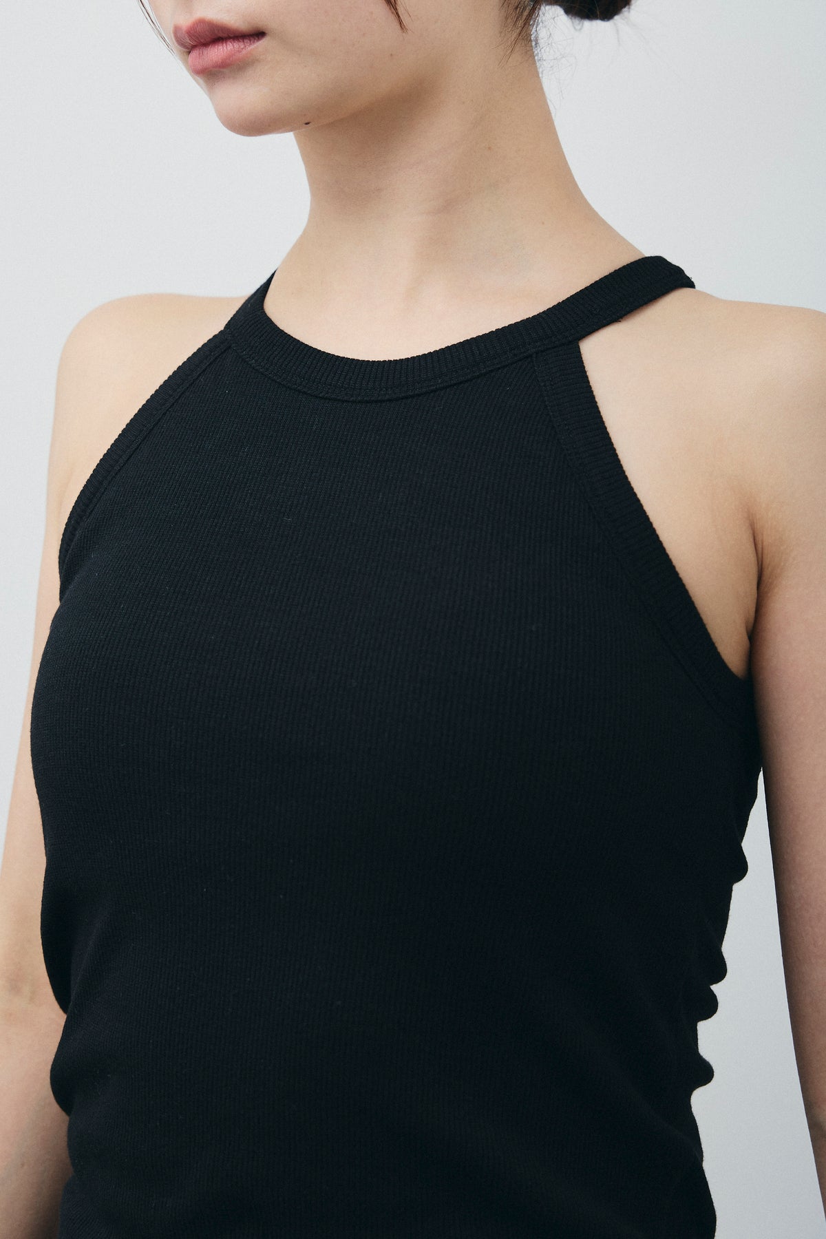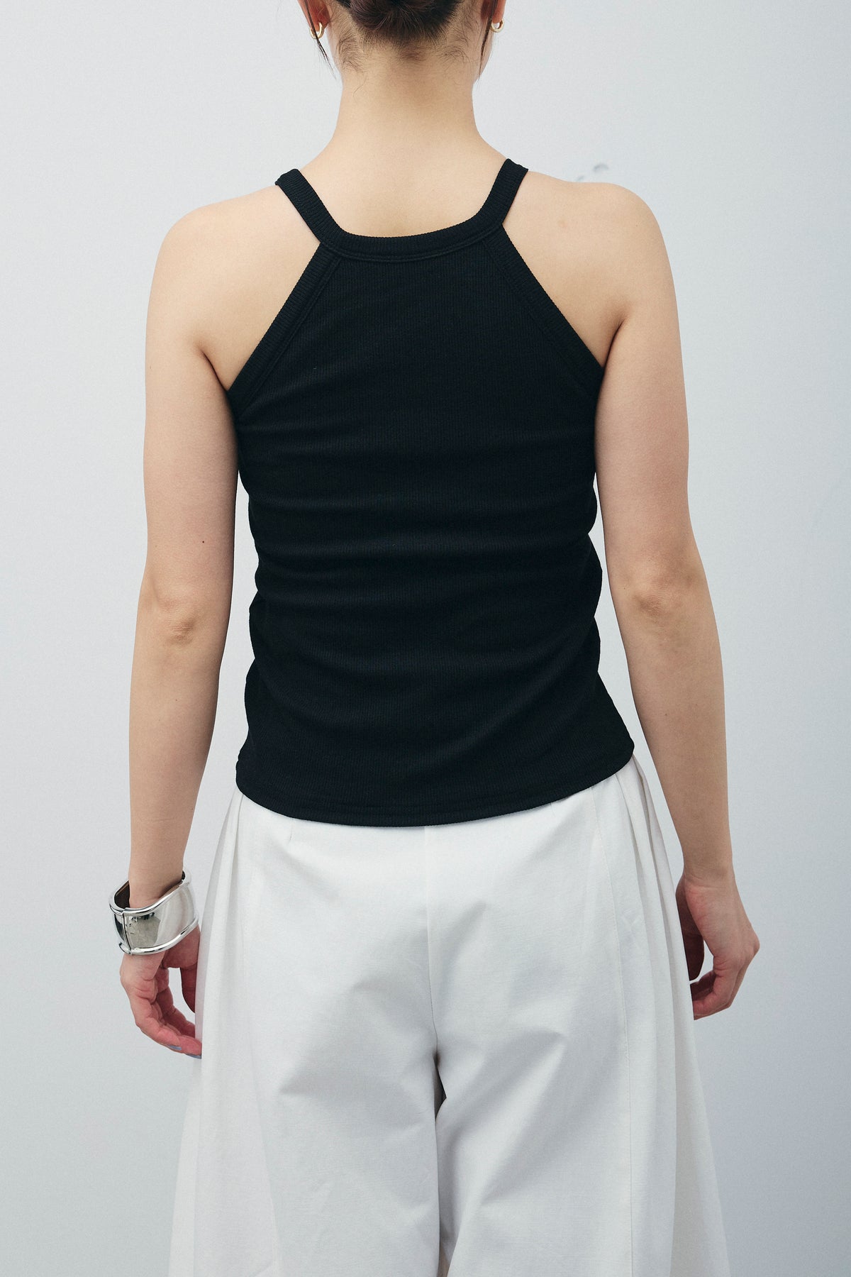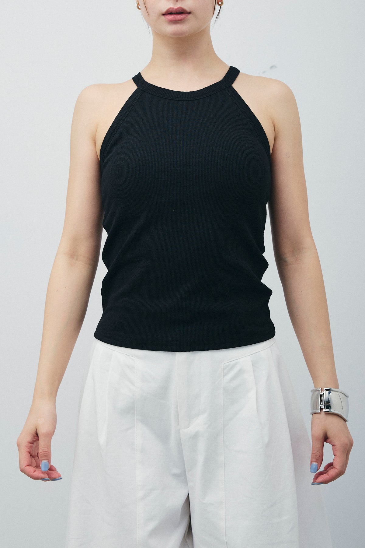 1枚で着映えるヘルシーなホルターネックタンク。 程よくボディラインにフィットするリブ素材で、シンプルながらも美しいシルエットを実現。内蔵カップ付きなのでインナー不要で着られ、デイリーにもリゾートにもマッチします。ジャケットやシアーシャツのインナーとしても活躍する万能アイテムです。