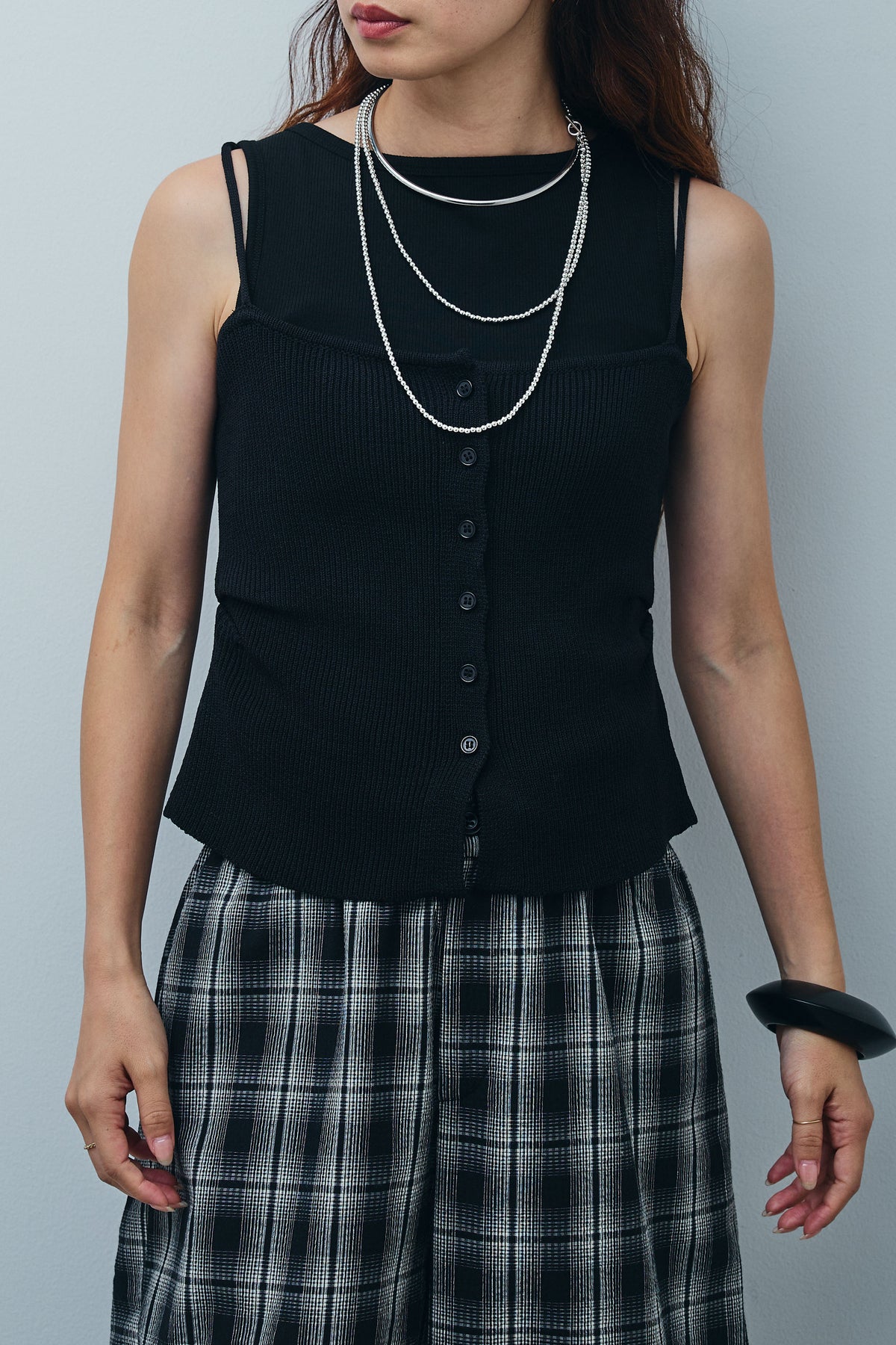 華奢なストラップとフロントボタンがアクセントになったリネンライクリブニットキャミ。すっきりとしたネックラインと、程よくフィットするシルエットが女性らしさを引き立てます。リネンライクなさらっとした質感で、暑い季節も快適な着心地。1枚ではもちろん、シャツやジャケットのインナーとしても活躍する、着回し力の高い一着です。カジュアルにもキレイめにも使える万能アイテム。