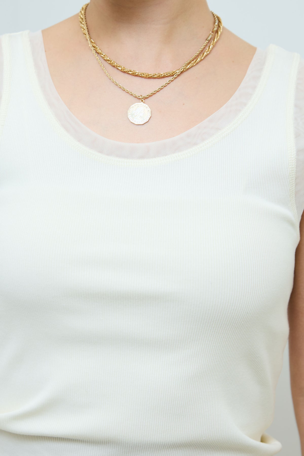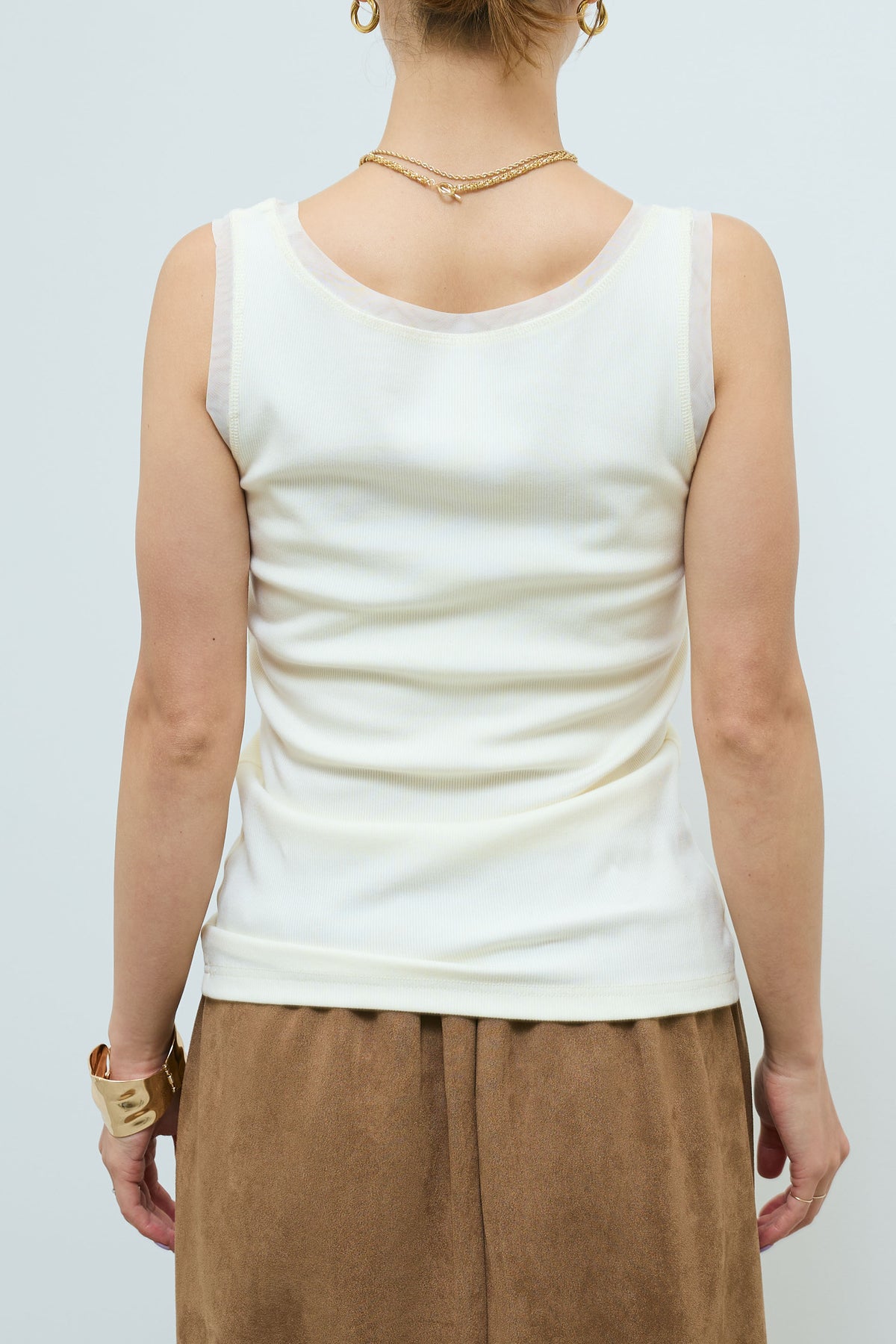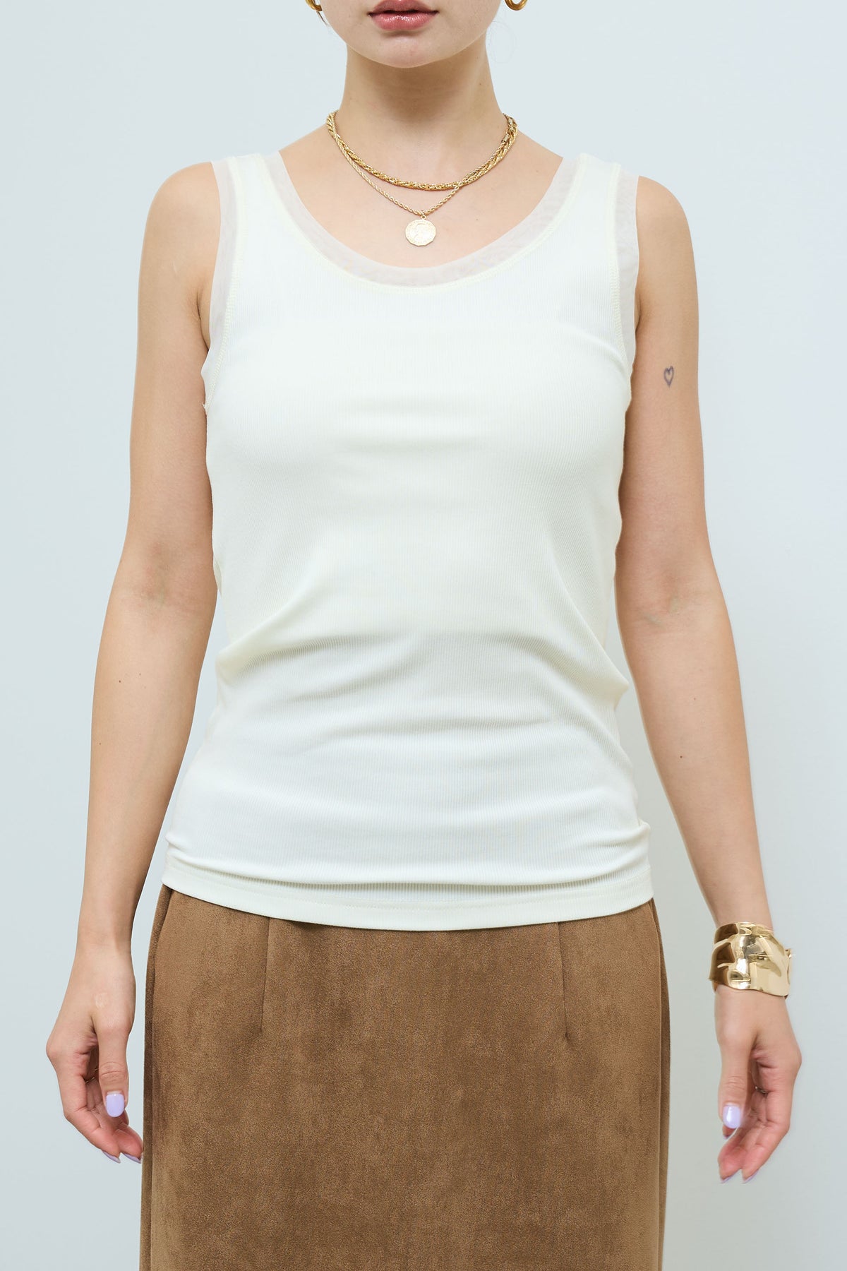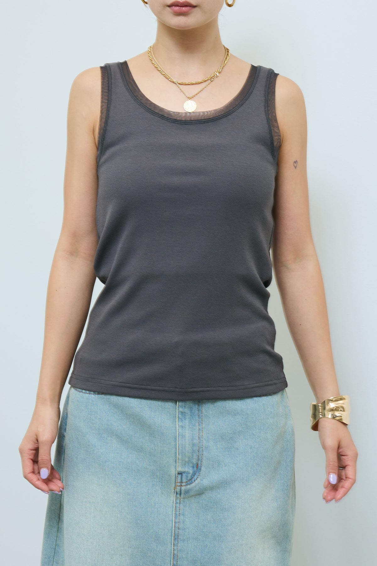 首元とアームホールにシアー素材を配した、ほんのりモードなタンクトップ。程よくフィットするリブカットソー生地が、身体のラインを美しく見せつつ快適な着心地を実現します。一枚でもインナーとしても使いやすく、レイヤードのアクセントにぴったりなアイテムです。