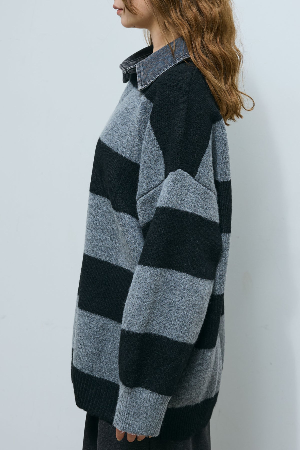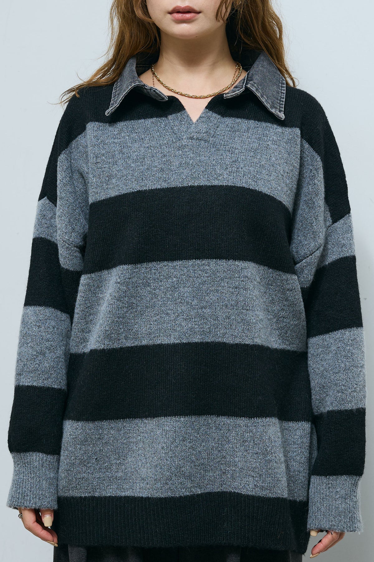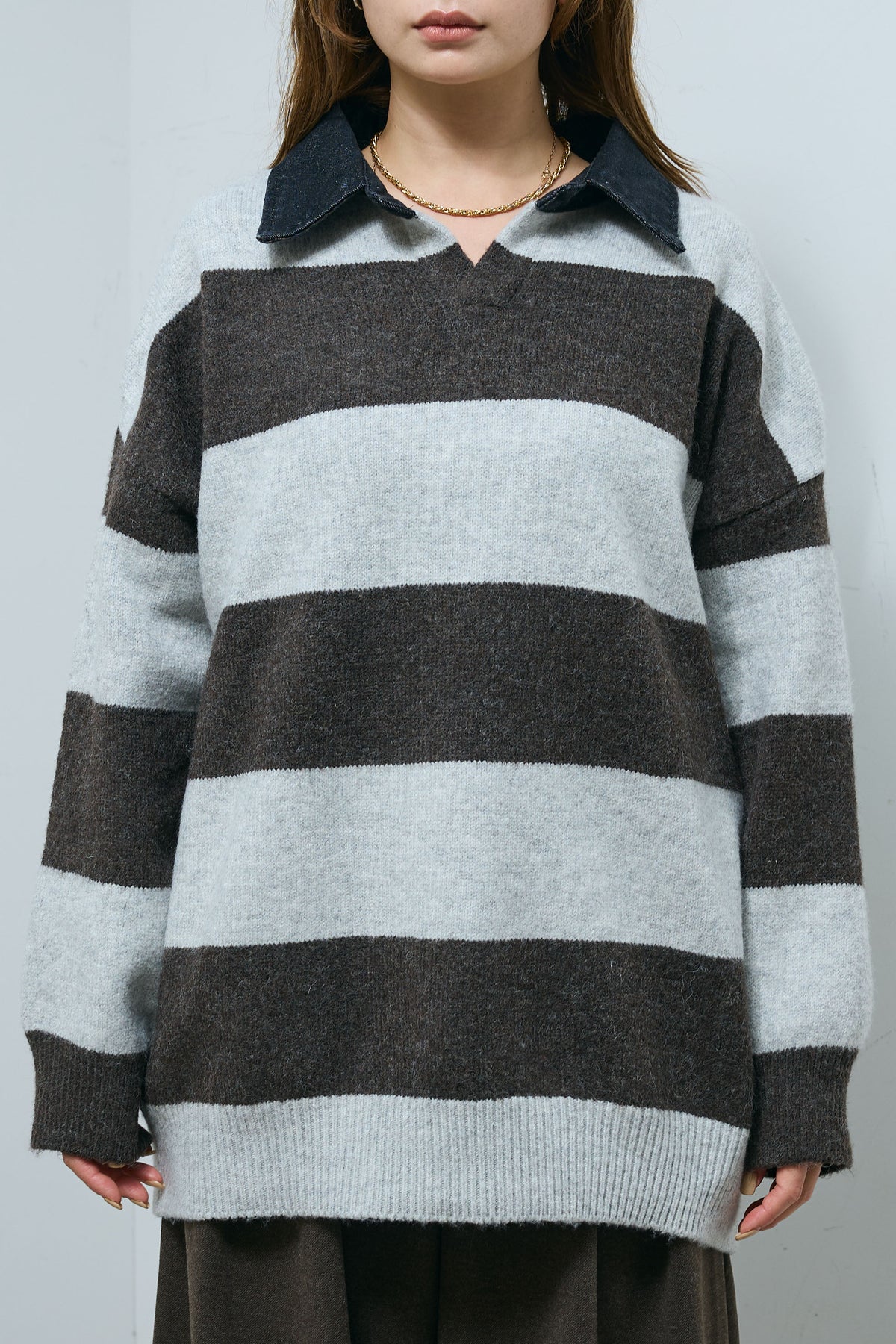 大胆なボーダー柄が印象的なラガーニットプルオーバー。デニム素材の襟がアクセントとなり、カジュアルながらも洗練された雰囲気に仕上げています。ゆったりとしたシルエットでリラックス感があり、シャツやタートルとのレイヤードもおすすめ。1枚で存在感のあるスタイリングが完成します。