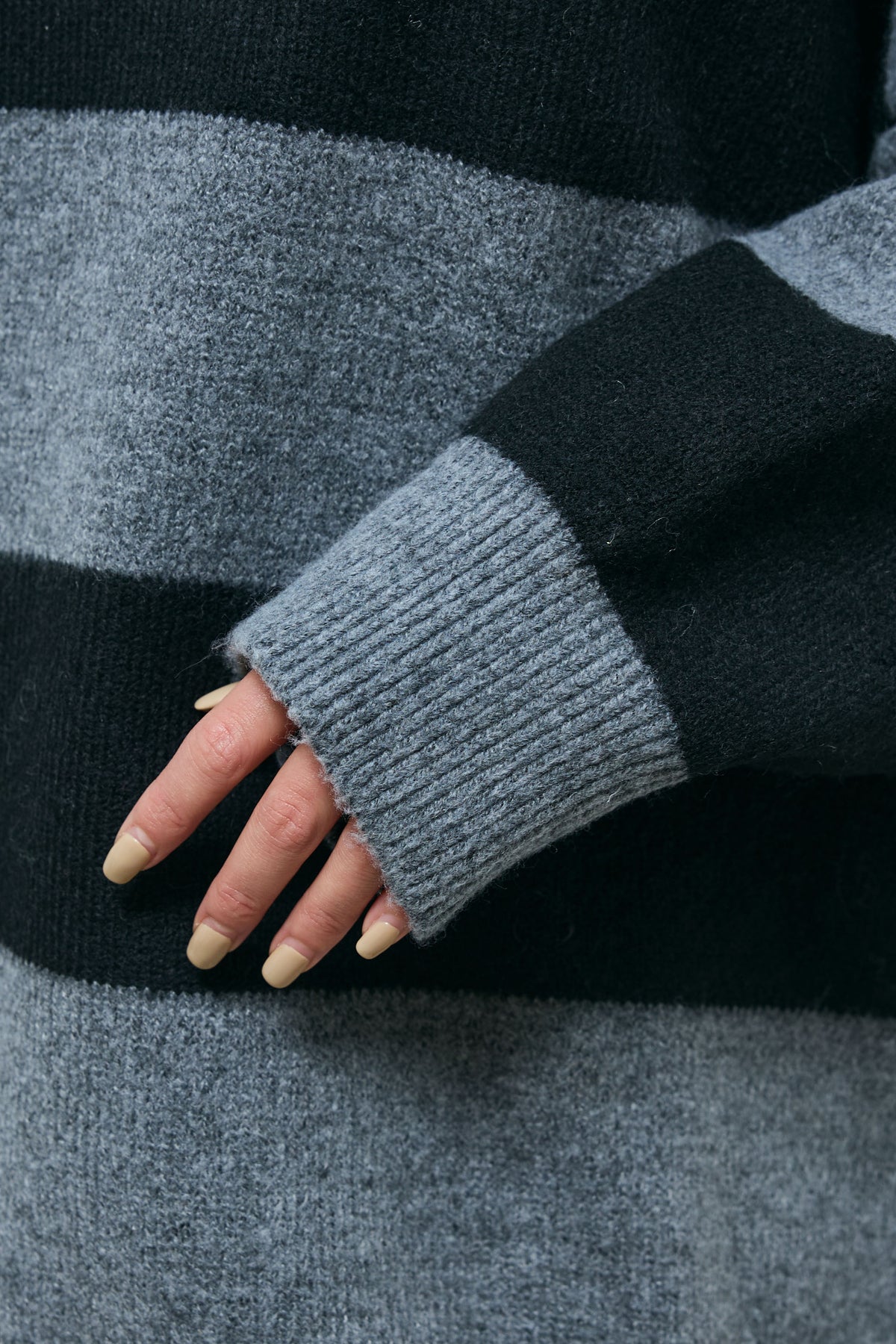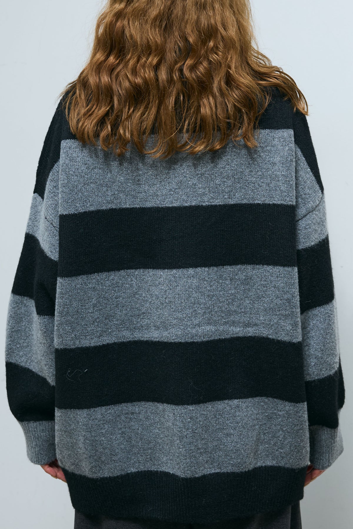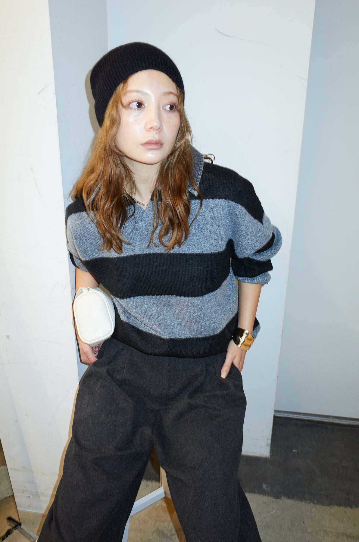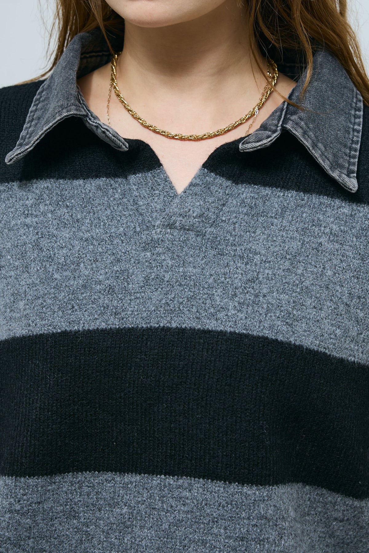 大胆なボーダー柄が印象的なラガーニットプルオーバー。デニム素材の襟がアクセントとなり、カジュアルながらも洗練された雰囲気に仕上げています。ゆったりとしたシルエットでリラックス感があり、シャツやタートルとのレイヤードもおすすめ。1枚で存在感のあるスタイリングが完成します。