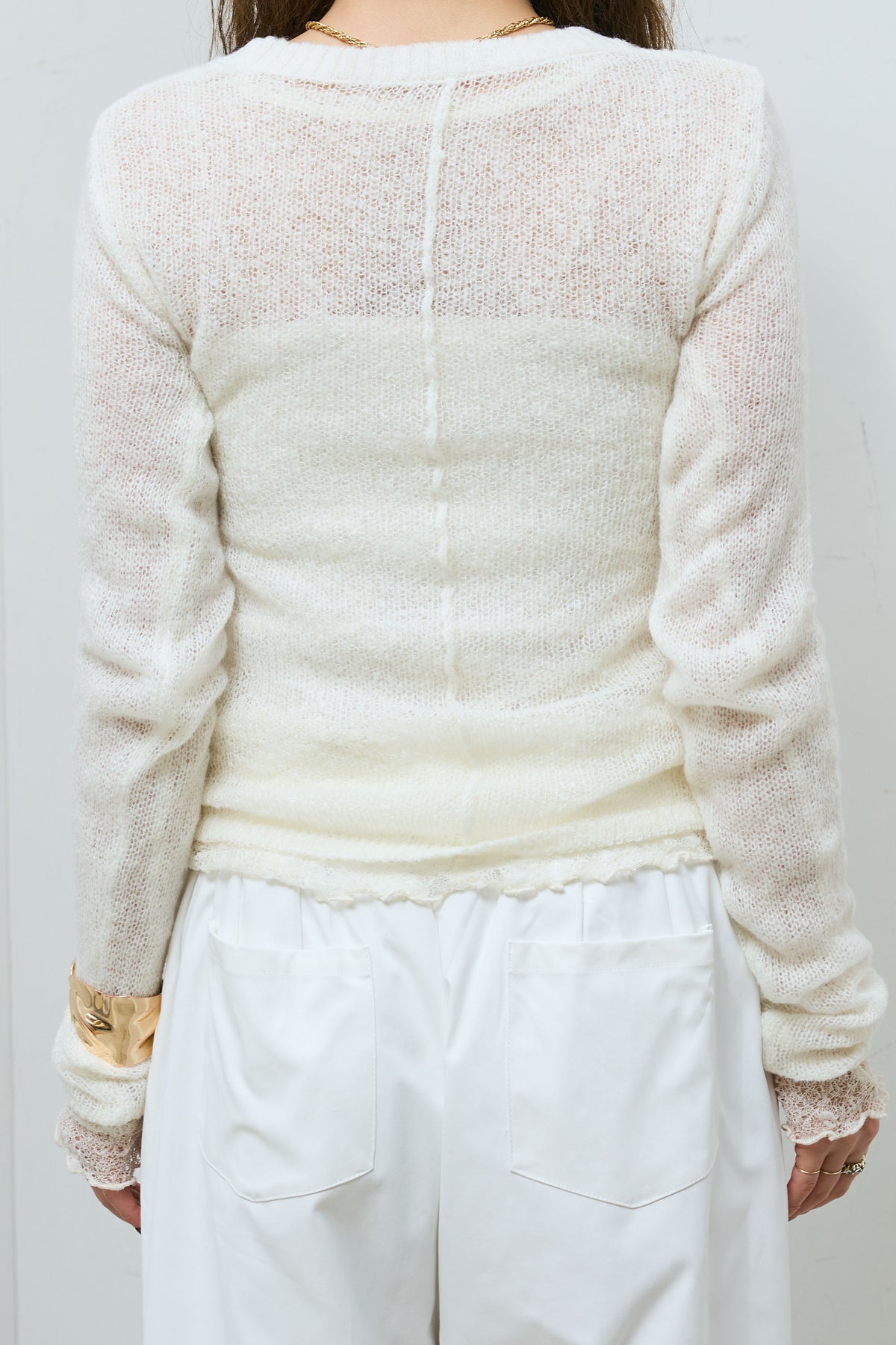モヘア混の軽やかな糸で編み立てたシアーニット。センターに施したリンキングが縦ラインを際立たせ、すっきりとした印象に導きます。程よい透け感がレイヤードを引き立て、インナー次第で表情が変化。フィットしすぎないシルエットで着心地も良く、デニムからきれいめボトムまで幅広く合わせやすい一枚です。
