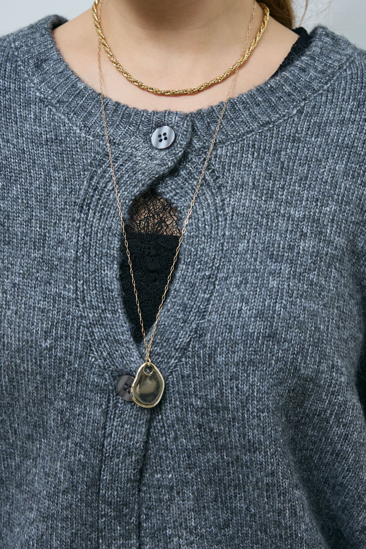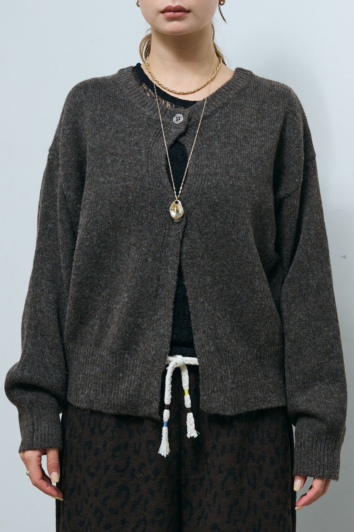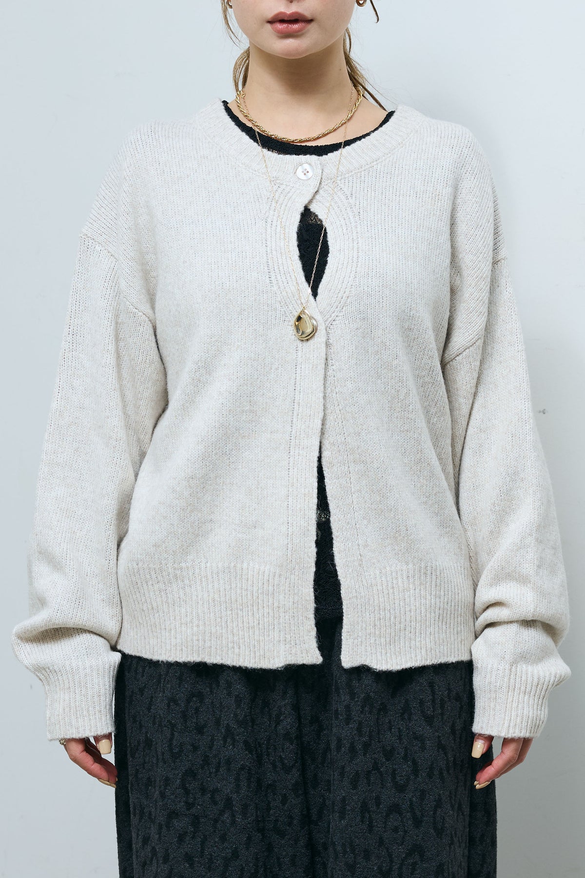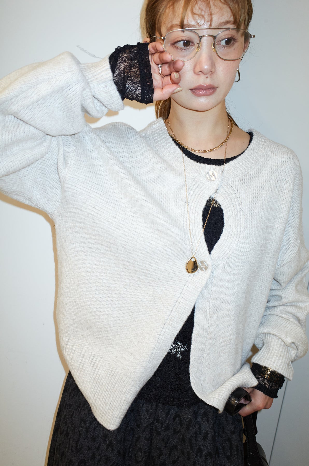 フロントのホールデザインが目を惹く2wayニット。ボタンを留めてプルオーバー風にも、開けてカーディガンとしても着用できるデザイン性の高い一枚。柔らかなニット素材で肌あたりが良く、短めの丈感がボトムスとのバランスを取りやすい仕上がりです。シンプルながらもモードな印象をプラスするアイテム。