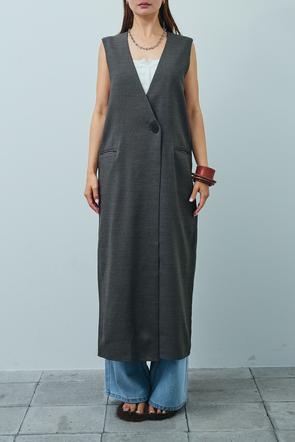 1枚でクールな印象を叶える、Vネックのロングワンピース。リネンタッチ素材の軽やかさが涼しげで、ロング丈でも重く見えずにスマートな印象に。深めのVネックとボタンのディテールが、マニッシュなエッセンスを引き立てます。レイヤードにも適しており、インナー次第で季節問わず着回しが可能。モードなムードと着心地の良さを兼ね備えた一着です。