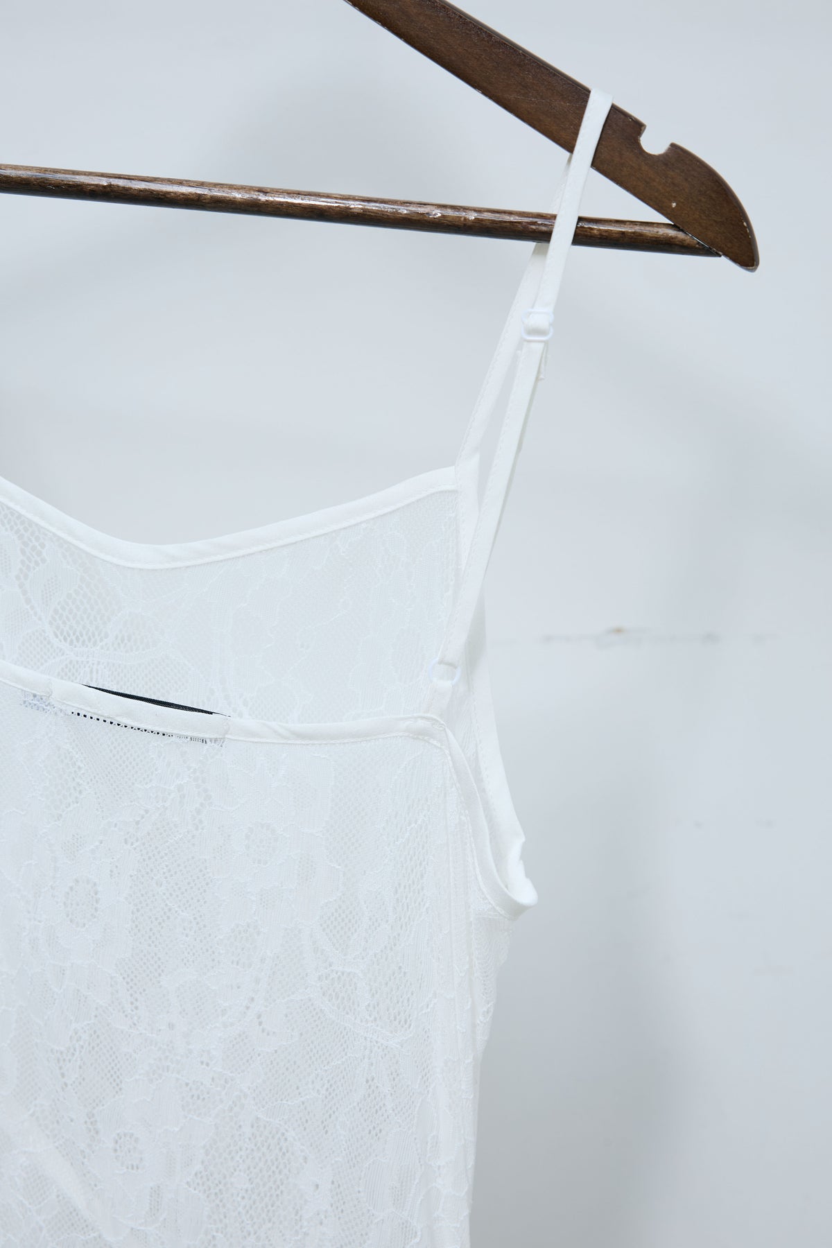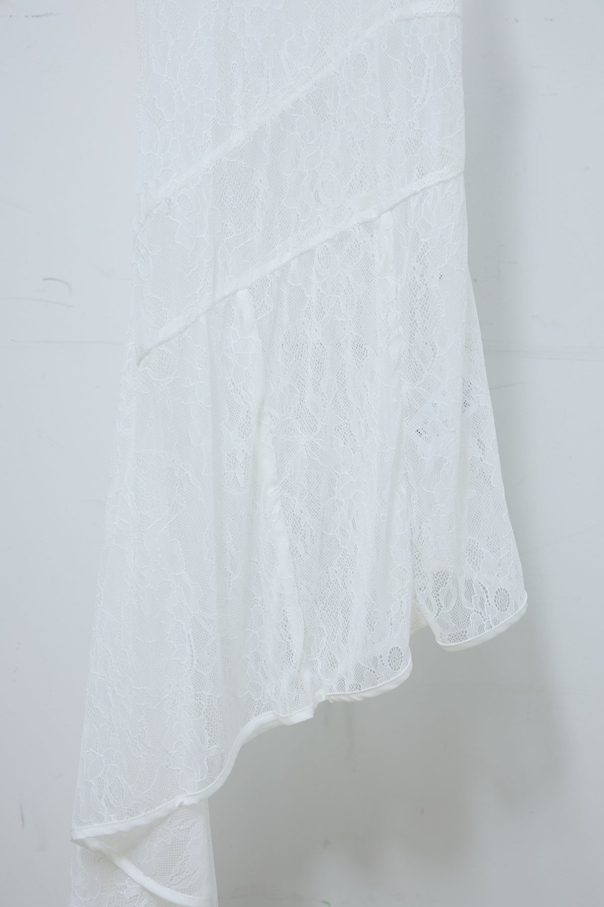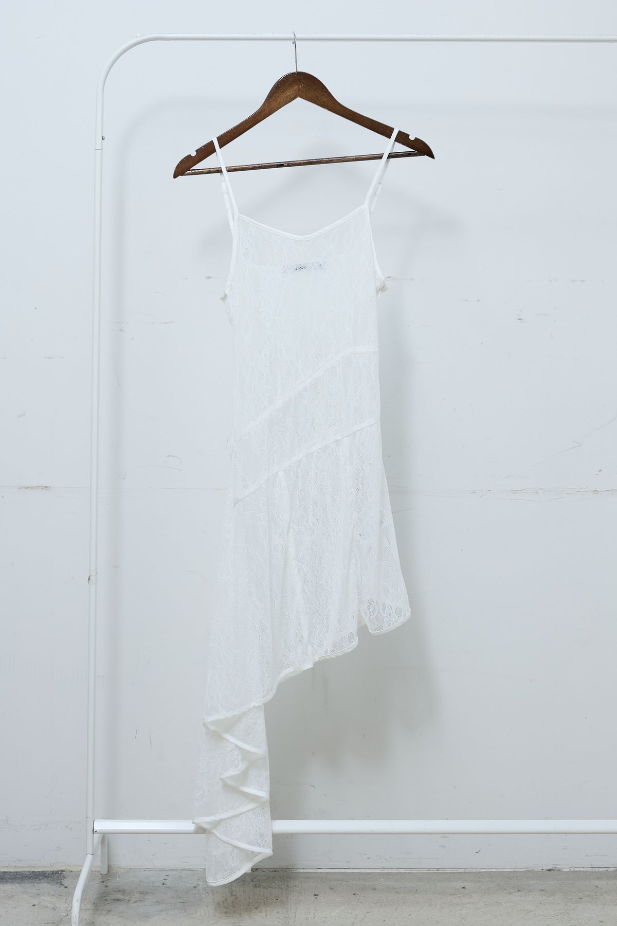繊細なレースとアシンメトリーなカッティングが印象的なワンピース。さらりと重ねるだけで抜け感のあるスタイリングが完成し、レイヤード次第で表情を変えられる万能アイテムです。片側に流れるドレープが軽やかさと動きをプラスし、パンツとのコーディネートも好相性。ロングシーズン着回せるデザイン性の高い一着です。