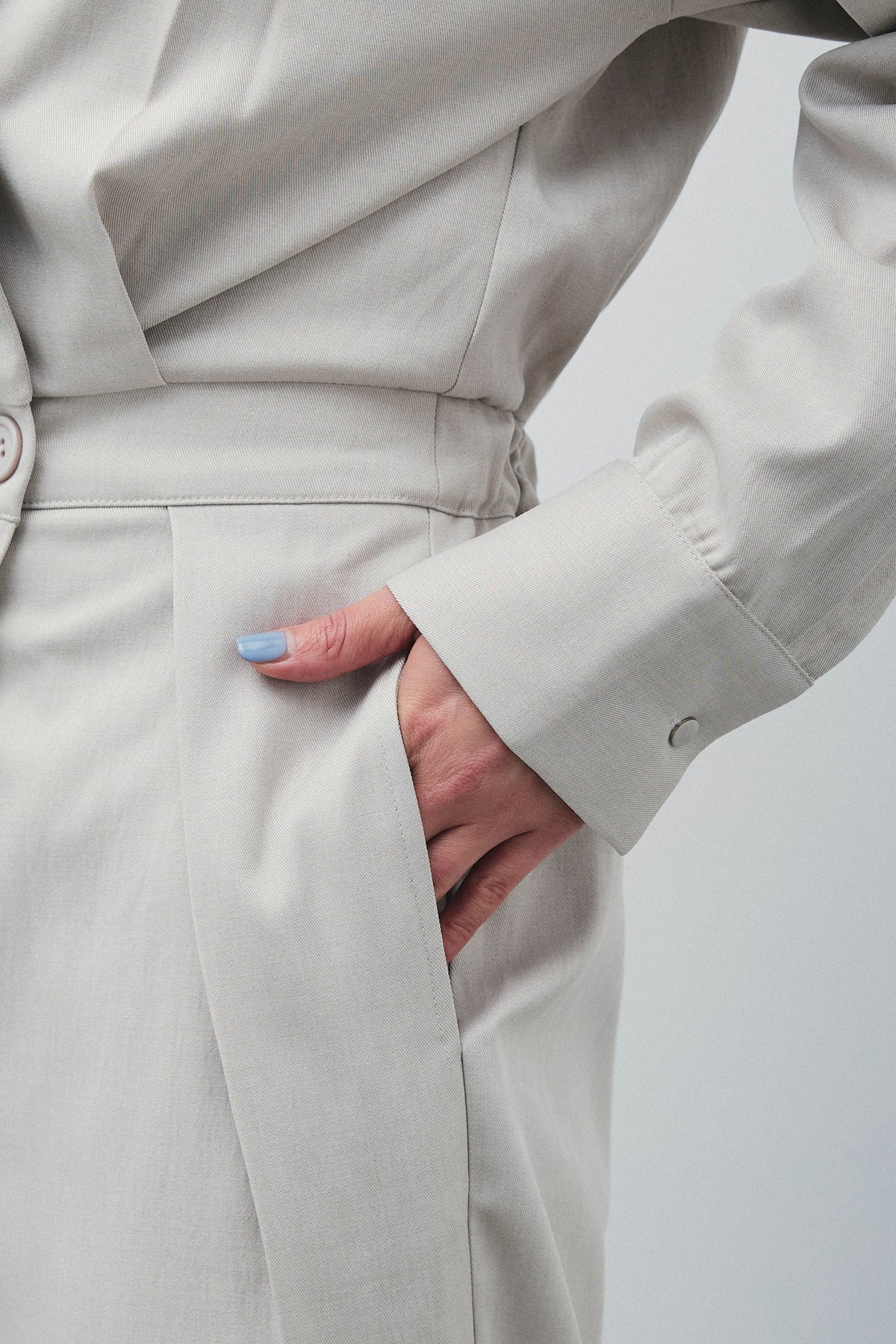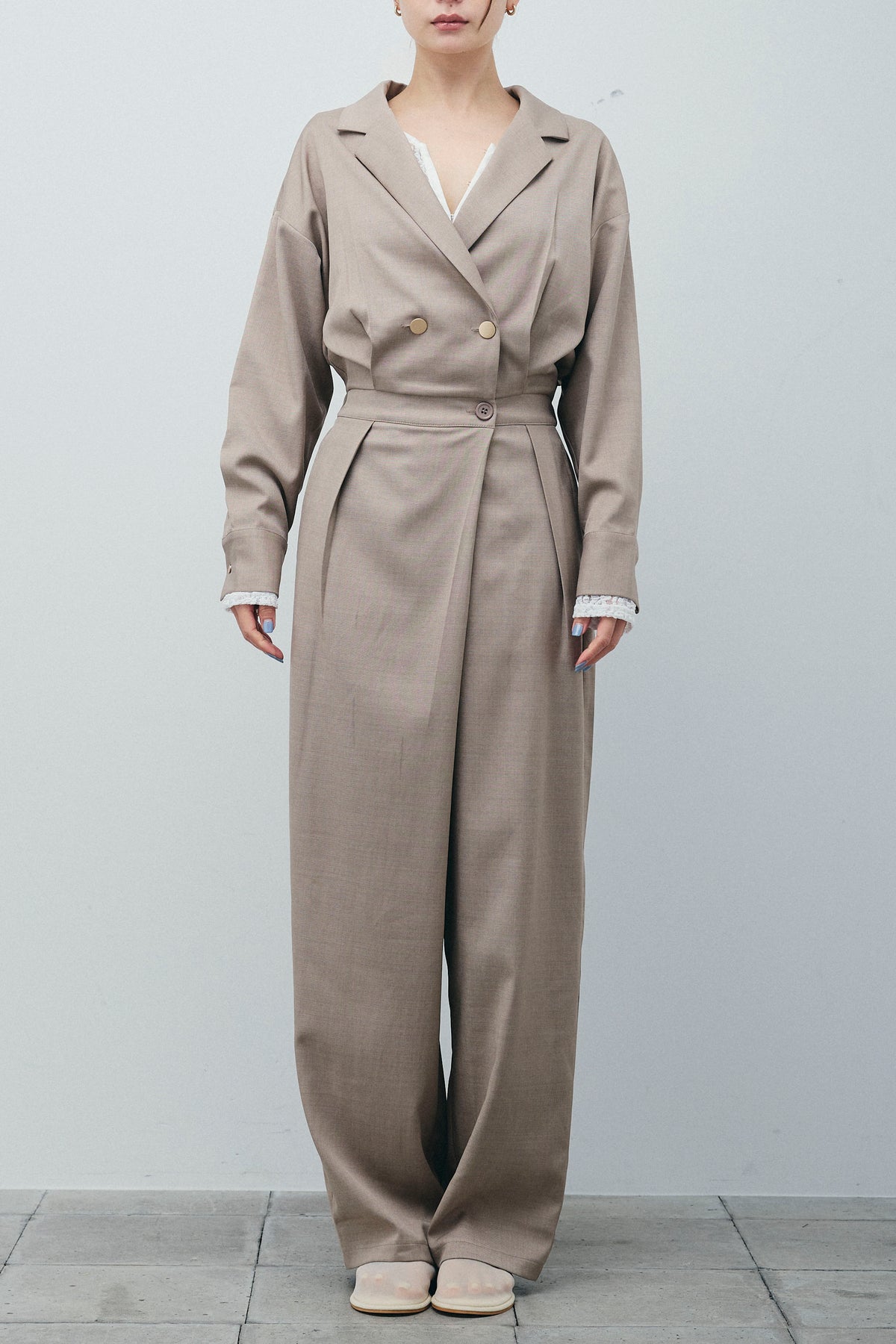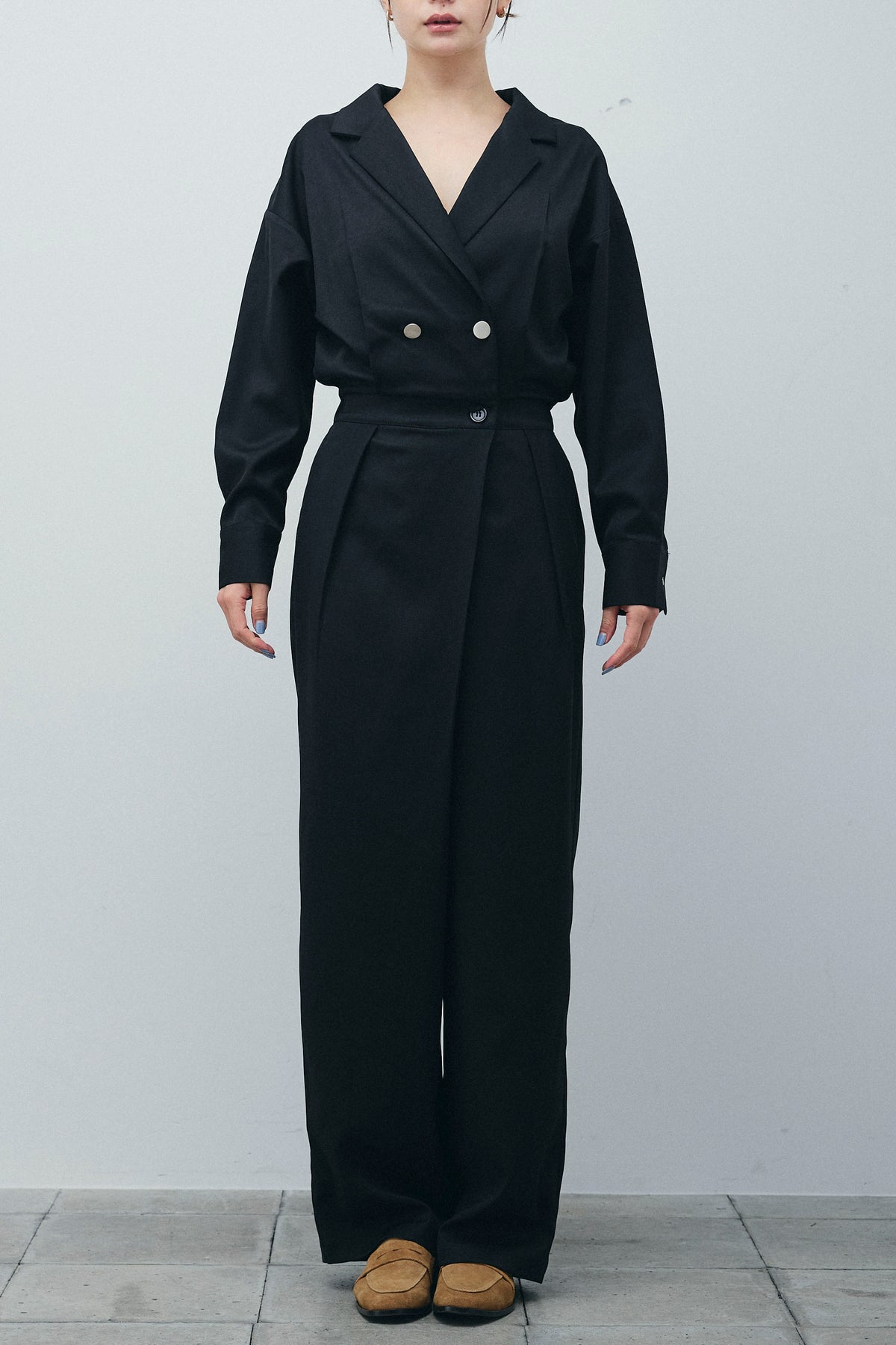 デザイン性と機能性を兼ね備えたオールインワン。テーラードジャケットのようなクールなカラーと、ゆったりとしたシルエットが特徴的で、リラックス感とエレガントさを絶妙に融合させています。どんなシーンでも映えるスタイルに仕上げられており、簡単に上品なコーディネートが完成します。