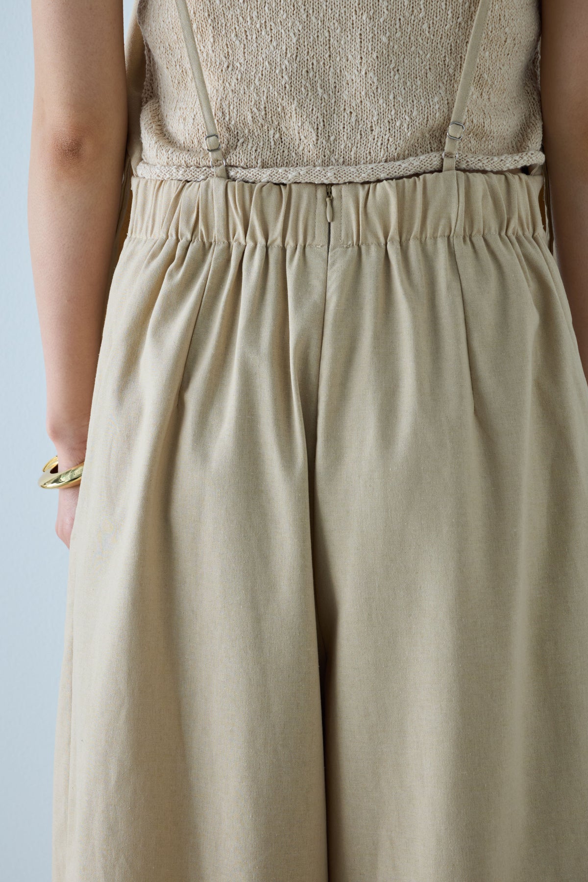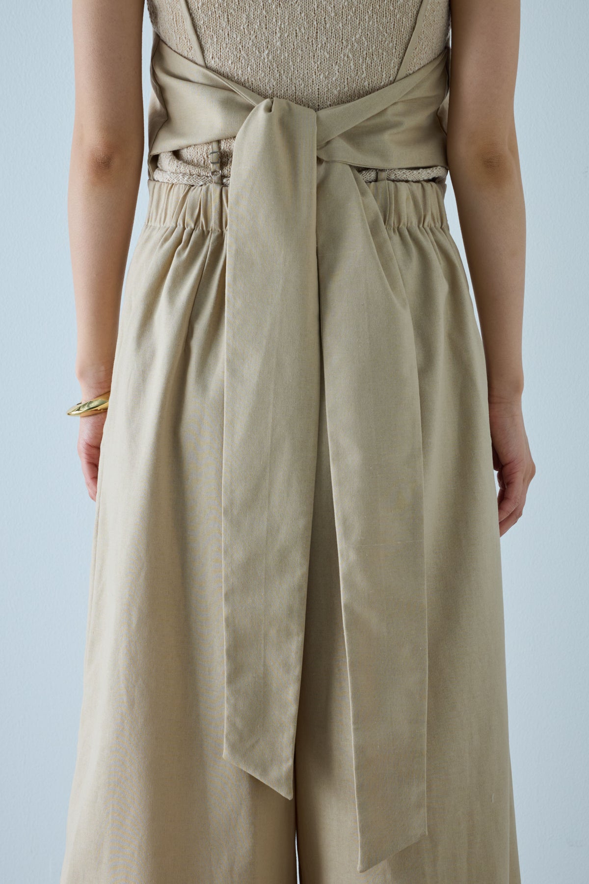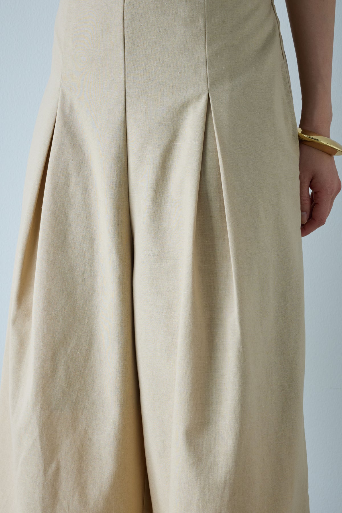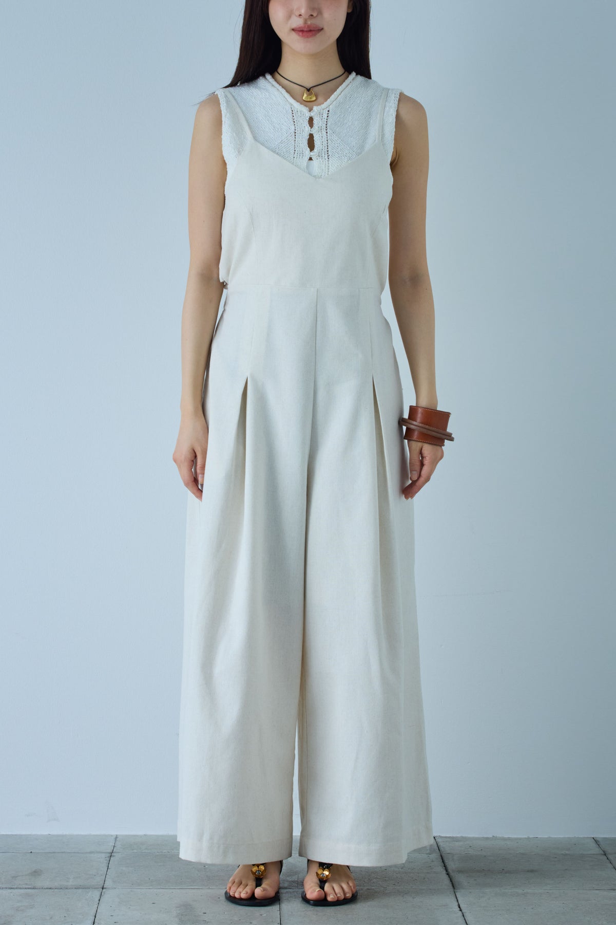 軽やかなリネン素材を使ったナチュラルで涼しげなアイテム。フロントのタックデザインがボリューム感を程よくプラスし、リラックス感のあるシルエットが特徴です。キャミソールタイプのトップ部分には編み模様が施されており、シンプルながらもアクセントに。ゆったりとしたフィット感で、リラックスした着心地を提供します。カジュアルにもきれいめにも使える万能な一枚です。