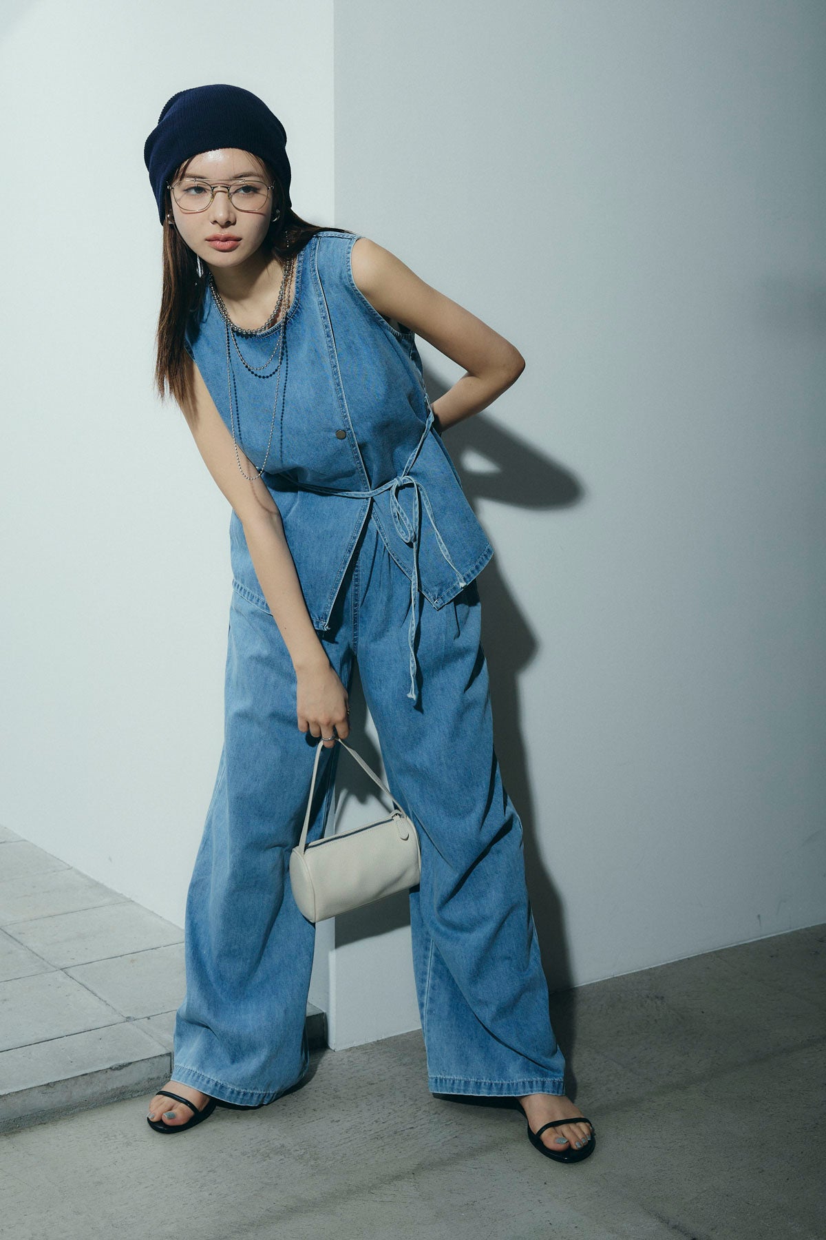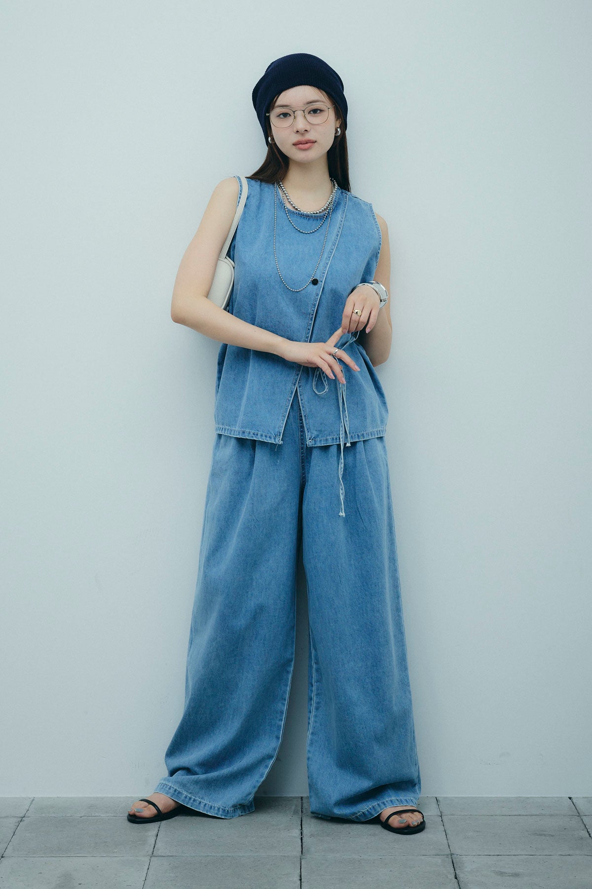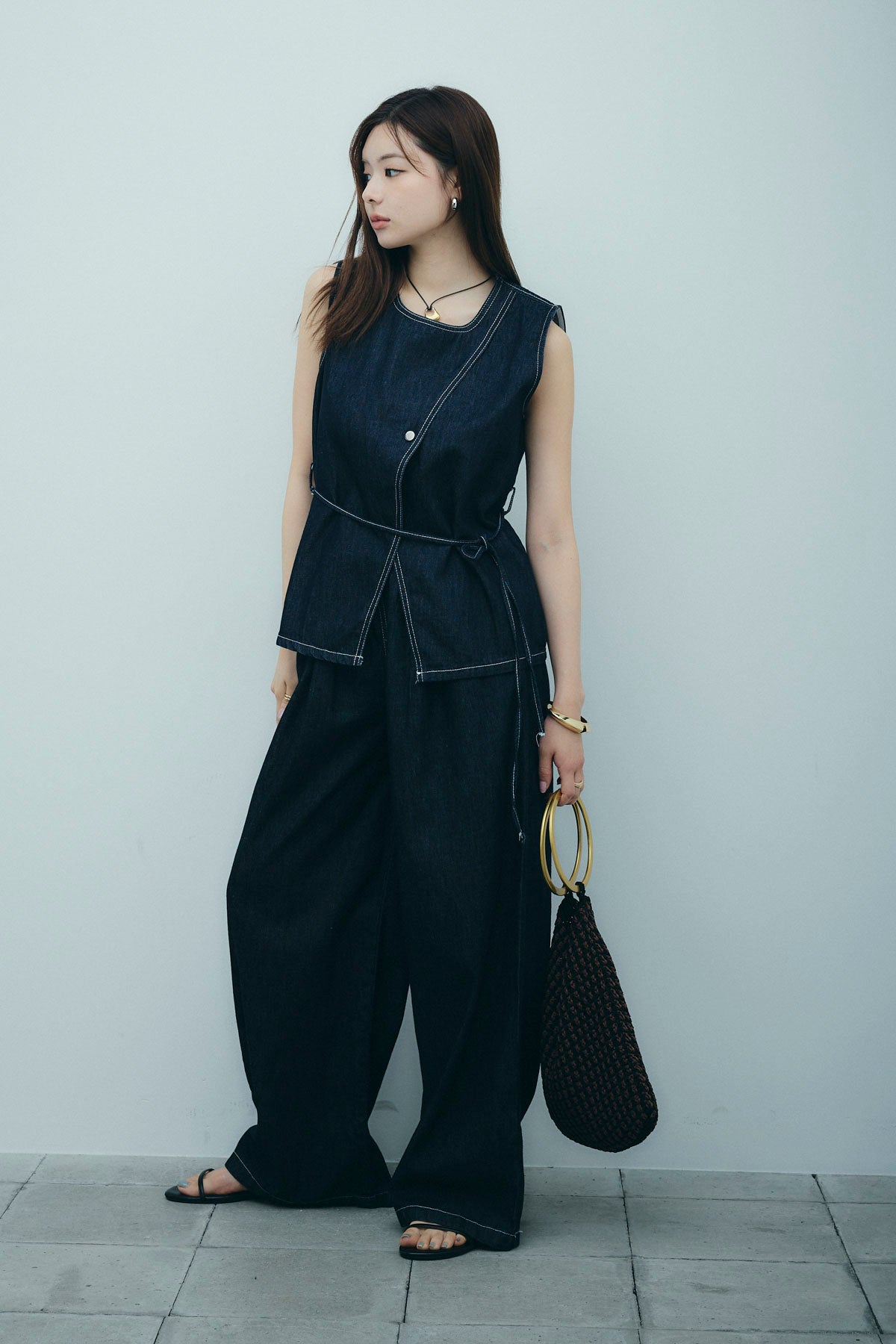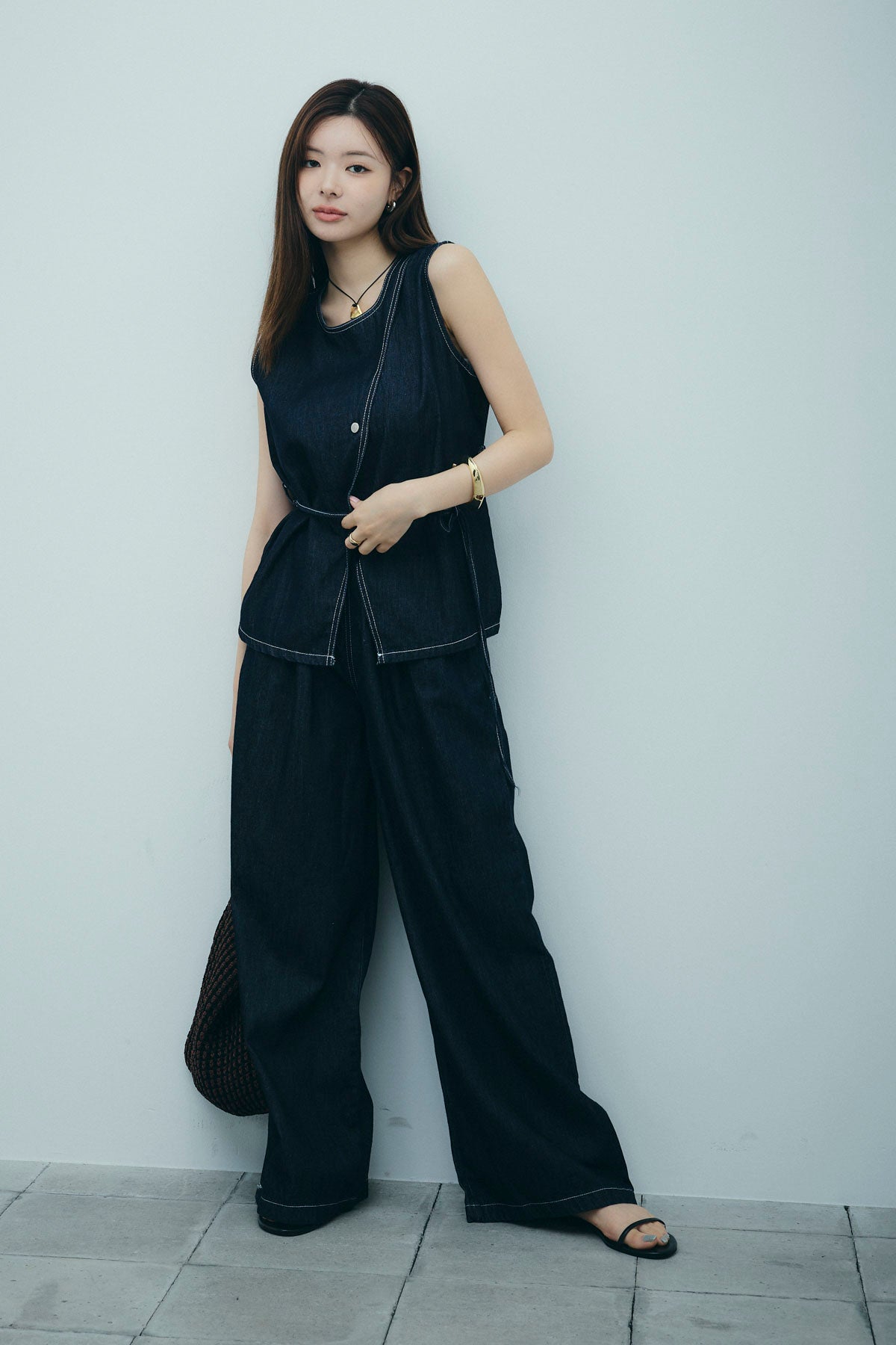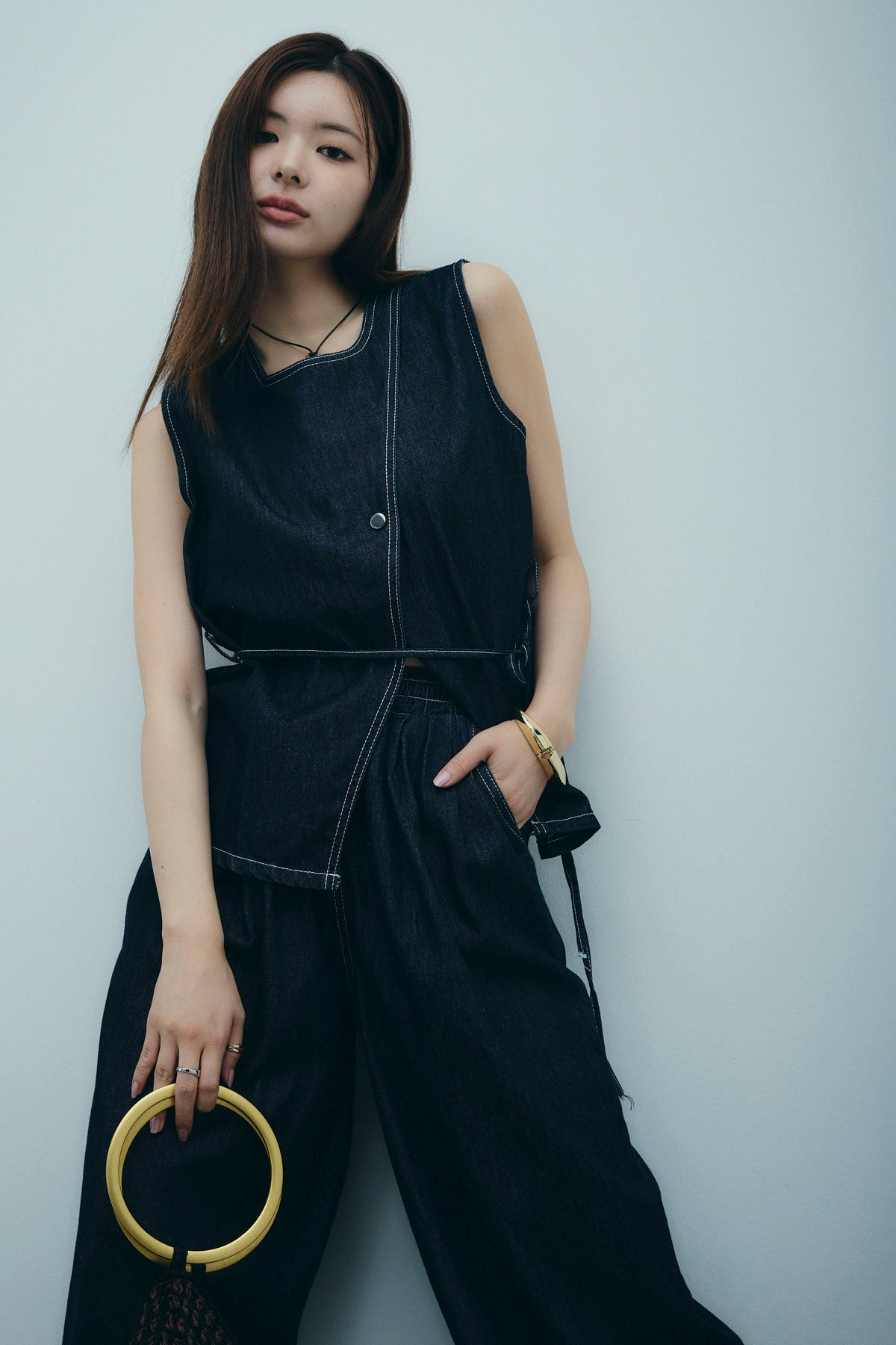 シンプルなデザインにステッチがアクセントのデニムセットアップ。ベストはウエストリボンでシルエット調整ができ、パンツはゆったりとしたワイドシルエットで動きやすさを確保。カジュアルながらもまとまりのあるスタイルが完成します。