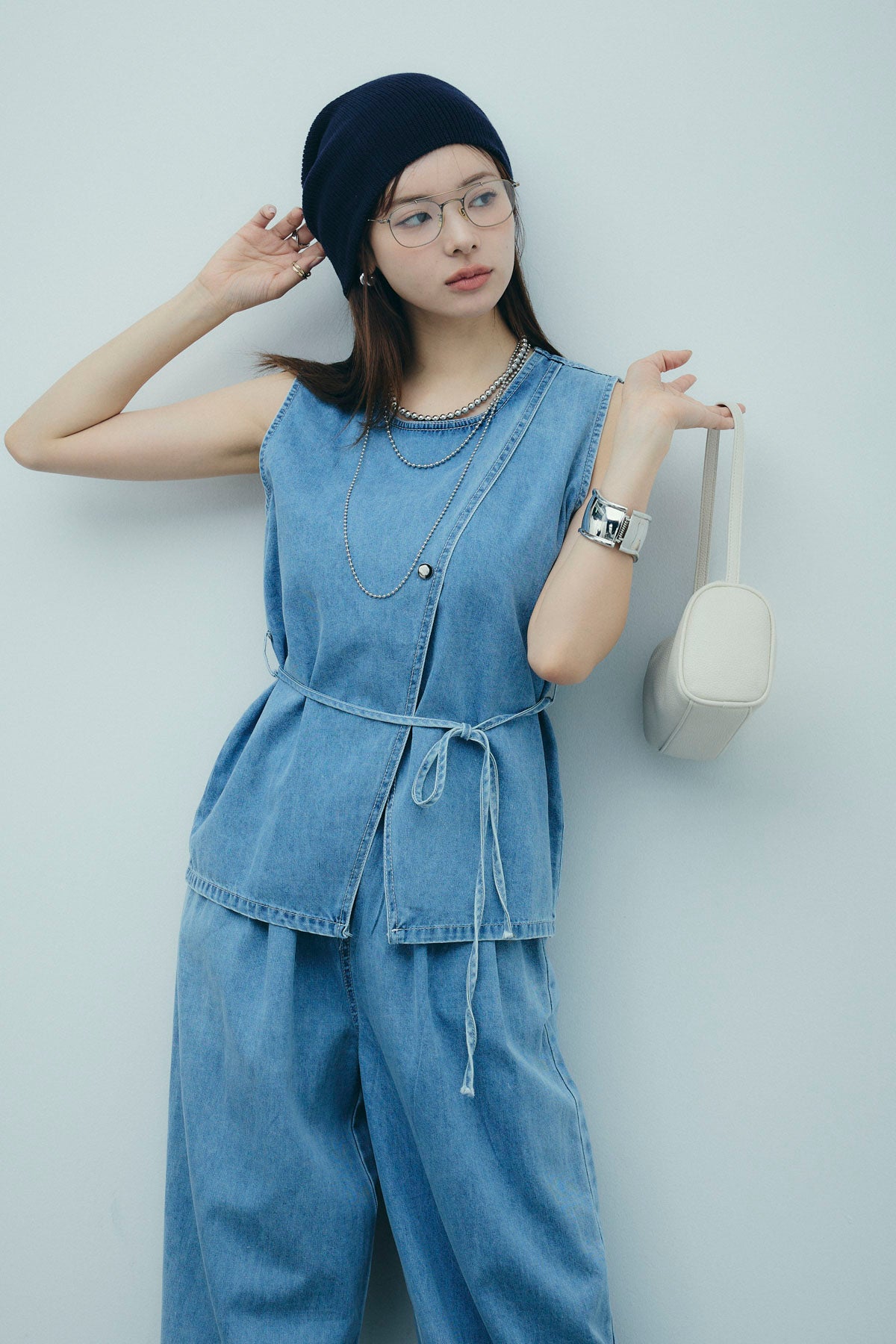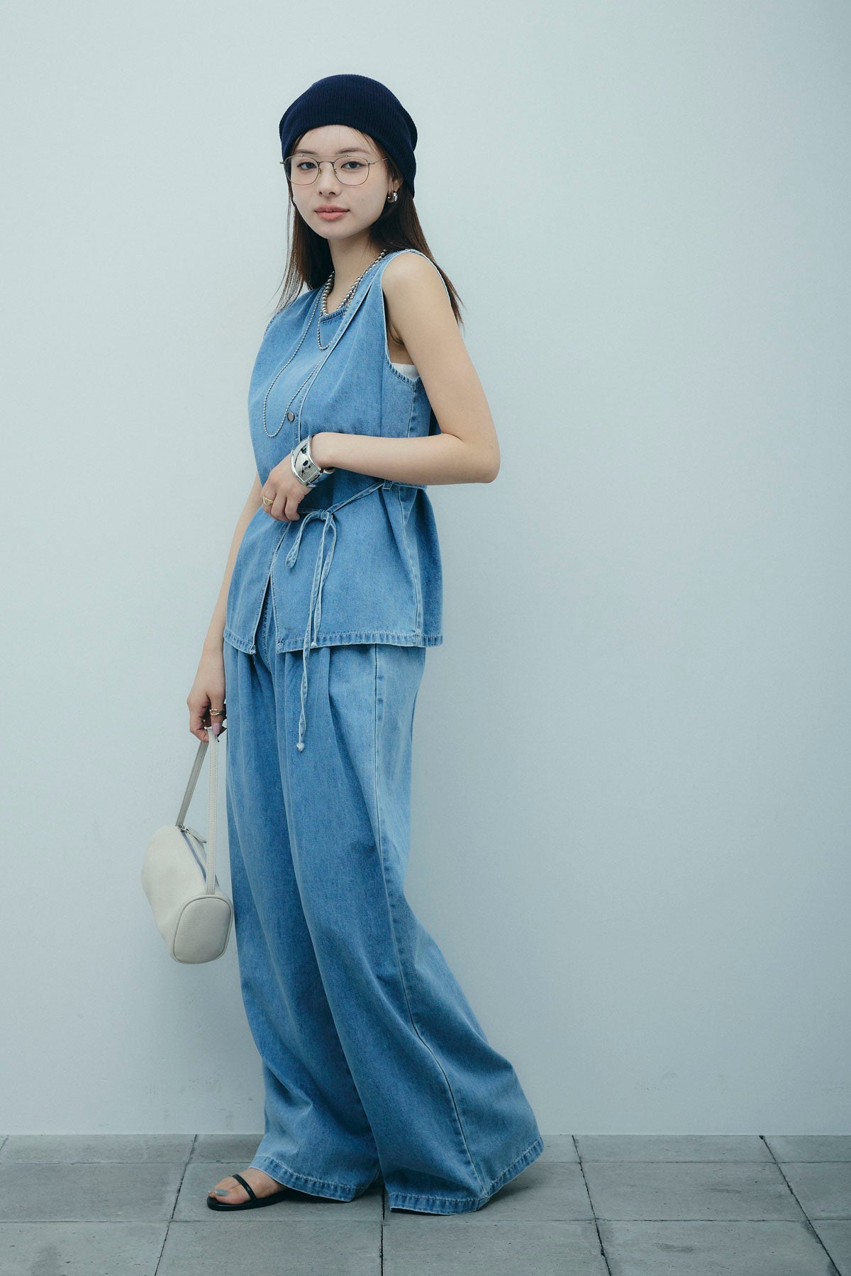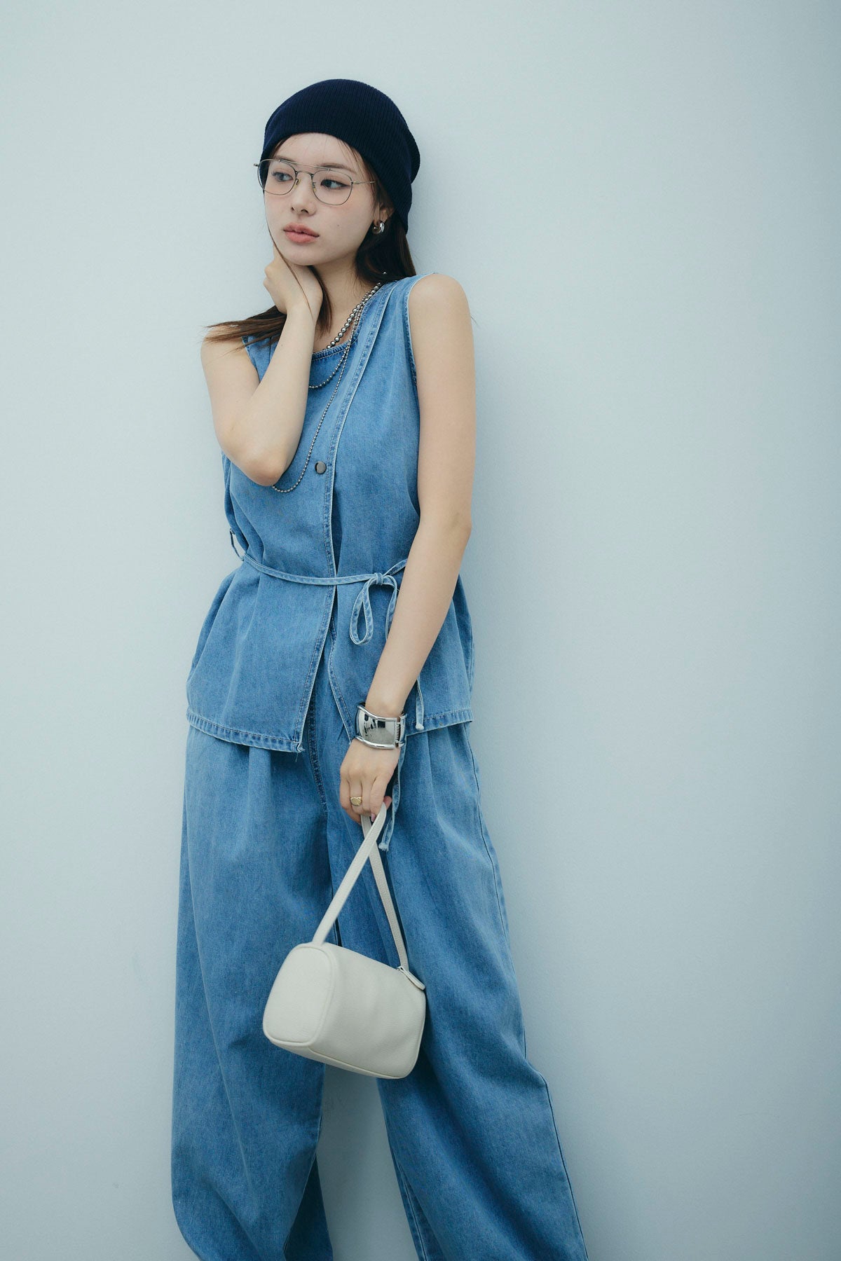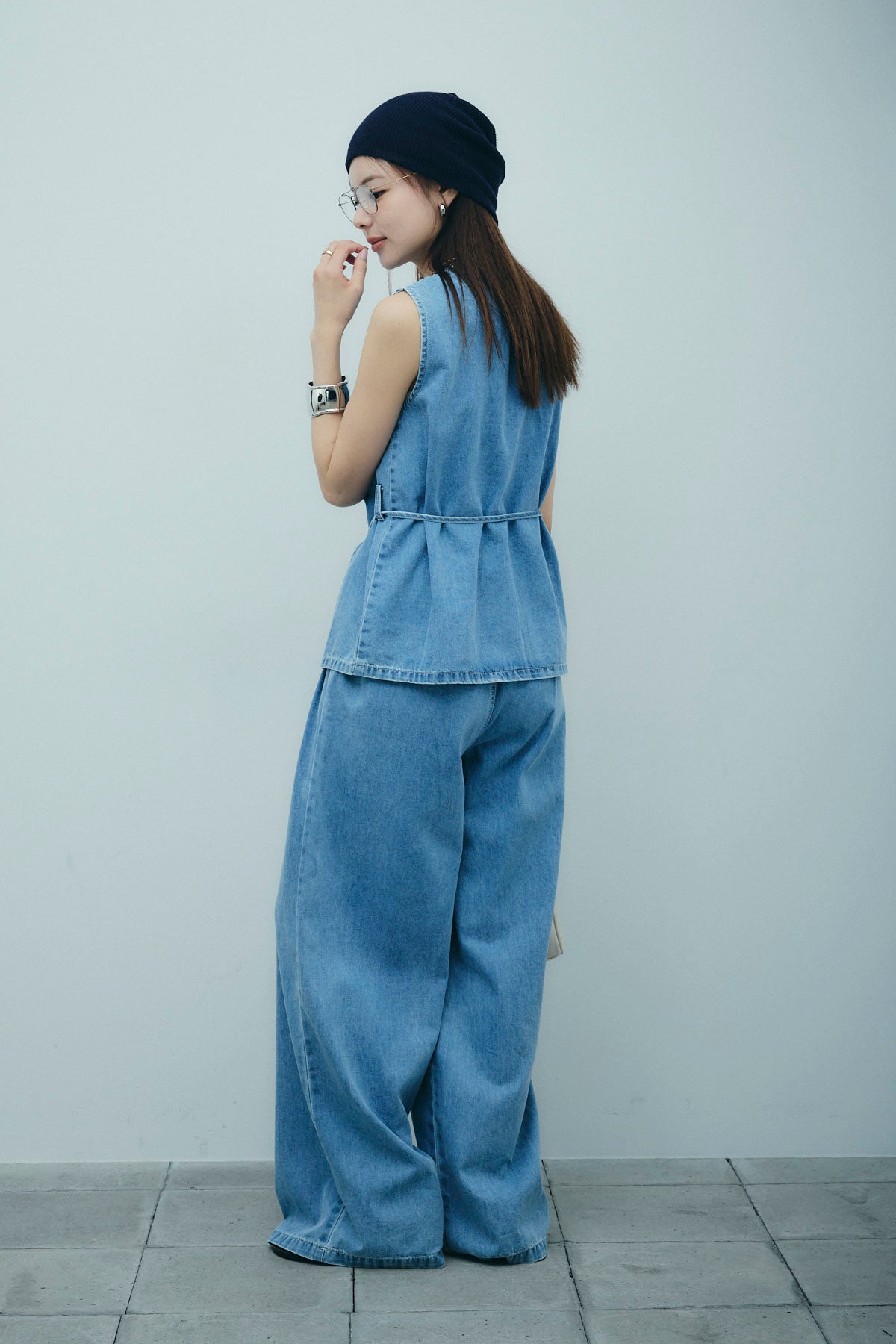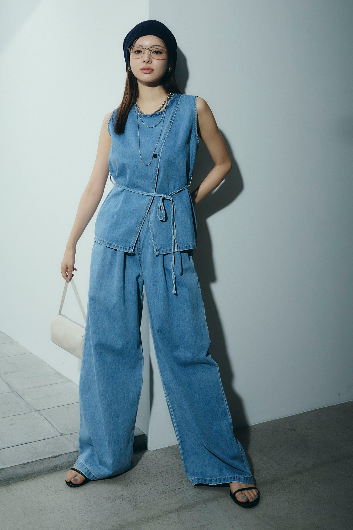 シンプルなデザインにステッチがアクセントのデニムセットアップ。ベストはウエストリボンでシルエット調整ができ、パンツはゆったりとしたワイドシルエットで動きやすさを確保。カジュアルながらもまとまりのあるスタイルが完成します。