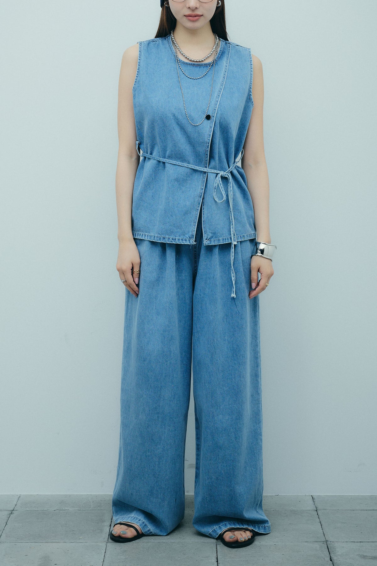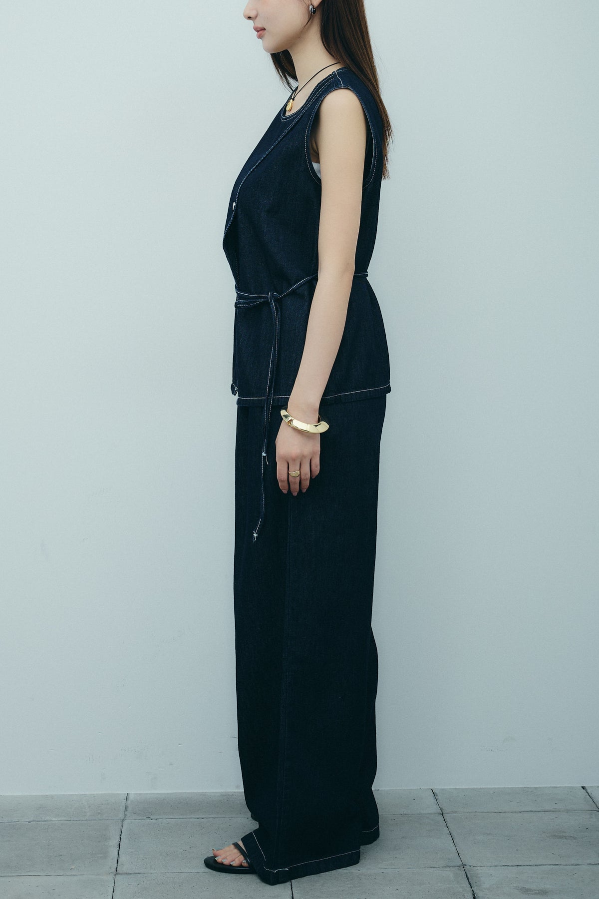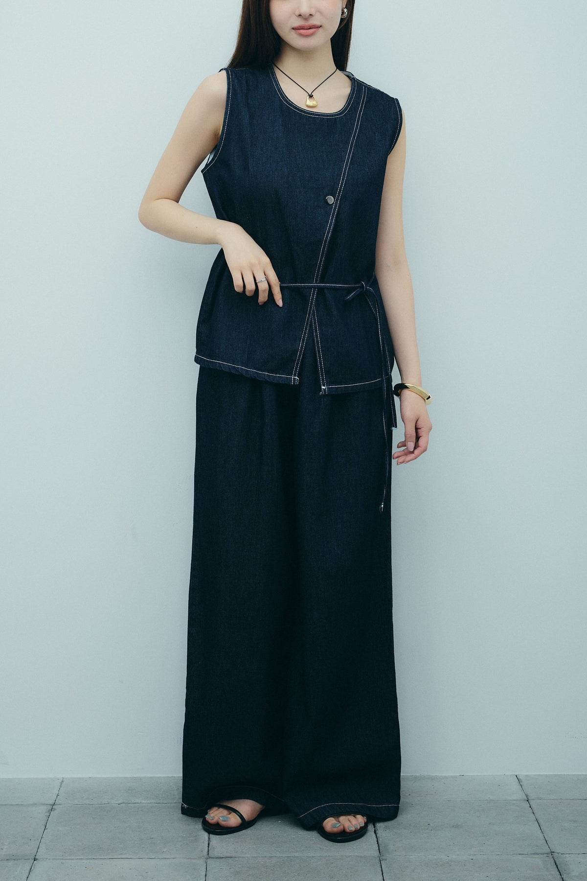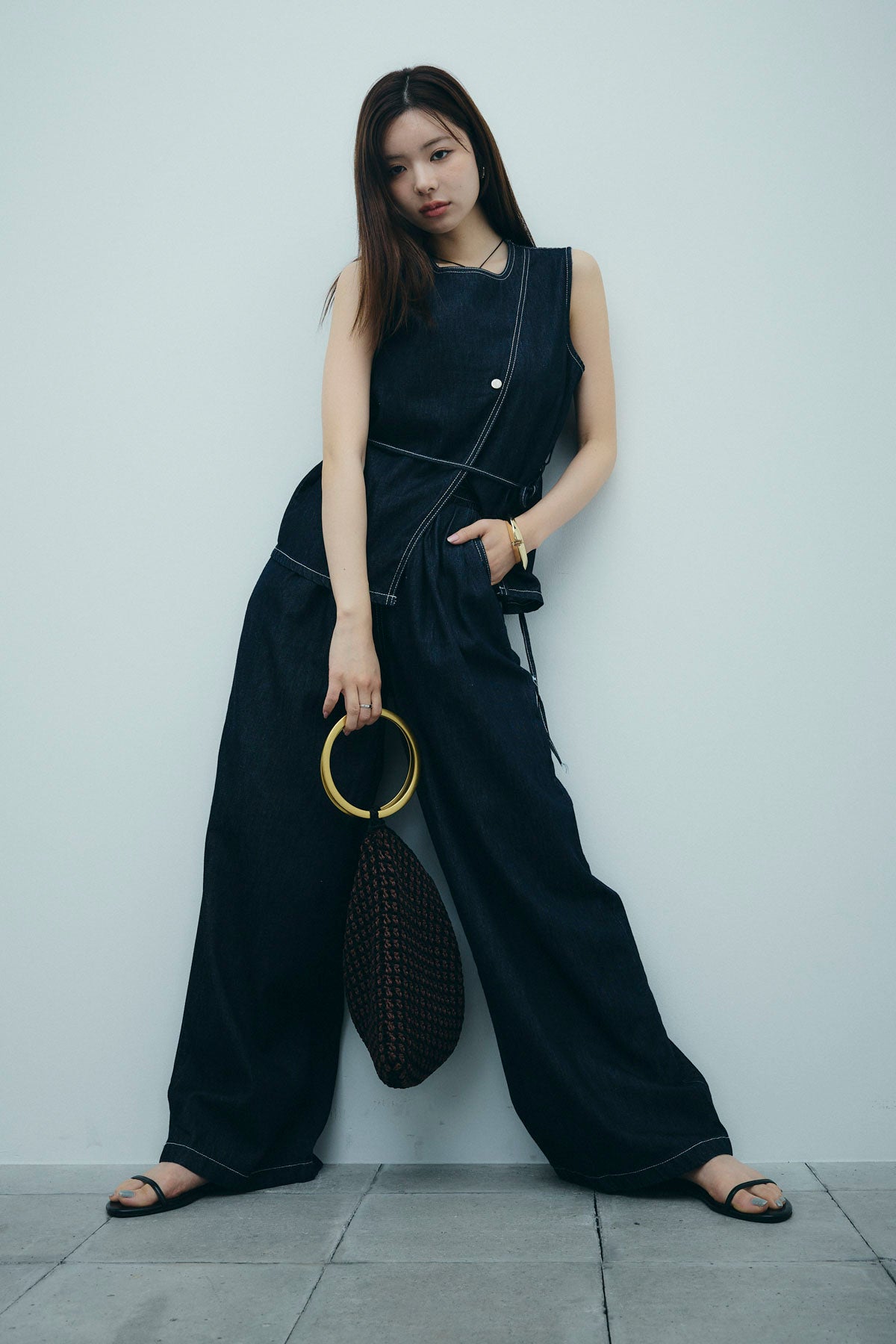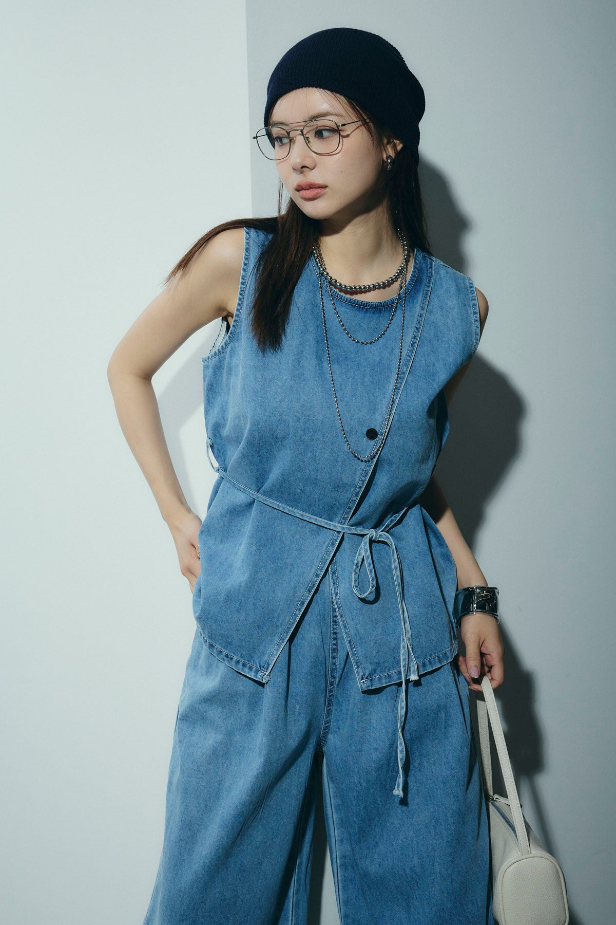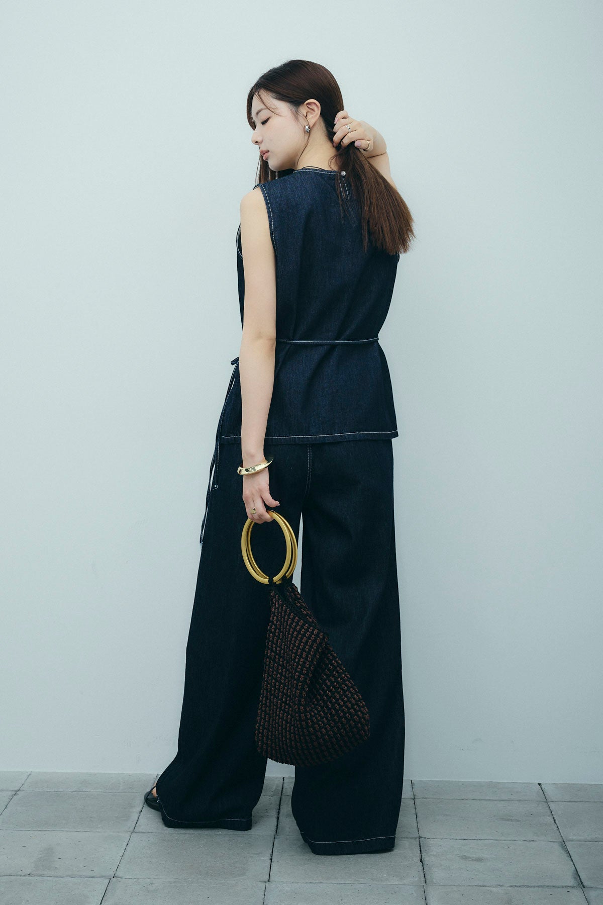 シンプルなデザインにステッチがアクセントのデニムセットアップ。ベストはウエストリボンでシルエット調整ができ、パンツはゆったりとしたワイドシルエットで動きやすさを確保。カジュアルながらもまとまりのあるスタイルが完成します。