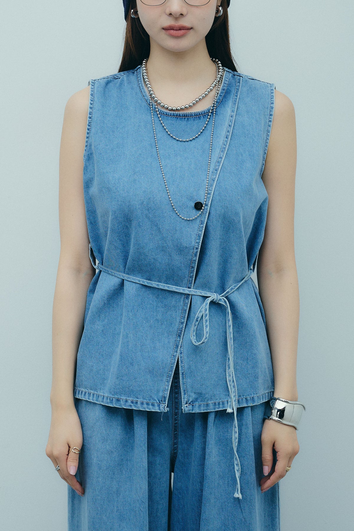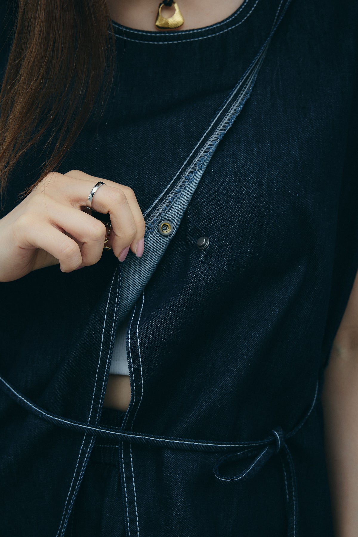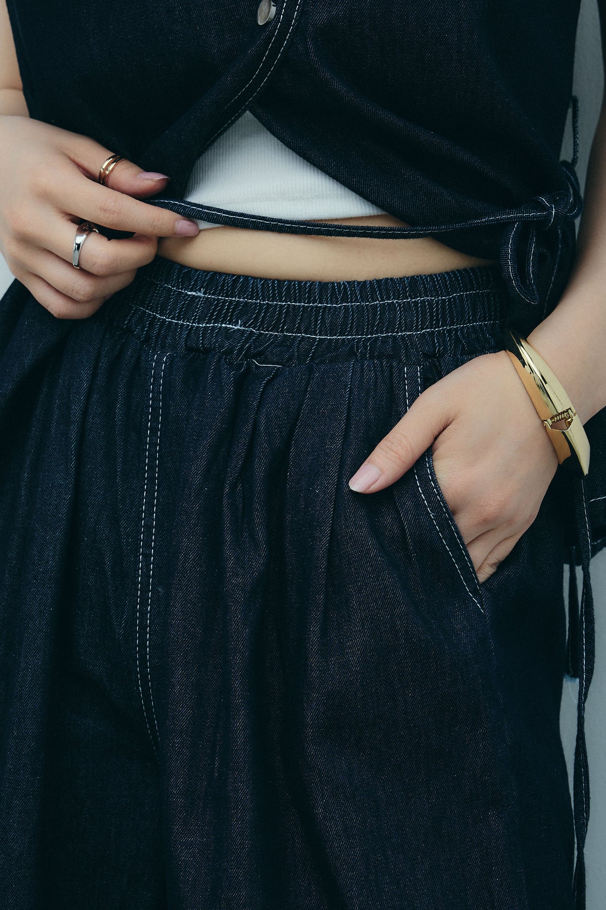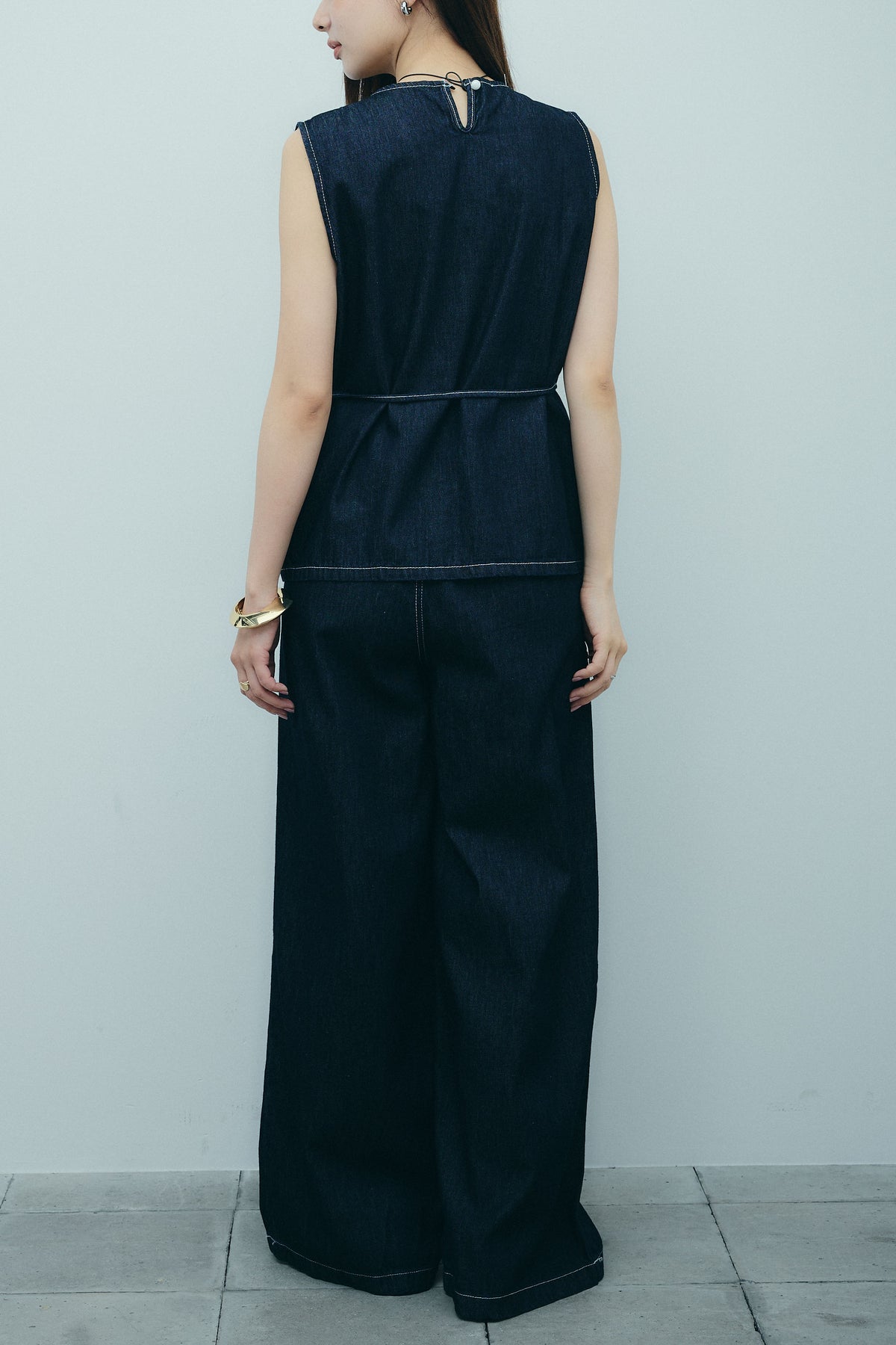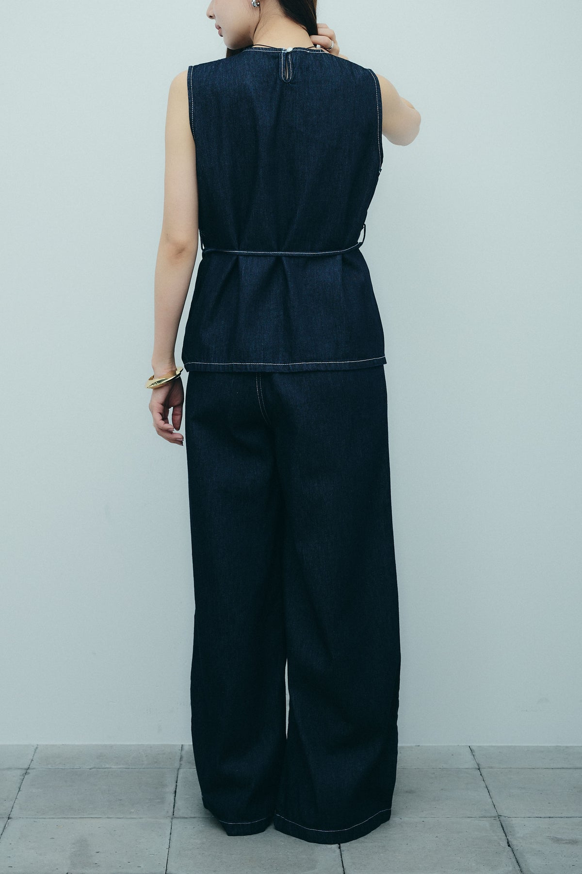 シンプルなデザインにステッチがアクセントのデニムセットアップ。ベストはウエストリボンでシルエット調整ができ、パンツはゆったりとしたワイドシルエットで動きやすさを確保。カジュアルながらもまとまりのあるスタイルが完成します。