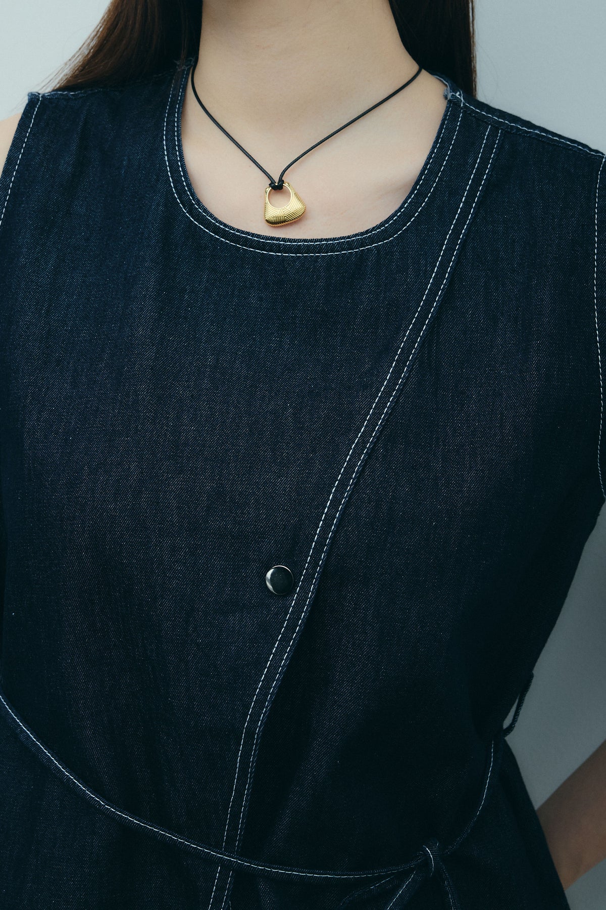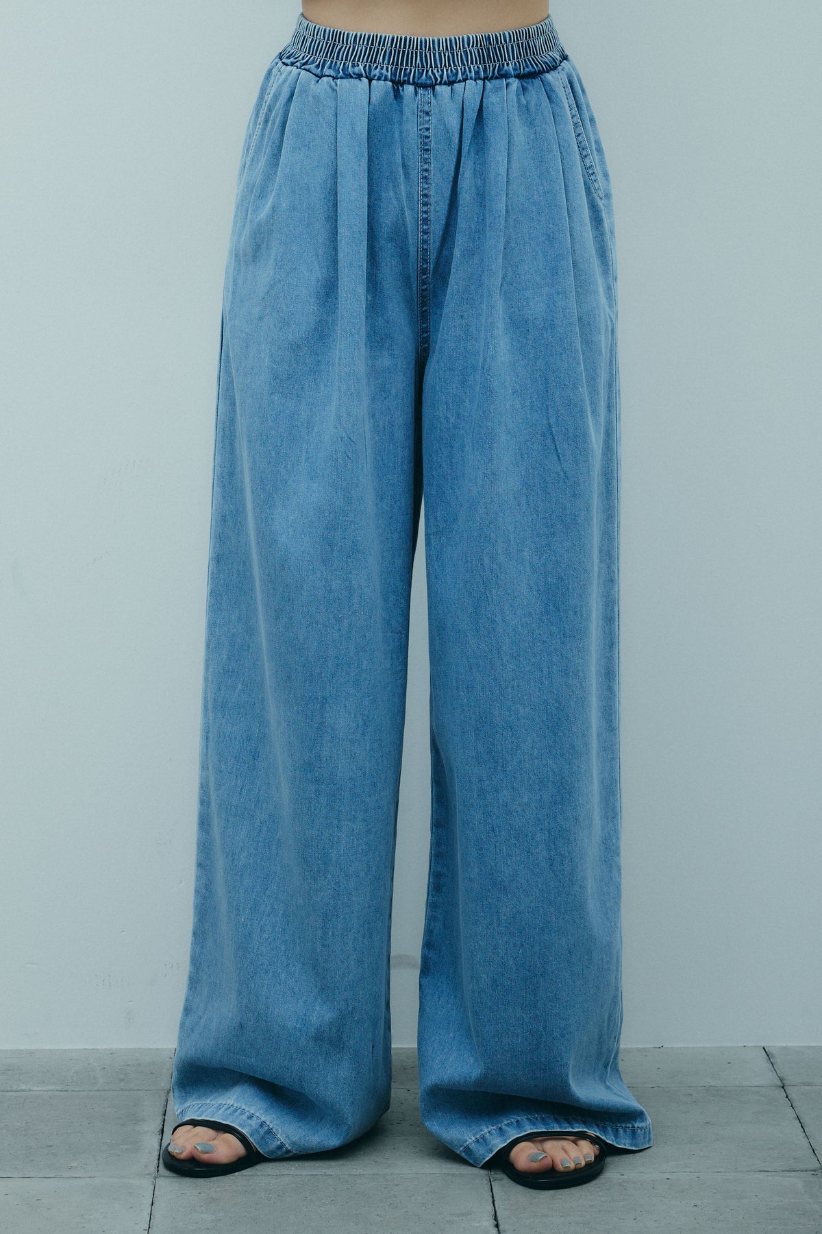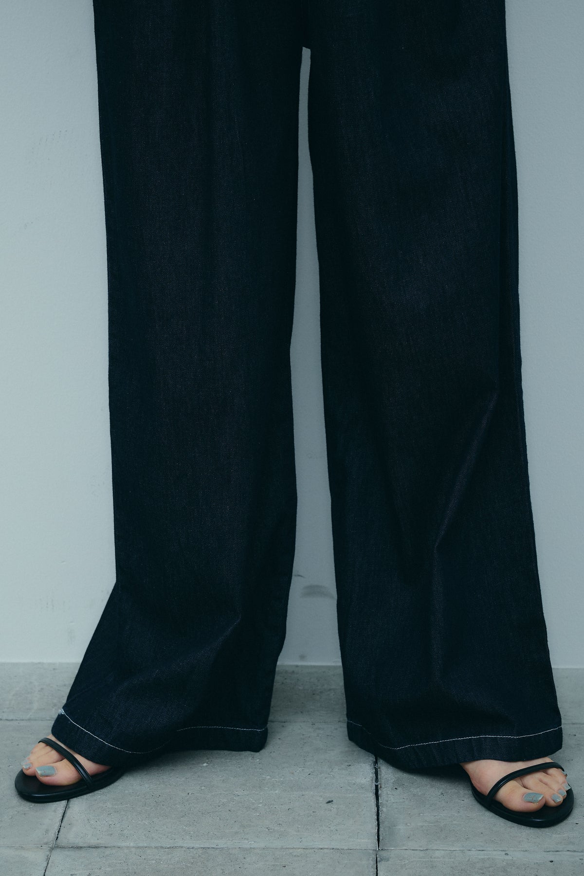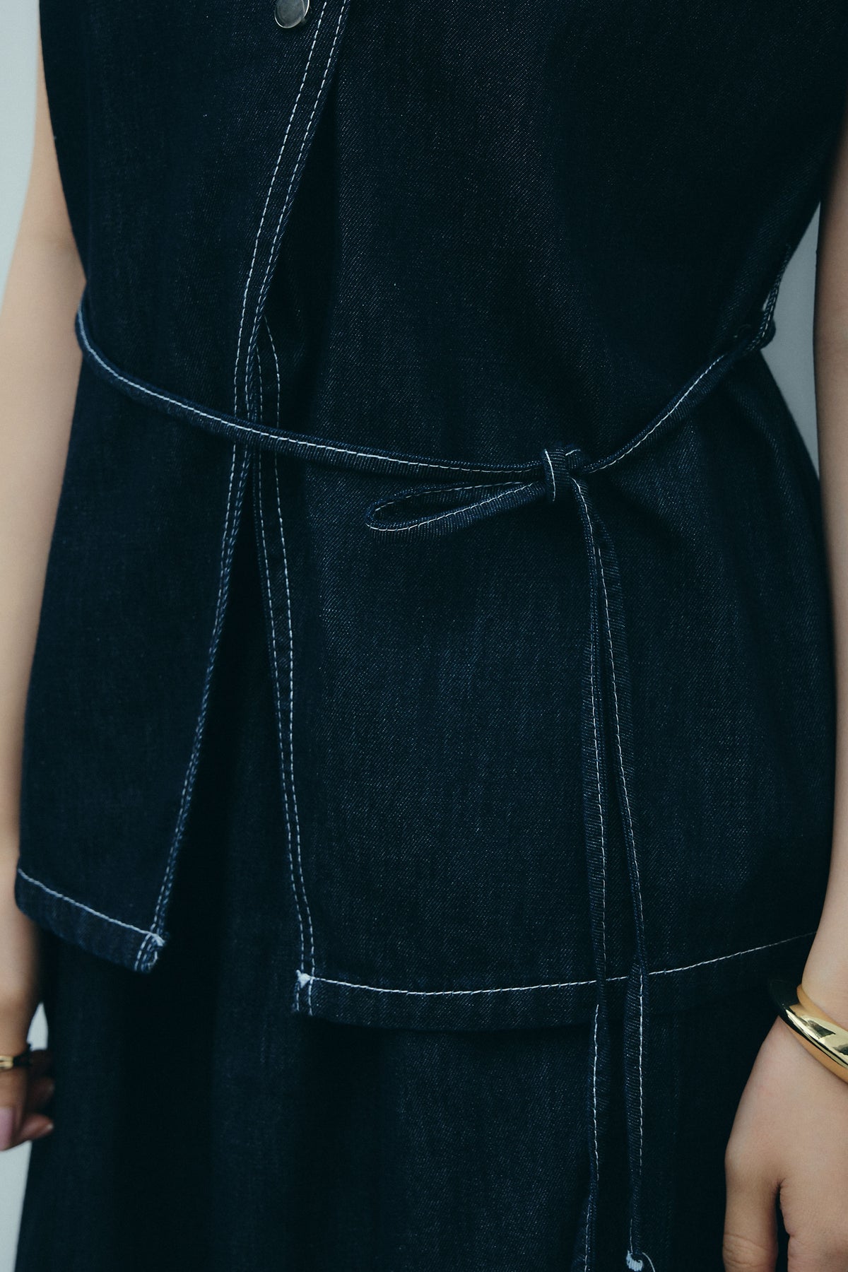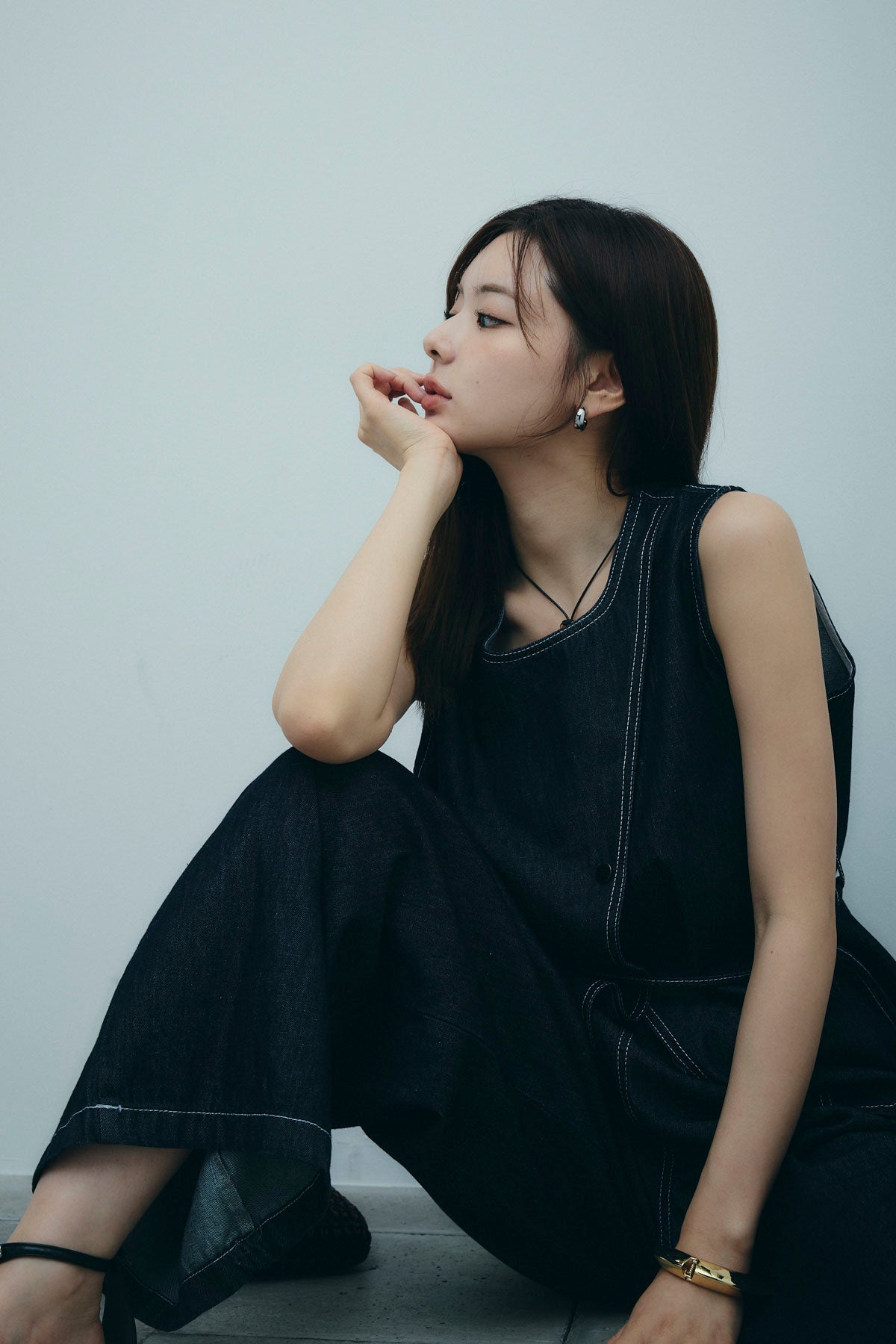 シンプルなデザインにステッチがアクセントのデニムセットアップ。ベストはウエストリボンでシルエット調整ができ、パンツはゆったりとしたワイドシルエットで動きやすさを確保。カジュアルながらもまとまりのあるスタイルが完成します。