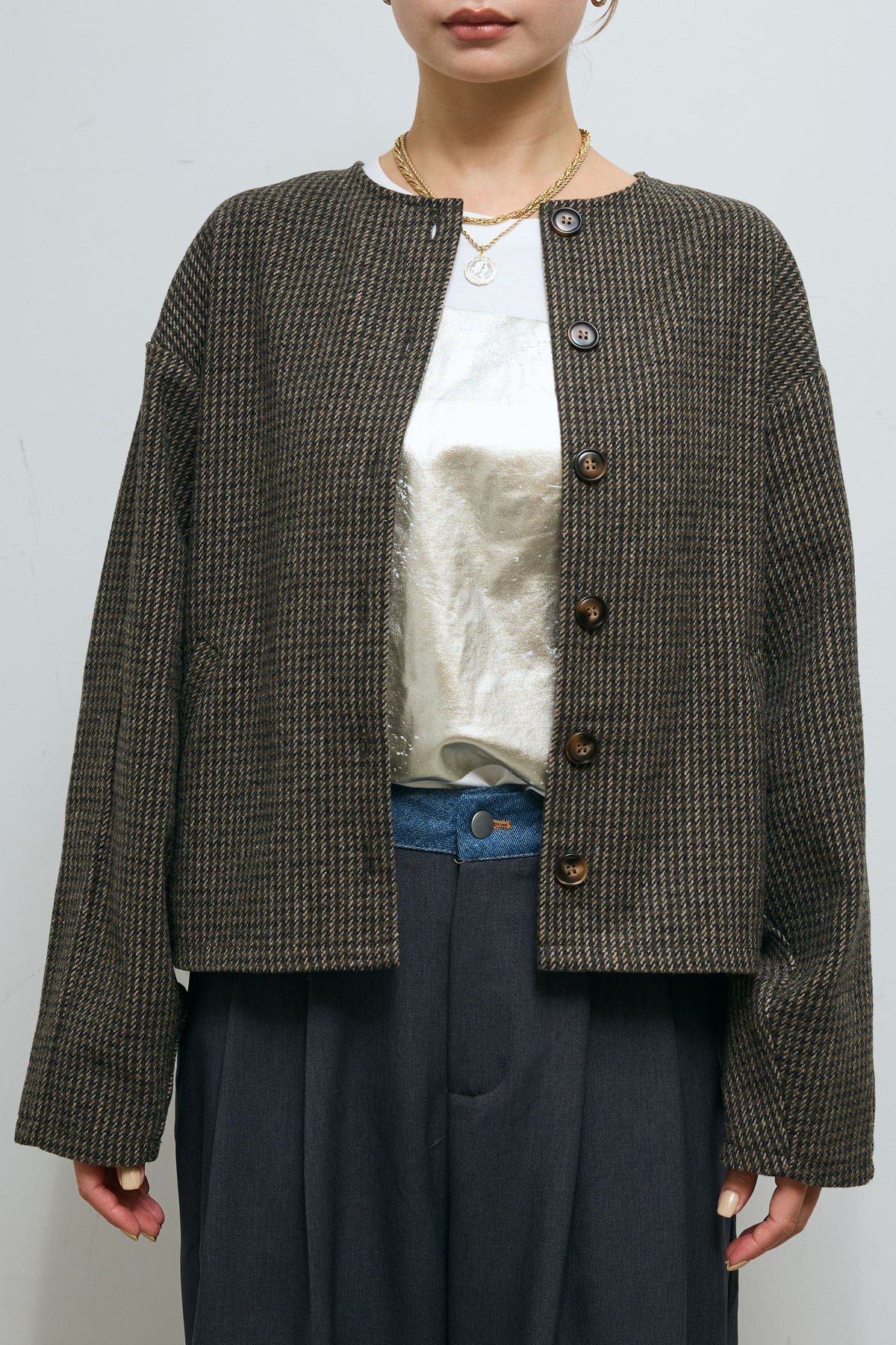 クラシカルなガンクラブチェック柄が魅力のノーカラージャケット。すっきりとした首元とコンパクトなシルエットが上品な印象を与えます。程よい厚みの生地で軽やかに羽織れ、季節の変わり目にも活躍。デニムと合わせたカジュアルスタイルから、スラックスを合わせたきれいめコーデまで幅広く着回せる万能アイテムです。