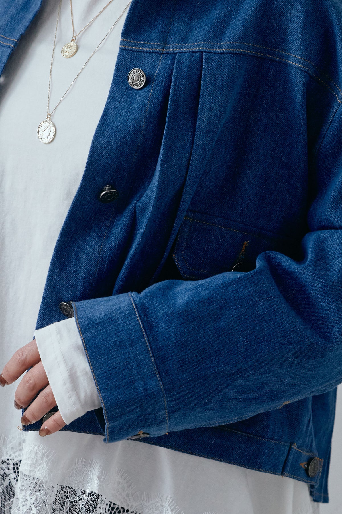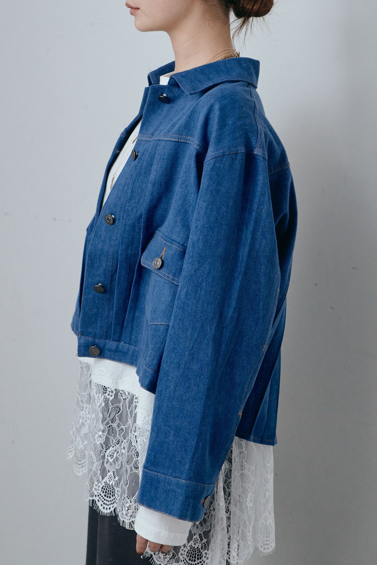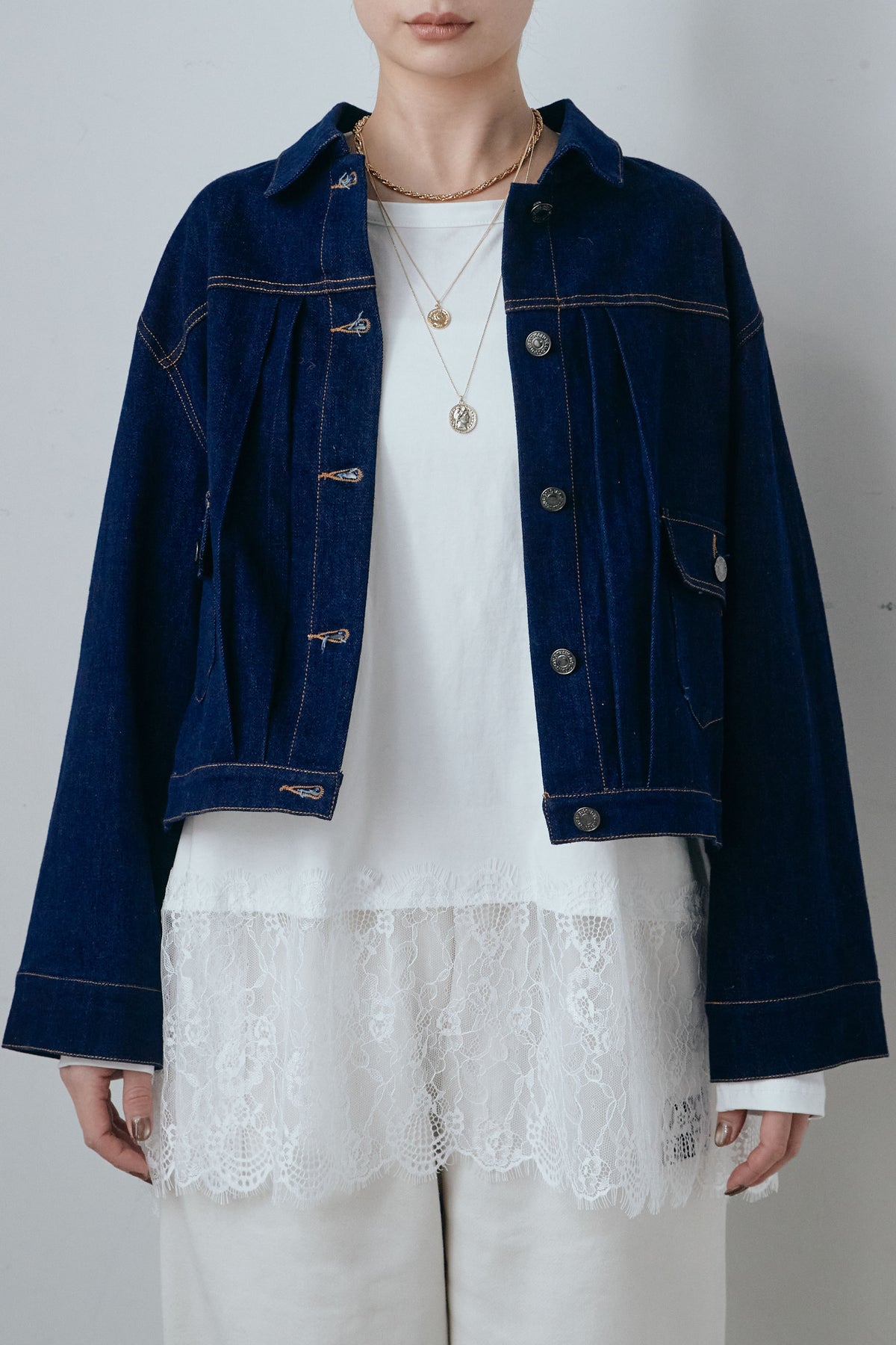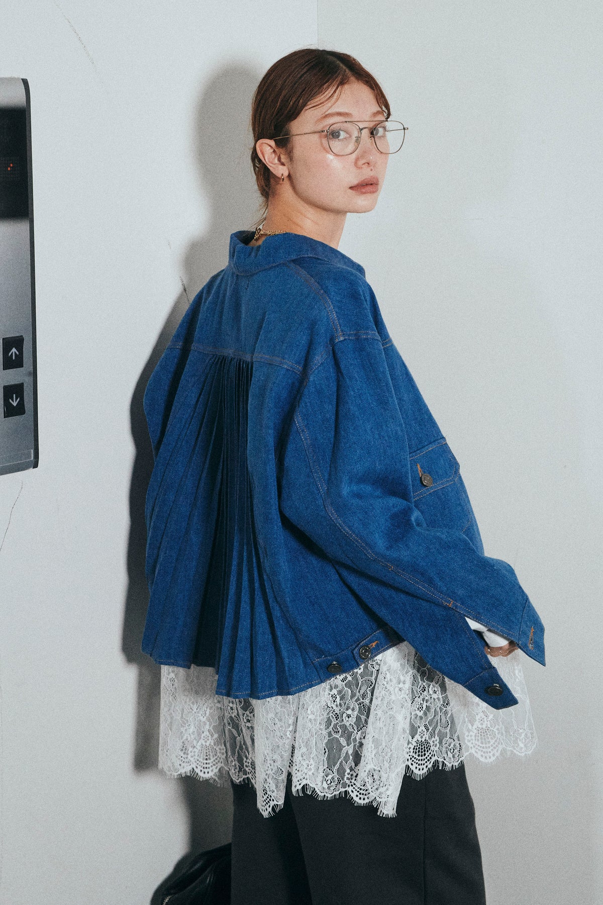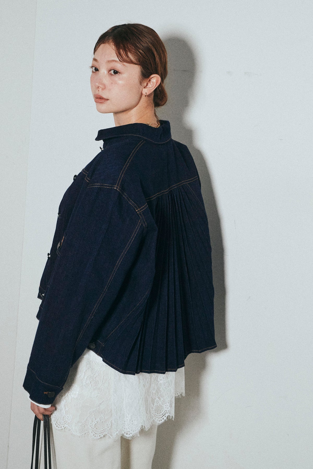 背面に施したプリーツデザインが印象的なデニムジャケット。動くたびに広がる立体的なシルエットが、後ろ姿まで表情豊かに仕上げます。程よくゆとりのあるサイズ感で、インナーを選ばず重ねやすいのもポイント。フロントはすっきりとしたデザインのため、甘さを抑えたバランスにまとまります。パンツにもスカートにも合わせやすく、いつものスタイリングにさりげない変化を加えてくれる一着です。