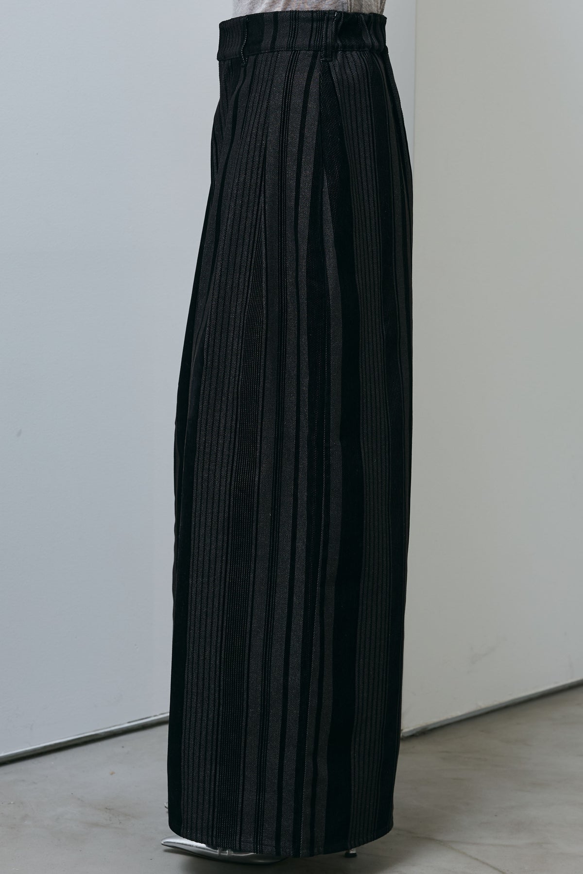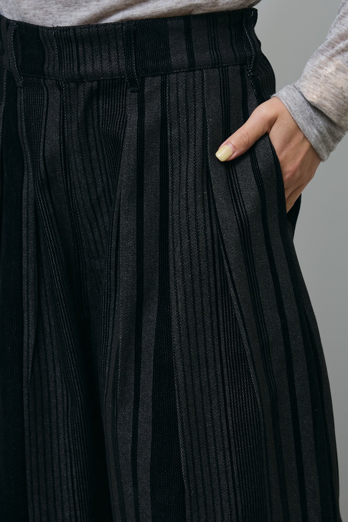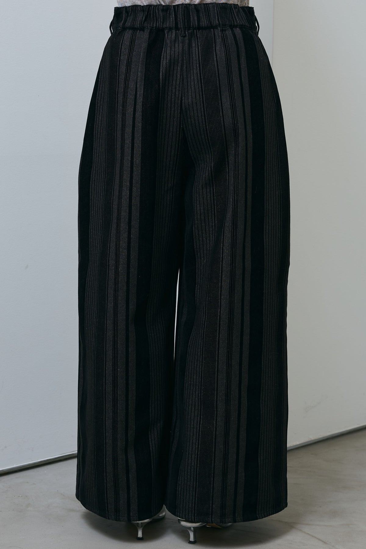 光沢のあるベロア素材が魅力のストライプ細畝ワイドパンツ。縦ラインを強調するデザインが脚をすらりと見せ、動くたびに表情が変わる上品な質感が印象的です。ウエストゴム仕様でストレスフリーな穿き心地ながら、きちんと感も兼ね備えた一枚。ニットやシャツなど、幅広いアイテムと好相性で秋冬のコーデに華を添えます。