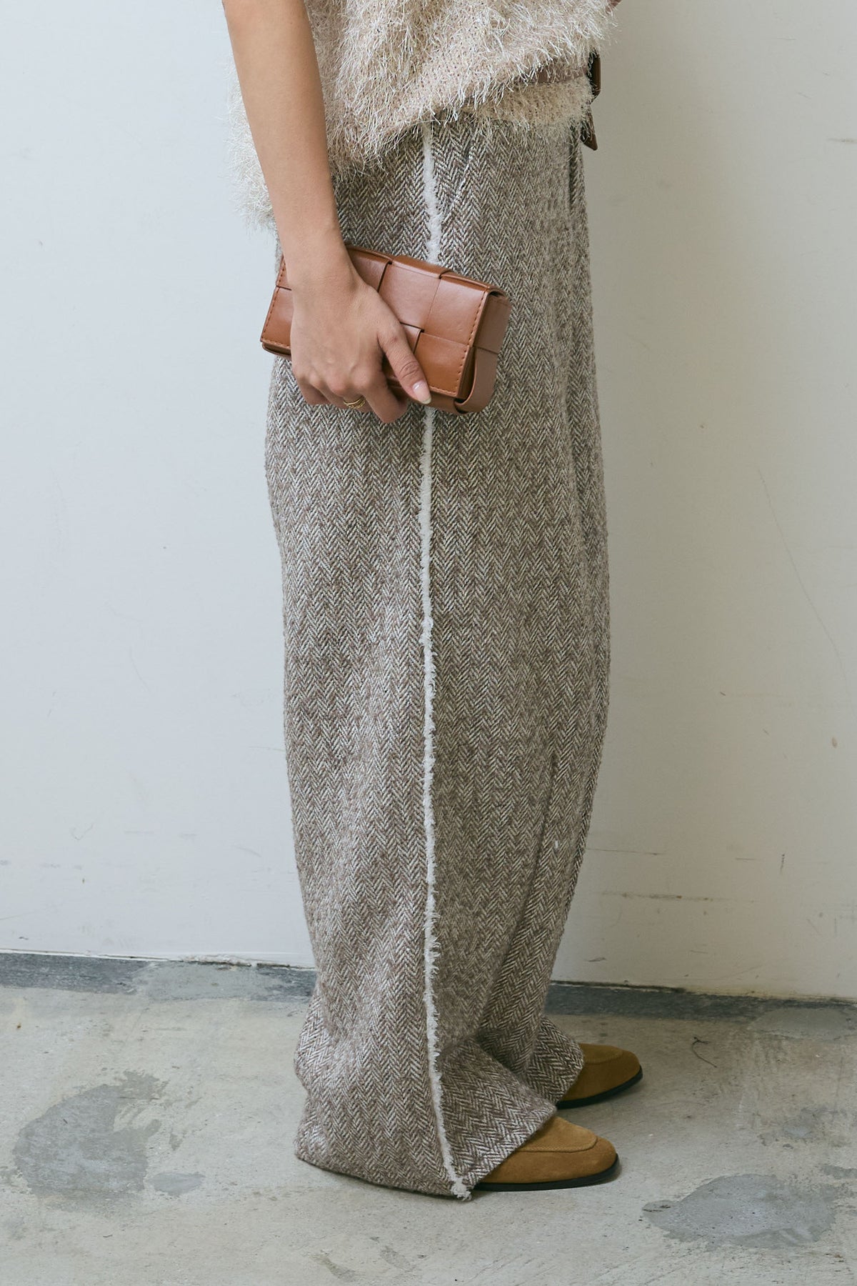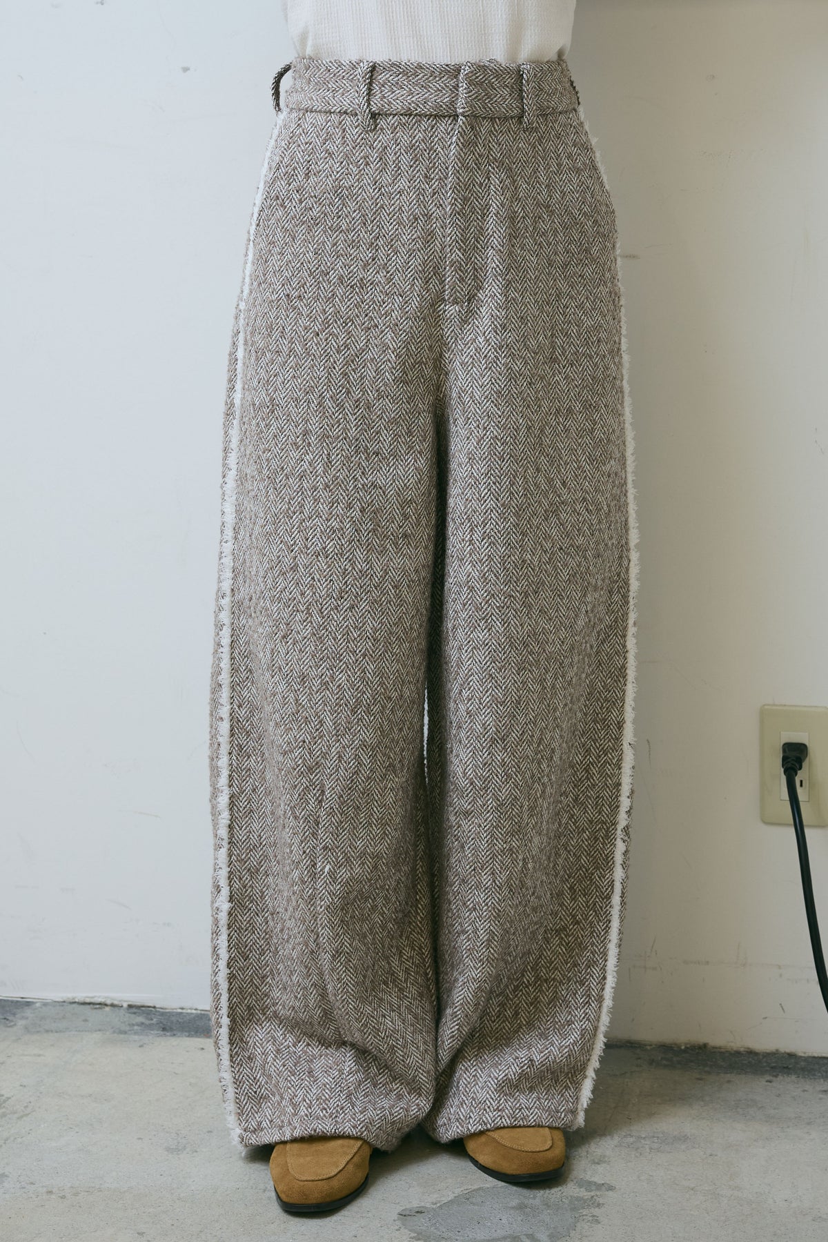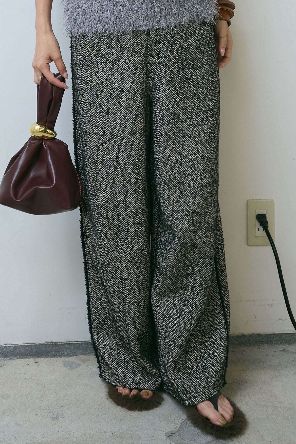 表情豊かなツイード生地にフリンジを効かせた、主役級のカーブパンツ。立体感のある素材と絶妙なワイドシルエットが、シンプルなトップスにも洗練された印象をプラス。サイドラインの切り替えが縦のラインを強調し、スタイルアップも叶えます。デイリーにも華やかなシーンにも活躍する一本。
