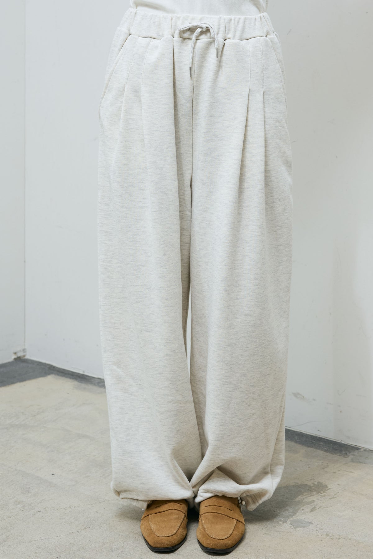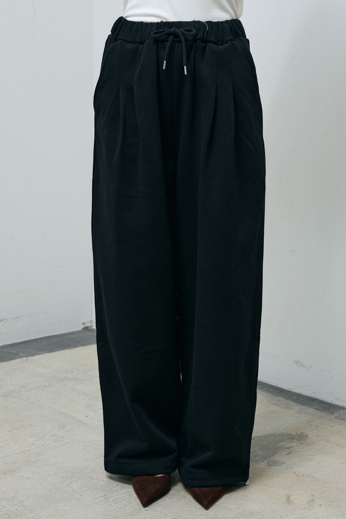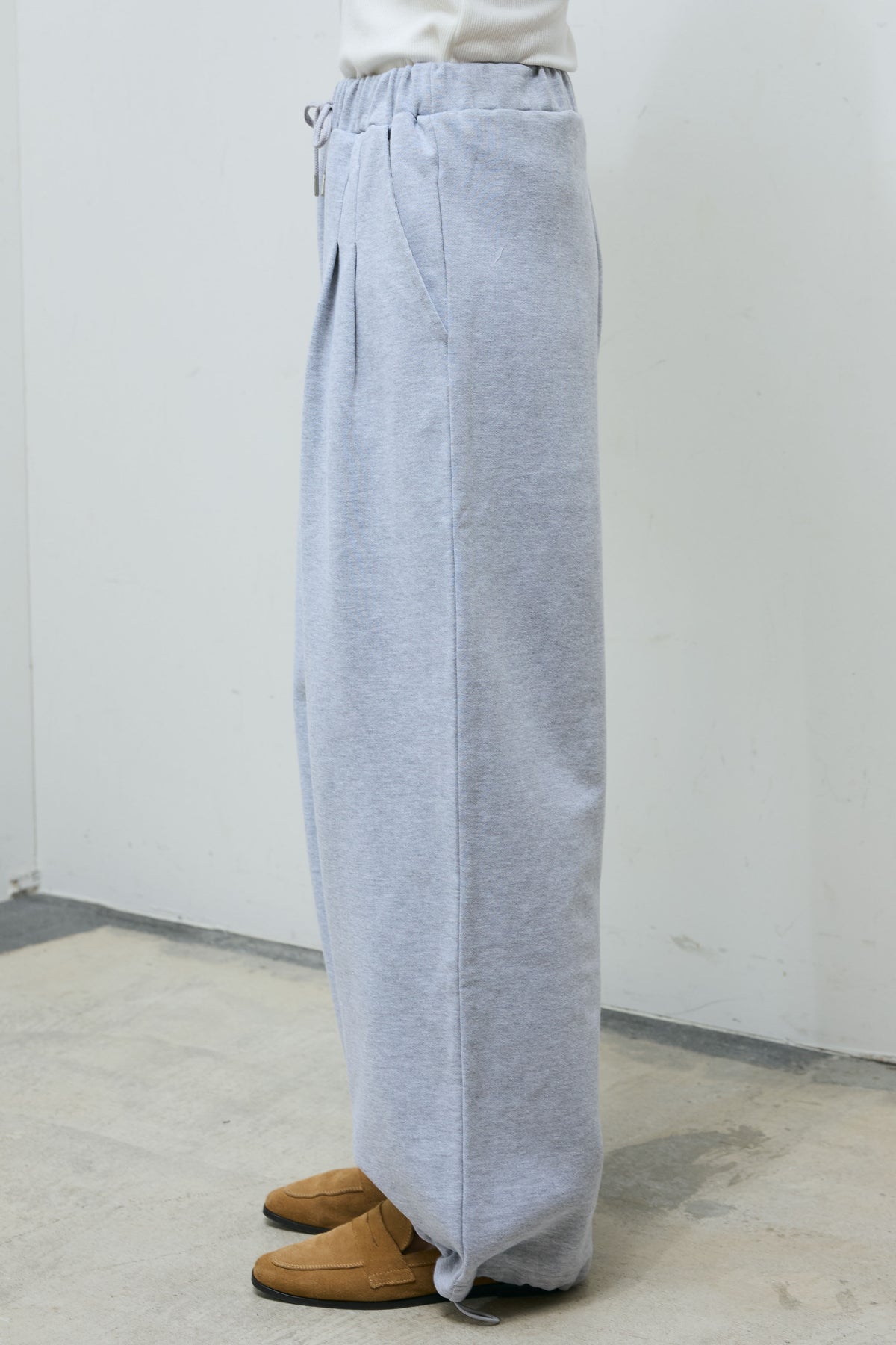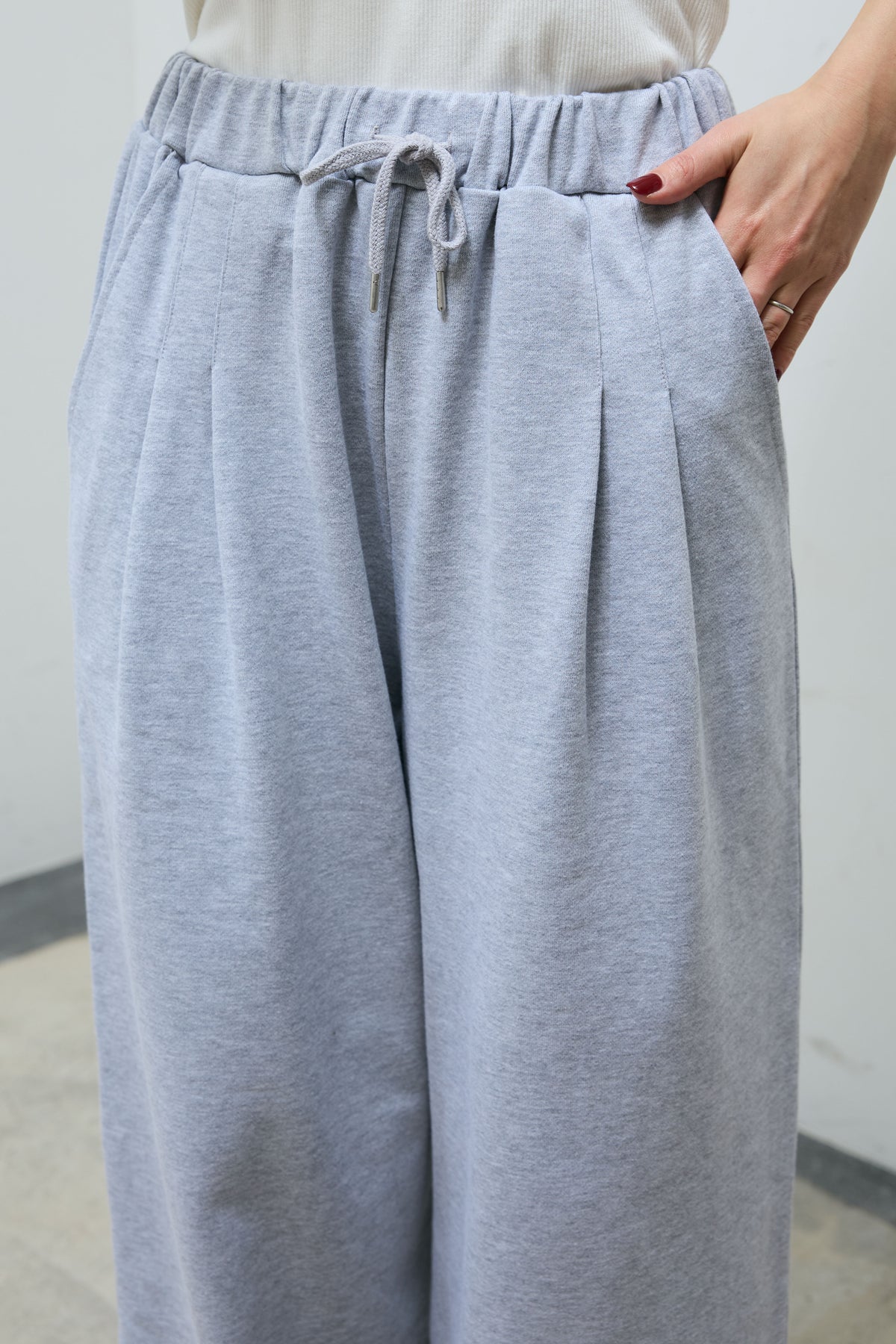 落ち感のあるスウェット素材を採用した、2タックデザインのパンツ。フロントに入ったタックが自然な立体感を生み、リラックス感がありながらもすっきりとした印象にまとまります。ほどよい厚みとやわらかな風合いで、デイリーに取り入れやすい一本。ワイドすぎないシルエットのため、トップスを選ばずバランスよく合わせられるのも魅力です。スニーカーでカジュアルに、フラットシューズやパンプスで抜け感のあるスタイルにも対応し、着回し力の高いアイテムです。