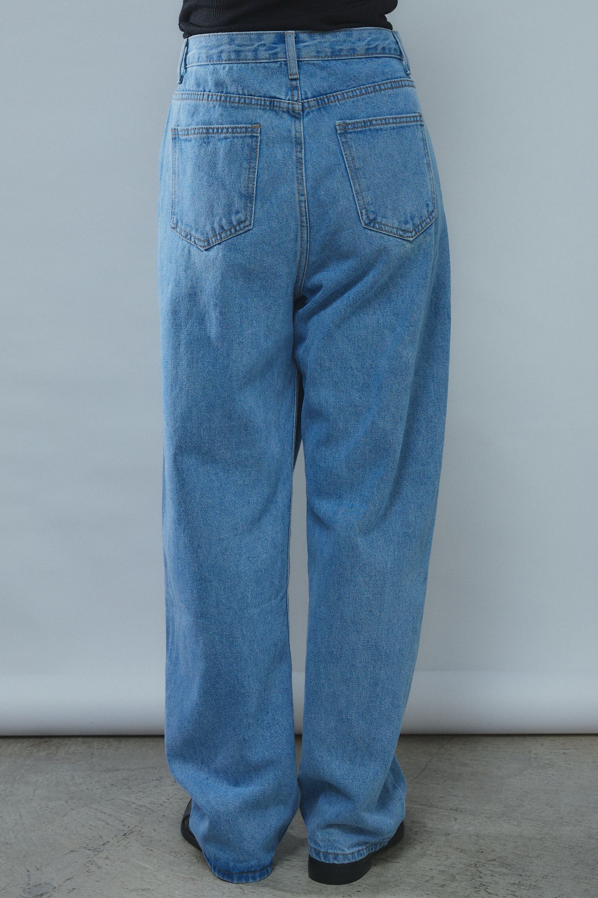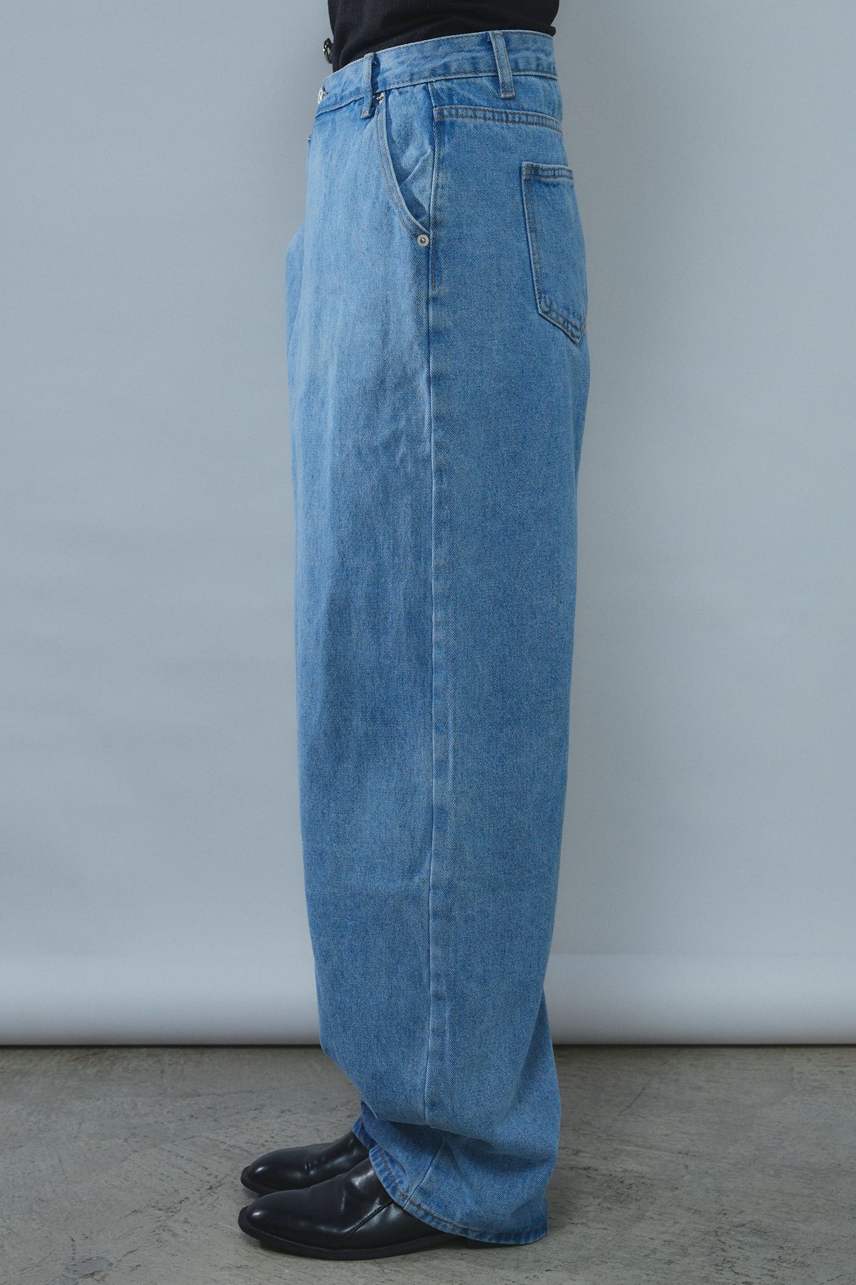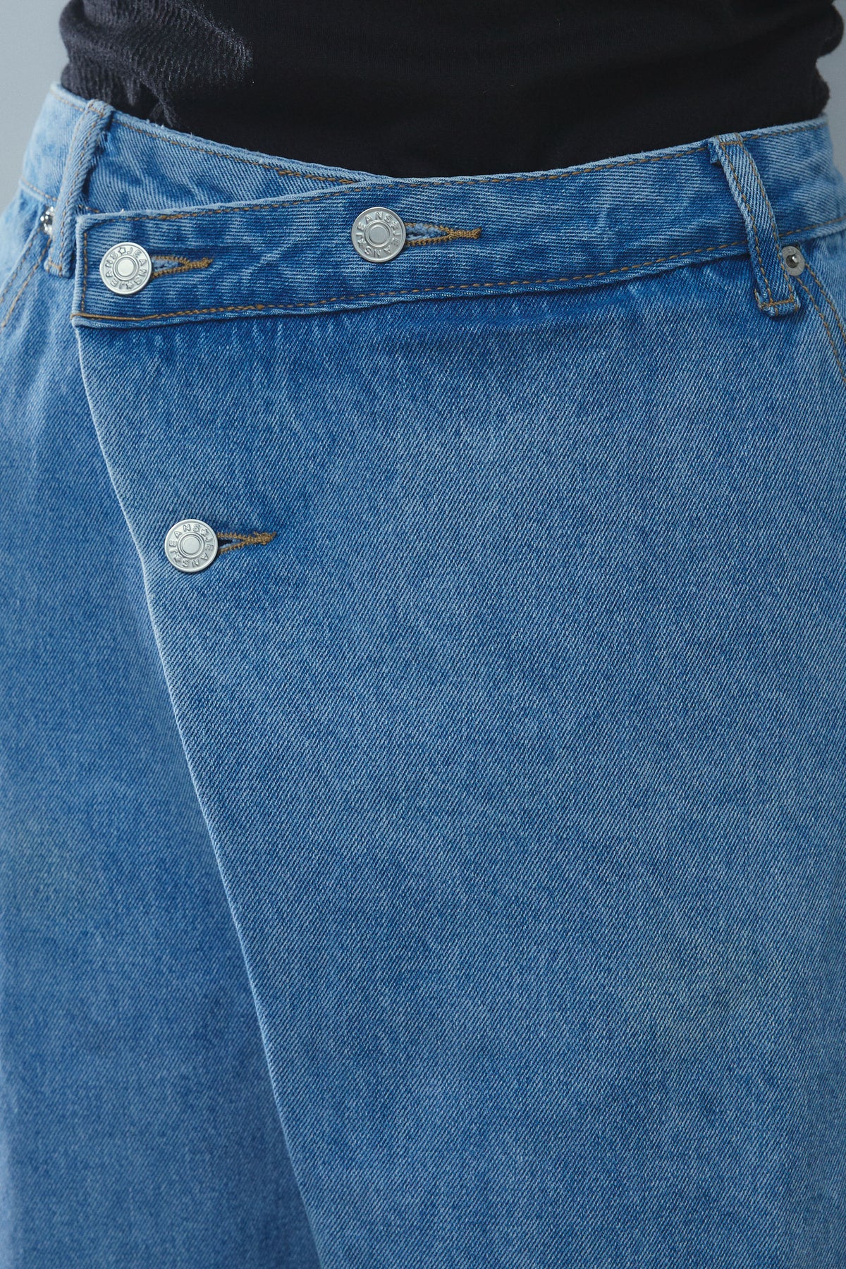 ウエストのアシンメトリーデザインが目を引くデニムパンツ。斜めに配置されたボタンと重なりが、シンプルながらも個性的な表情をプラスします。ややテーパード気味のシルエットが脚のラインをきれいに見せ、カジュアルスタイルにモードなアクセントを加えてくれる一本です。
