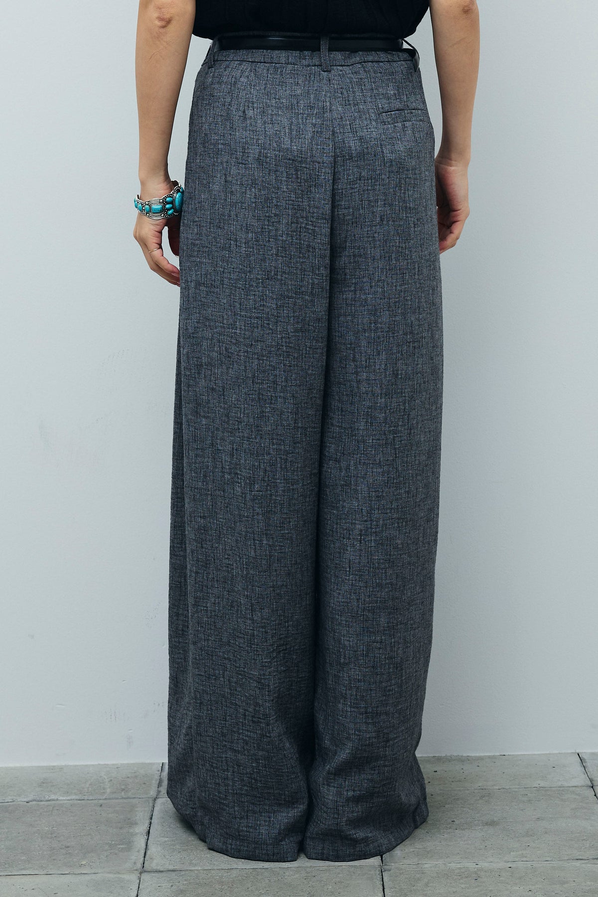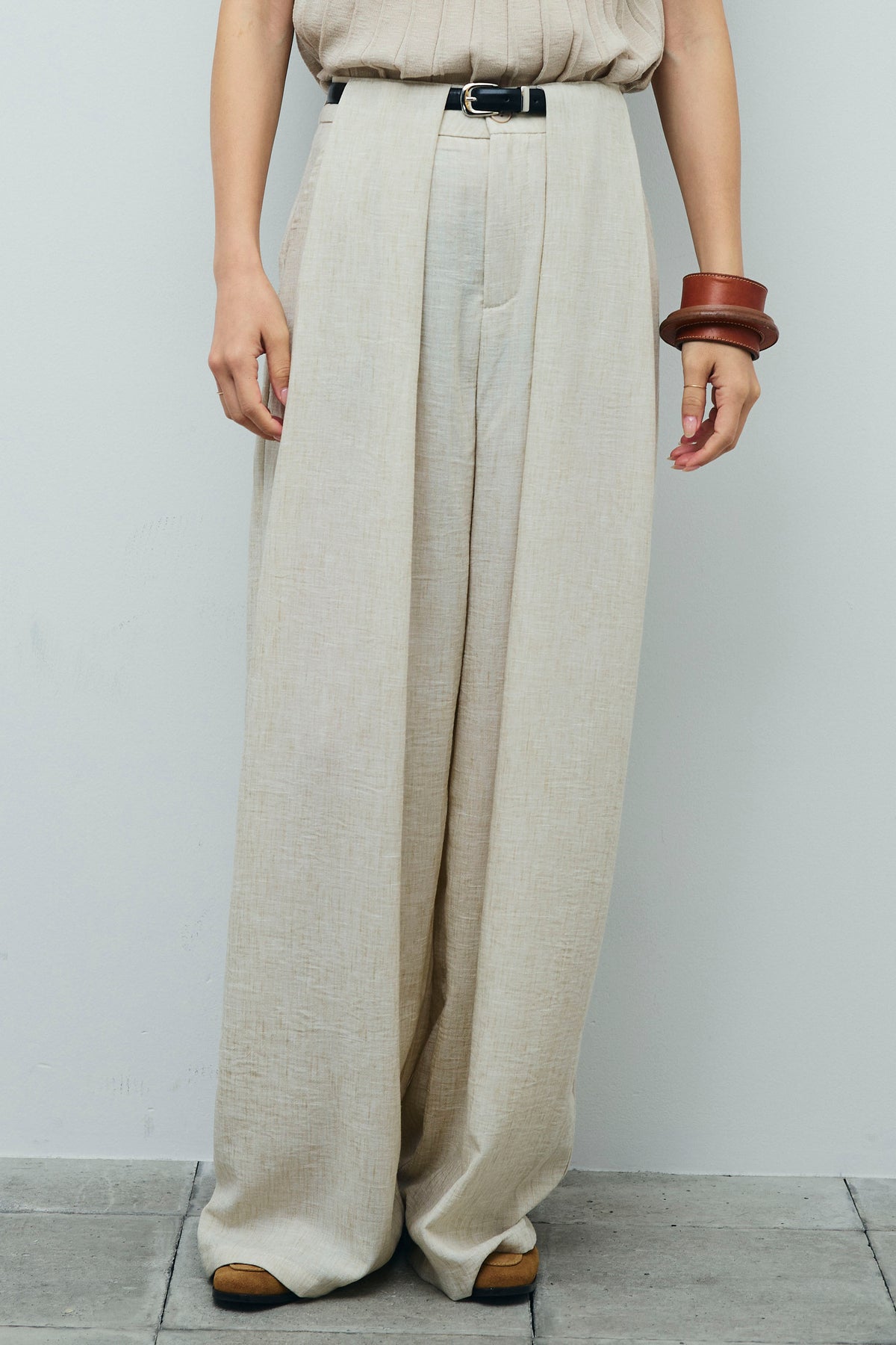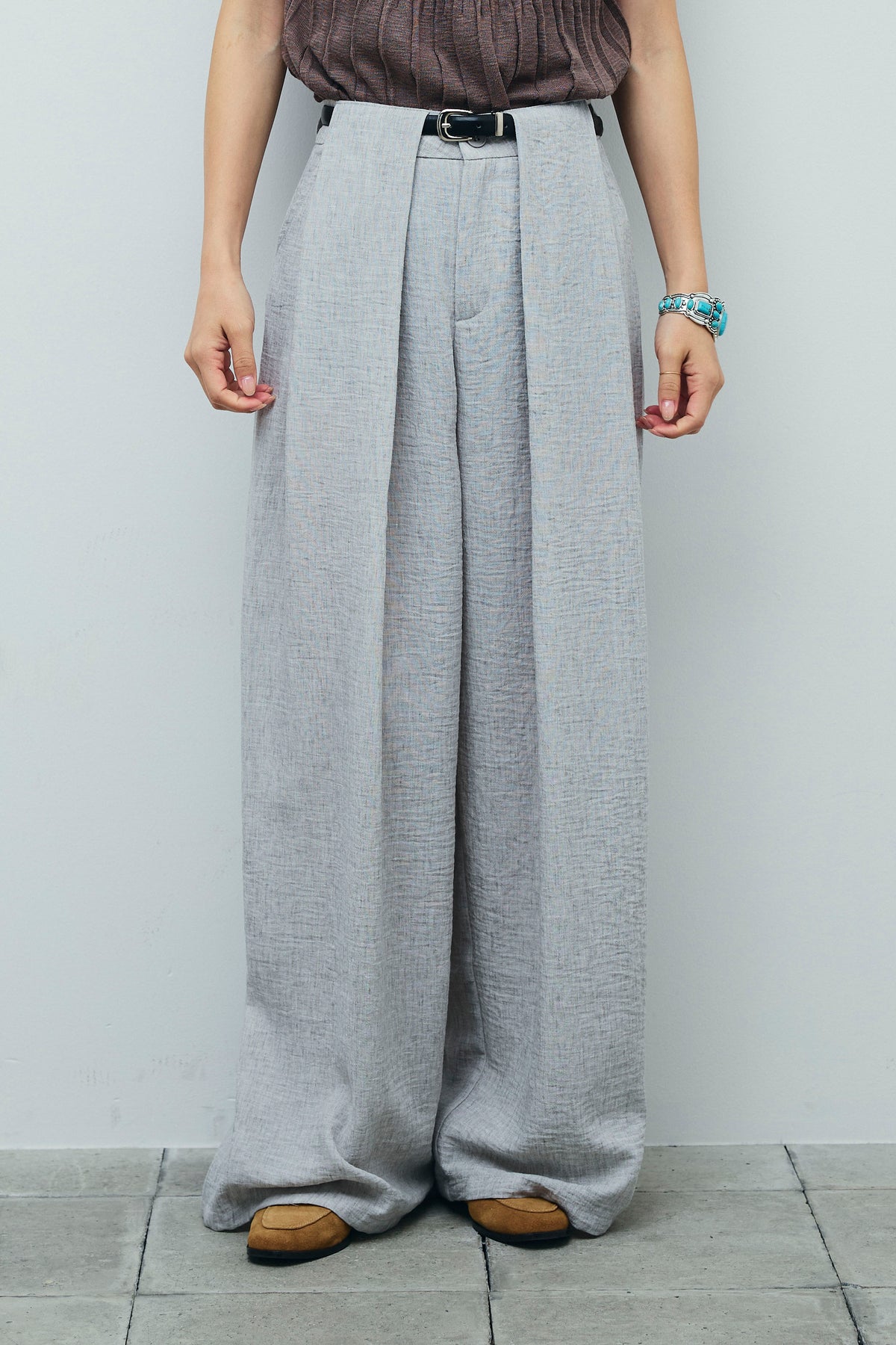 ベルト付きできちんと感を添えたタック入りのサマーワイドパンツ。軽やかな素材感とワイドシルエットが涼しげな抜け感を演出し、タックが生む縦のラインでスタイルアップ効果も期待できます。ウエストまわりをすっきり見せつつ、リラクシーな穿き心地を実現。オンにもオフにも対応できる、大人のための頼れる一本です。