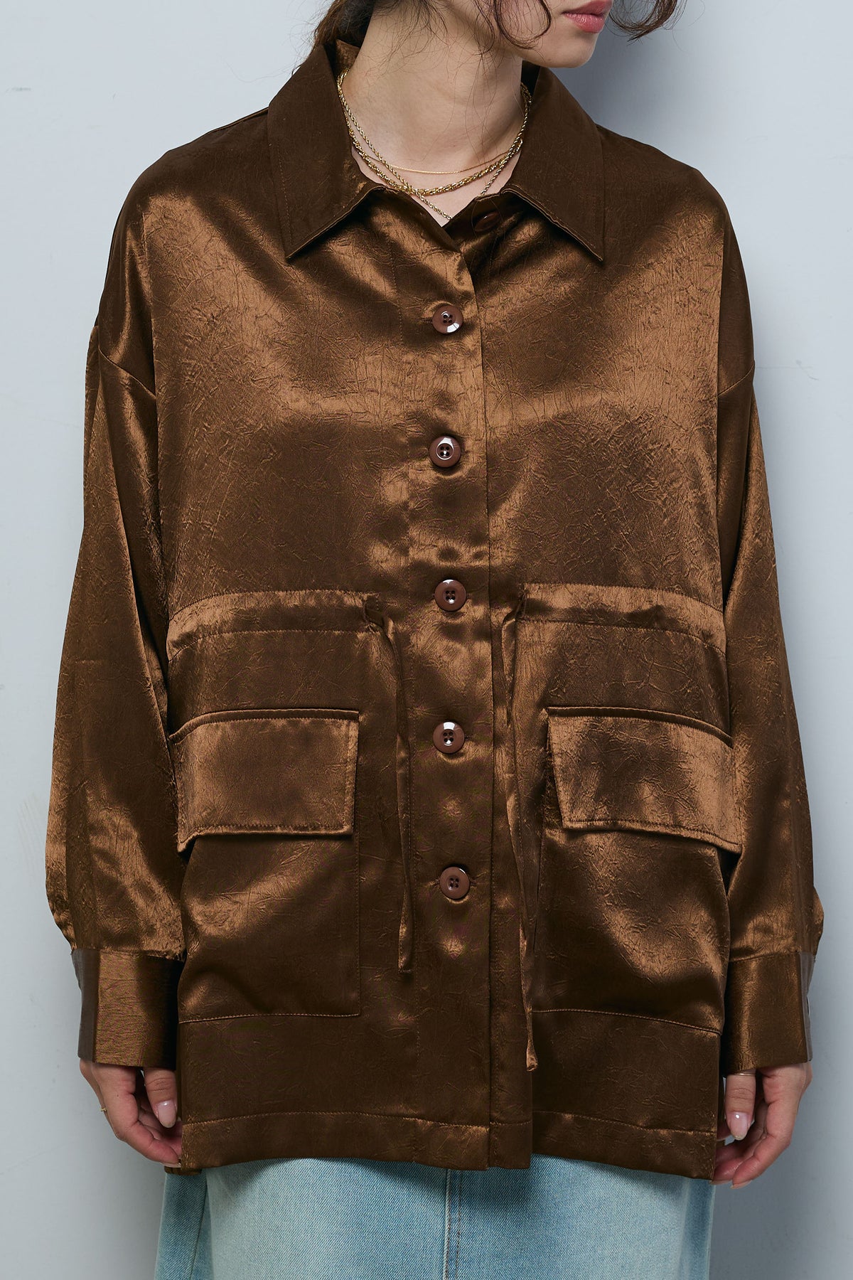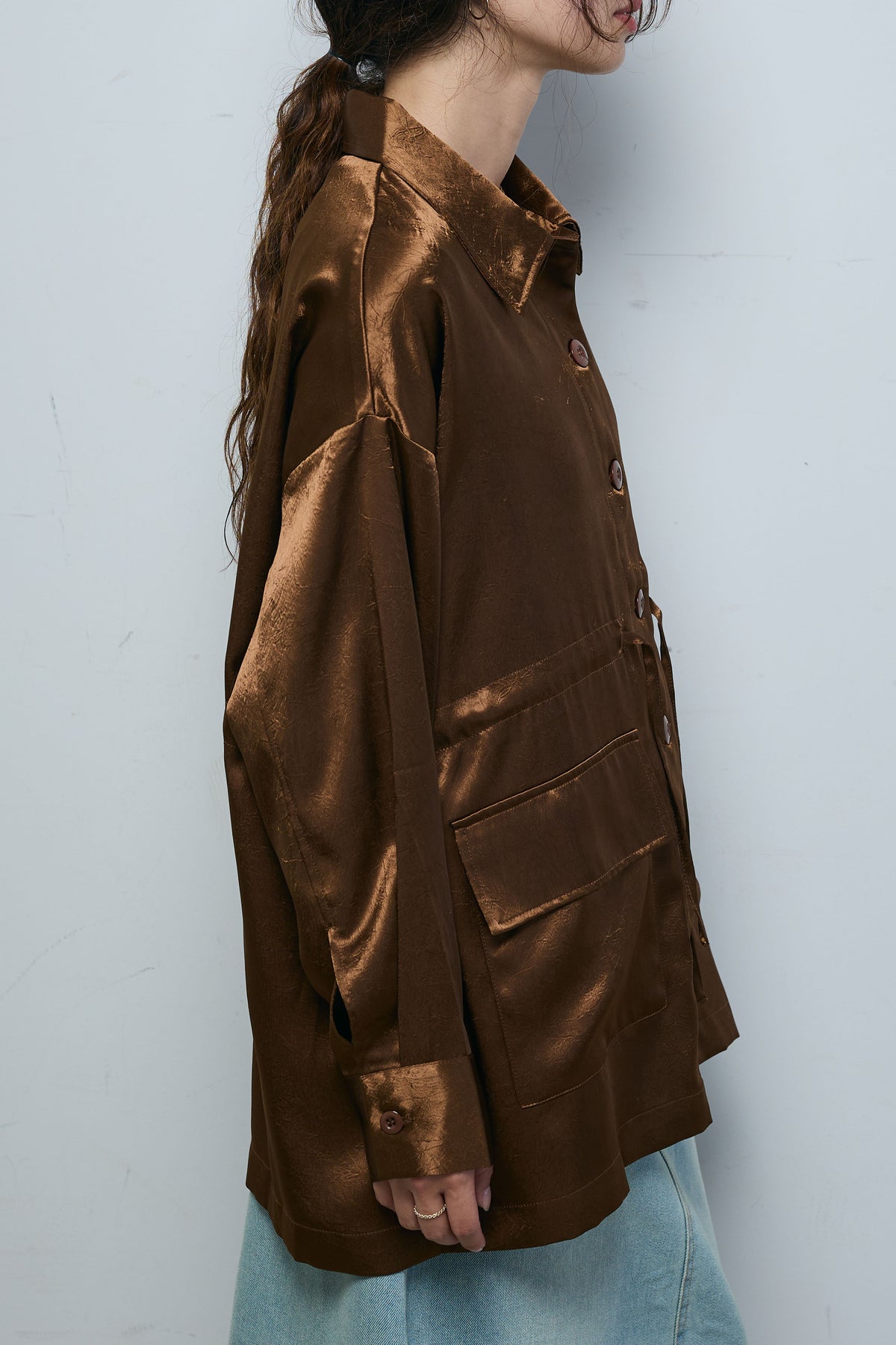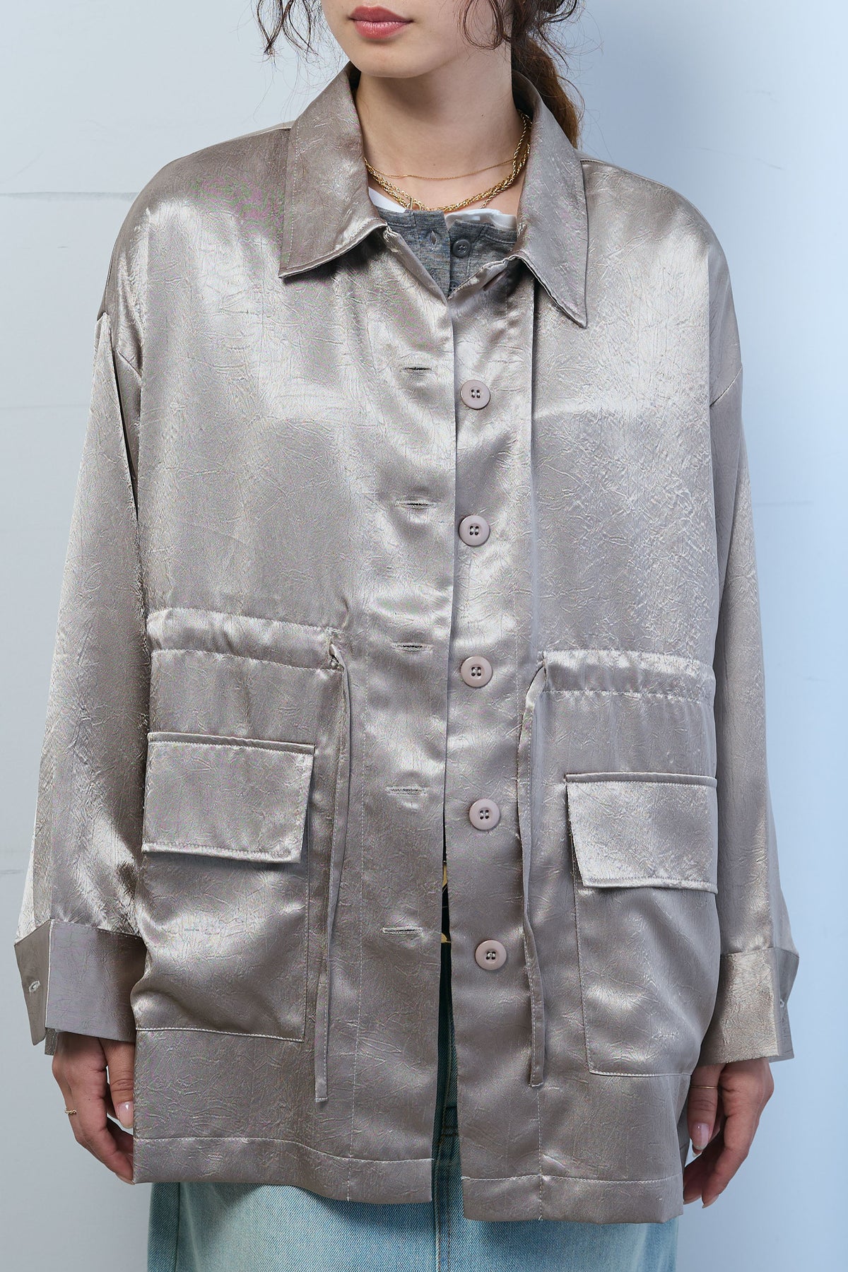 サテンミリタリーシャツJKは、光沢感のあるサテン素材で仕立てられたミリタリー風シャツジャケットです。ゆったりとしたシルエットで着心地がよく、ウエスト部分にはドローストリングがついており、シルエットの調整が可能。フロントには大きなポケットがあしらわれており、機能性も兼ね備えています。カジュアルながらも上品なサテンの質感がモダンで洗練された印象を与え、シンプルなコーディネートにもアクセントを加える一着です。軽やかな羽織りとして春や秋の季節に活躍します。