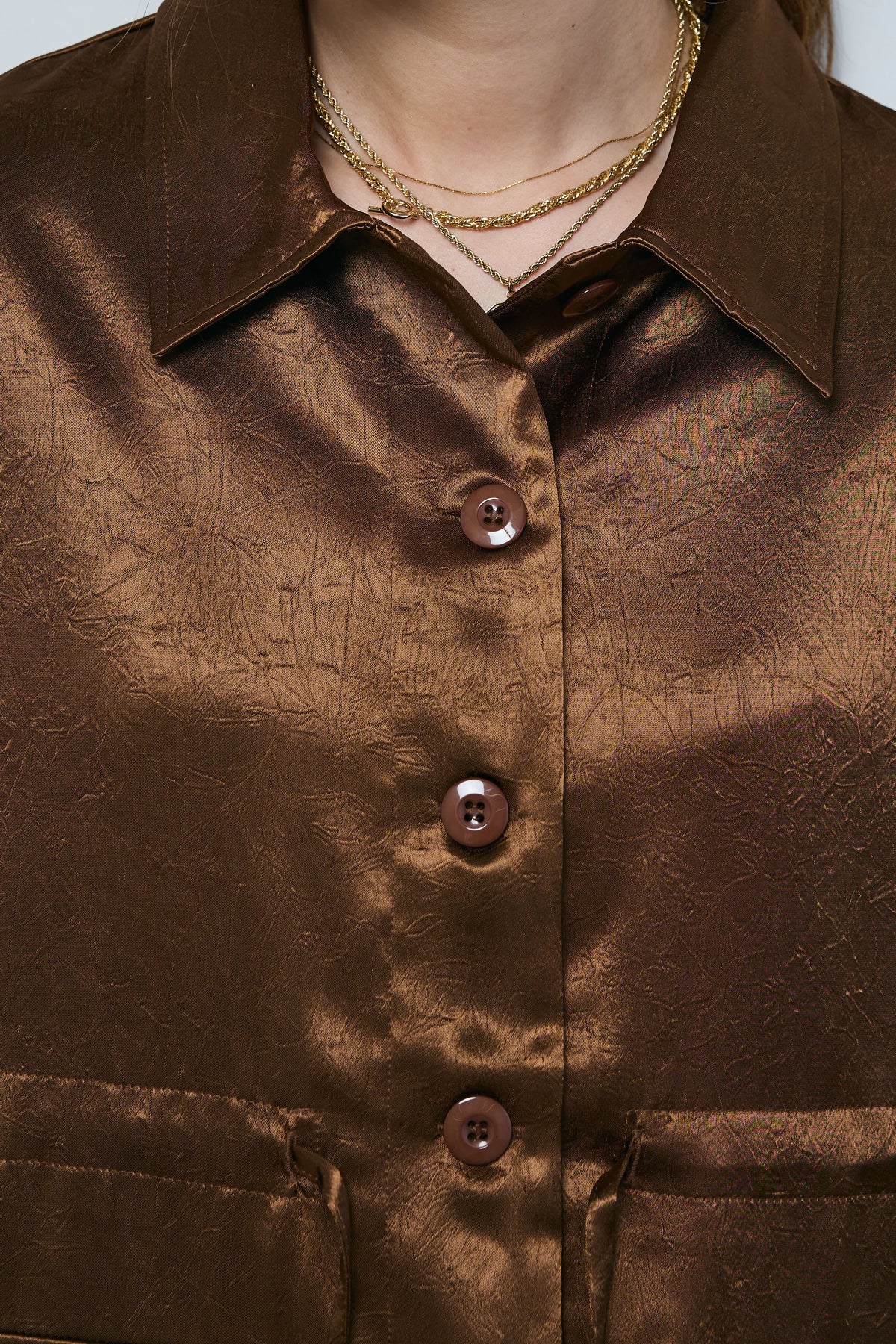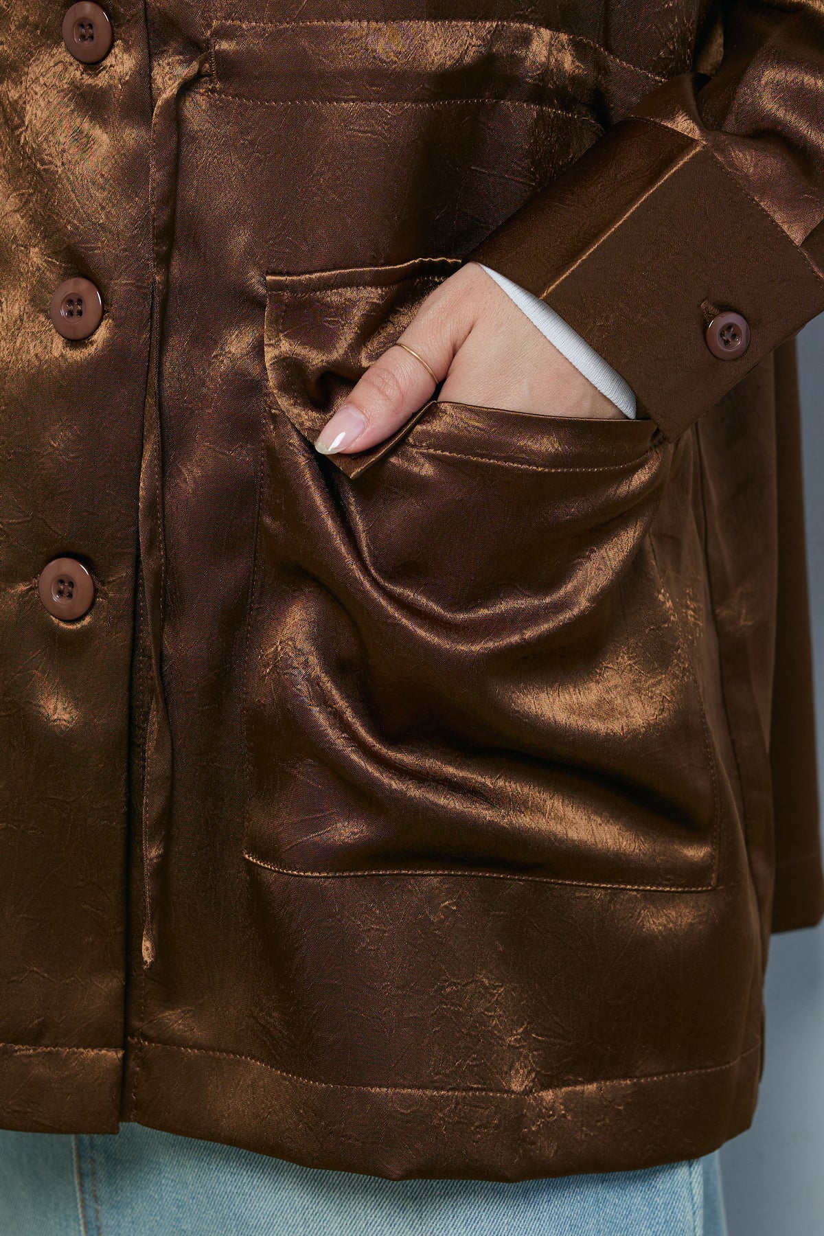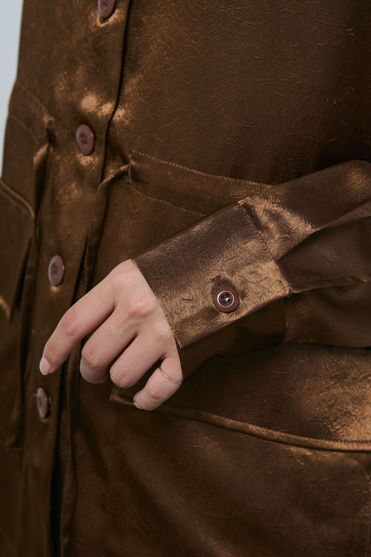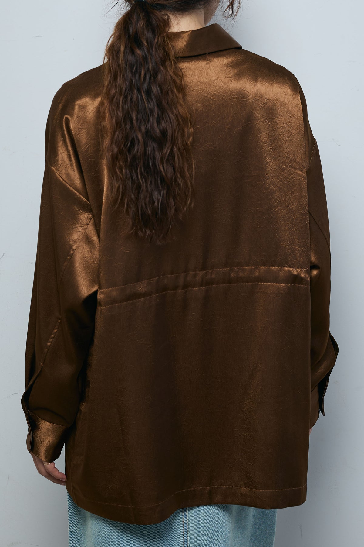 サテンミリタリーシャツJKは、光沢感のあるサテン素材で仕立てられたミリタリー風シャツジャケットです。ゆったりとしたシルエットで着心地がよく、ウエスト部分にはドローストリングがついており、シルエットの調整が可能。フロントには大きなポケットがあしらわれており、機能性も兼ね備えています。カジュアルながらも上品なサテンの質感がモダンで洗練された印象を与え、シンプルなコーディネートにもアクセントを加える一着です。軽やかな羽織りとして春や秋の季節に活躍します。