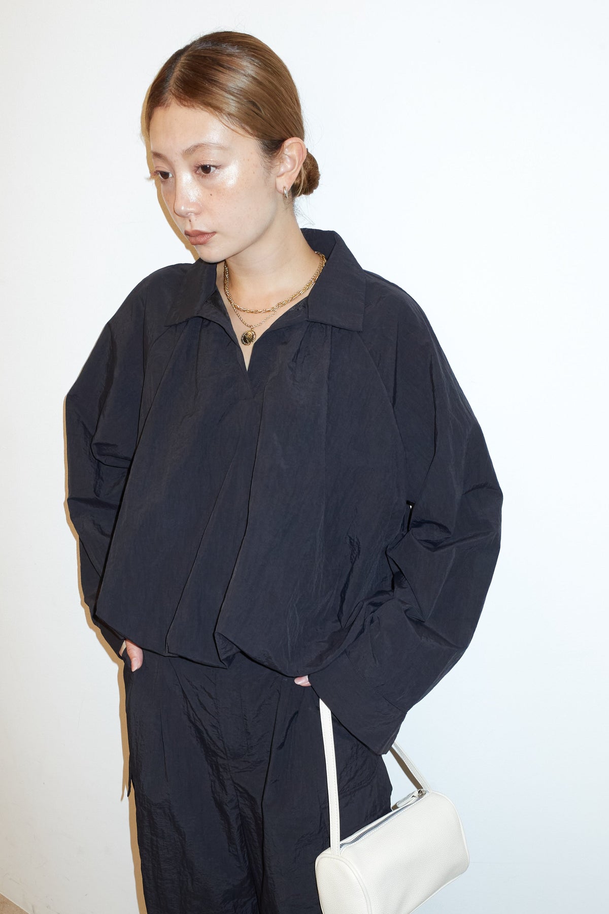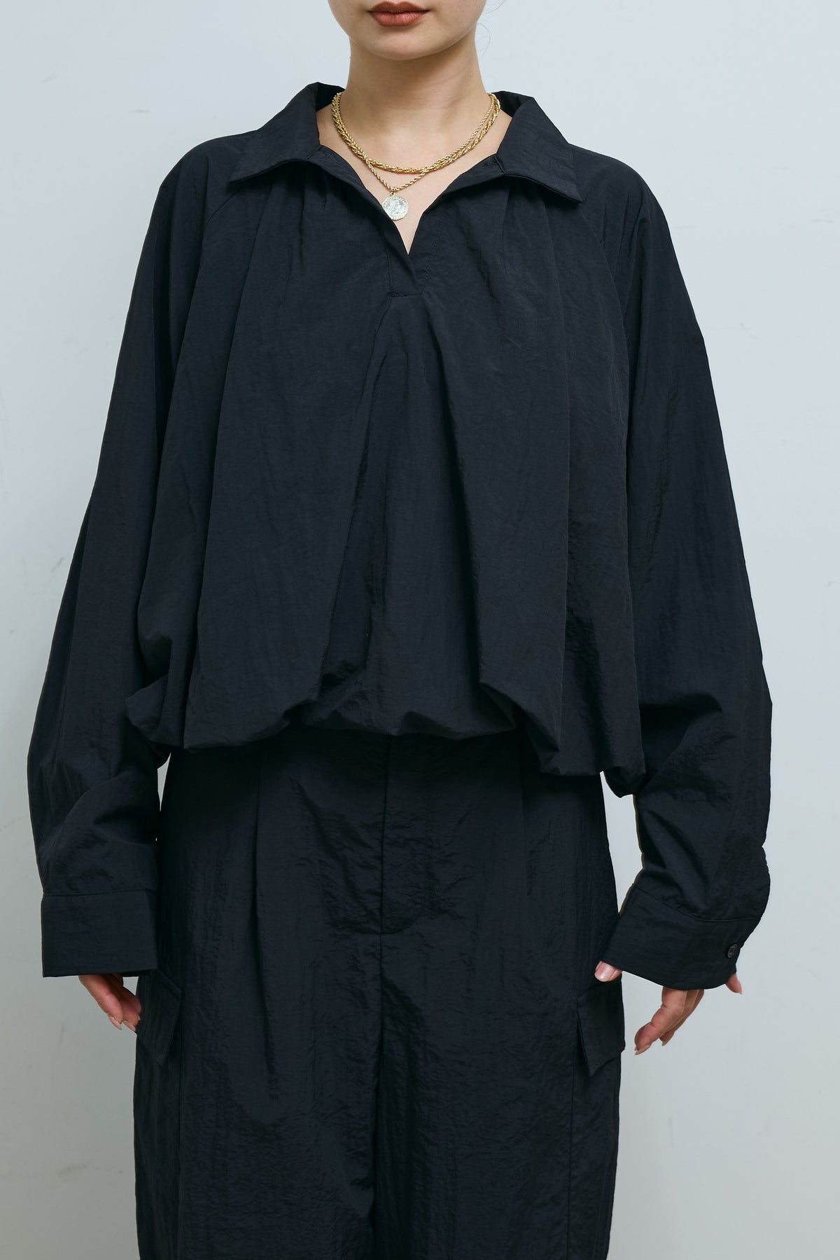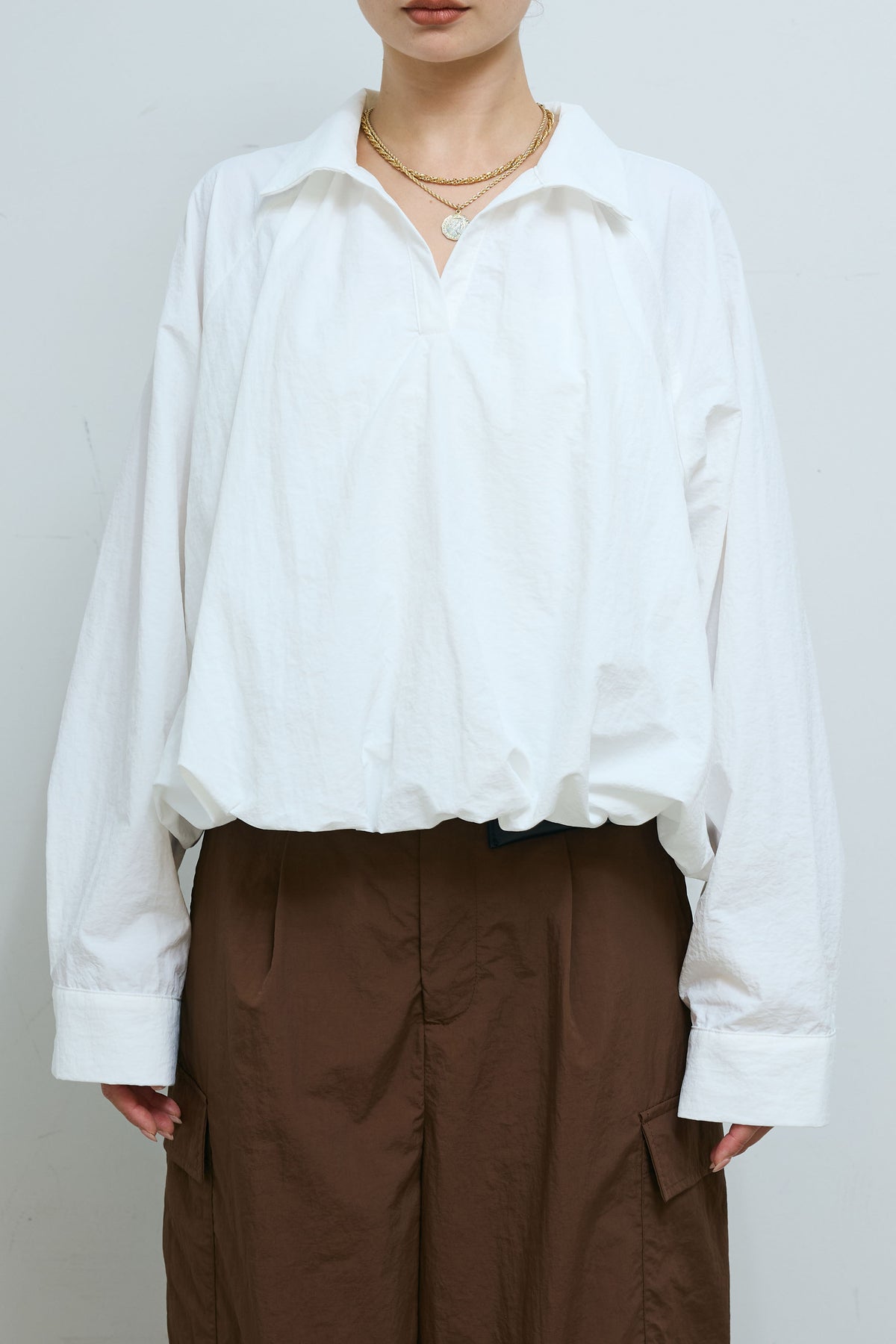ナイロン素材の軽やかさとハリ感が魅力のスキッパーバルーンシャツ。ふんわりと立体的なシルエットがこなれた印象を引き立て、フロントの開きで抜け感も演出。袖や裾に程よいボリュームを持たせることで、1枚でサマになるバランスに仕上げました。タックイン・アウトどちらも様になり、さまざまなボトムと好相性。シーズンレスで着回しの効く万能アイテムです。