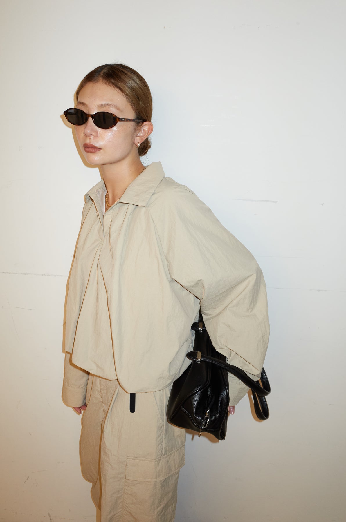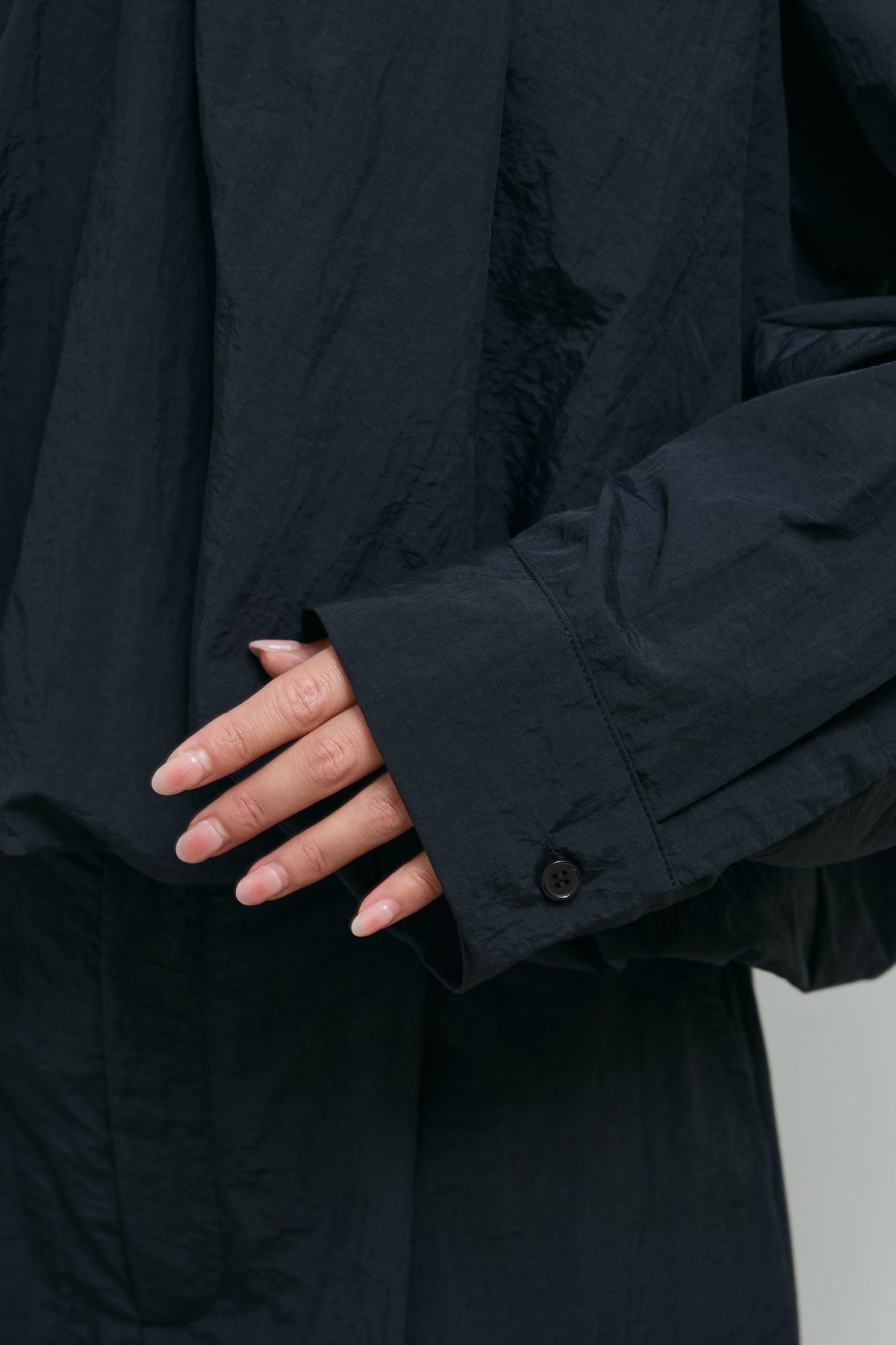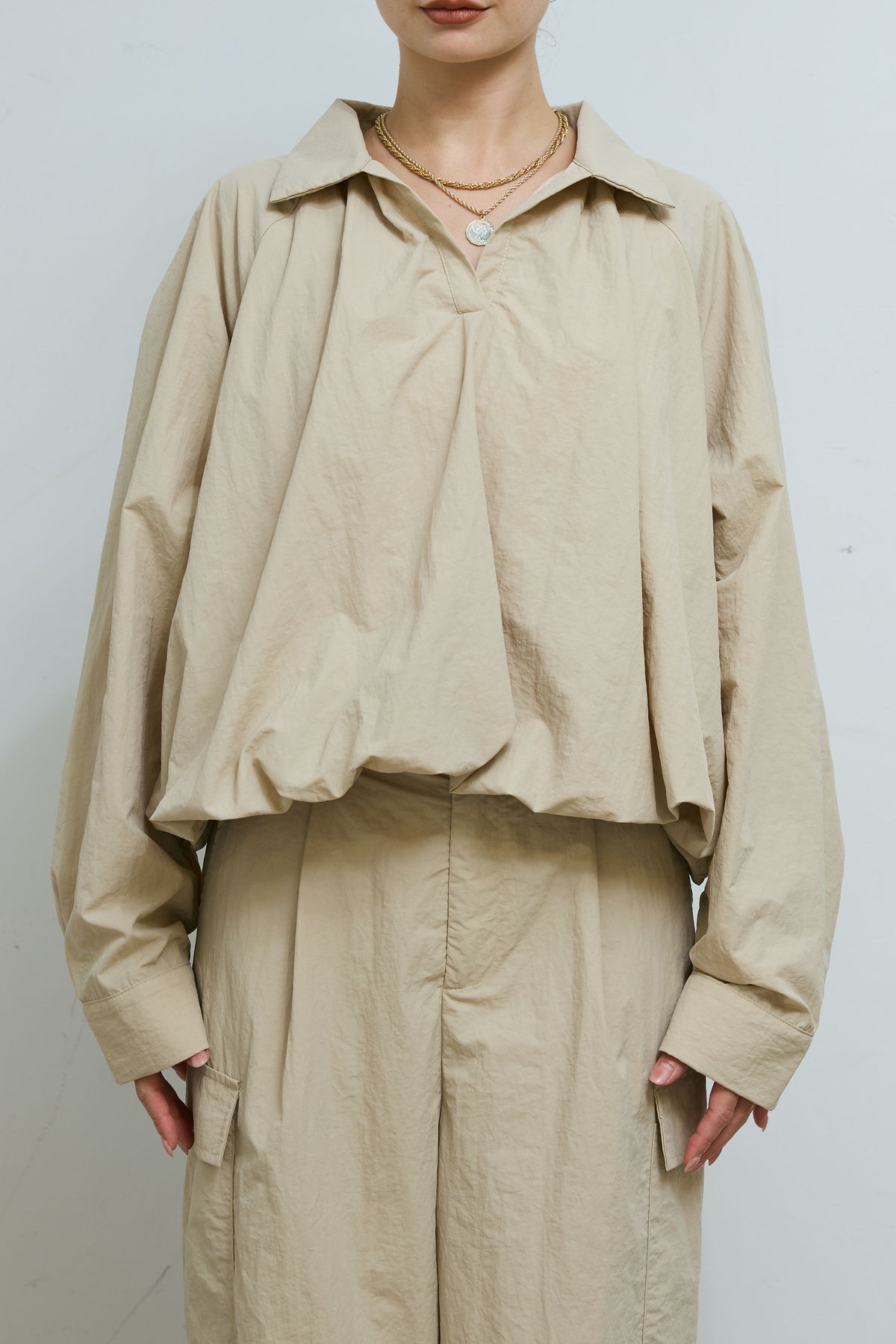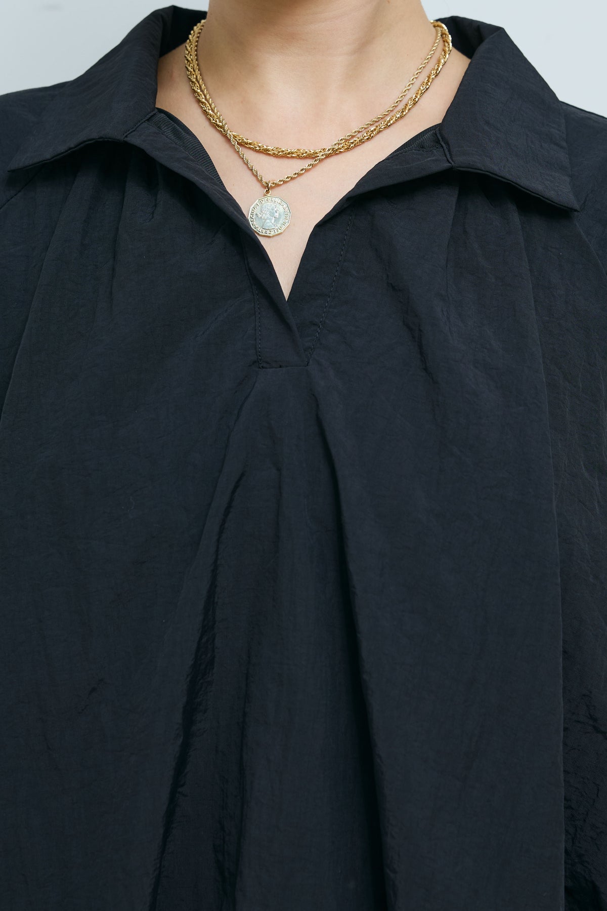 ナイロン素材の軽やかさとハリ感が魅力のスキッパーバルーンシャツ。ふんわりと立体的なシルエットがこなれた印象を引き立て、フロントの開きで抜け感も演出。袖や裾に程よいボリュームを持たせることで、1枚でサマになるバランスに仕上げました。タックイン・アウトどちらも様になり、さまざまなボトムと好相性。シーズンレスで着回しの効く万能アイテムです。
