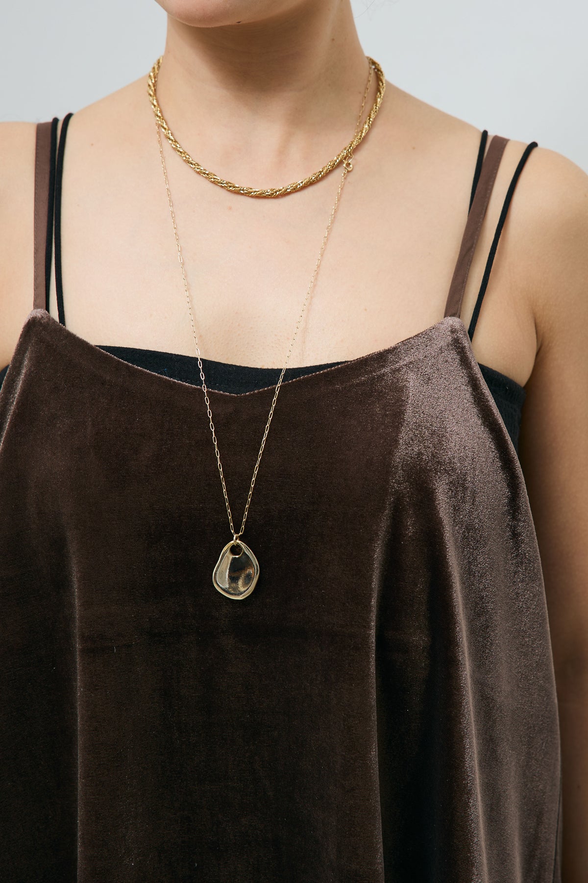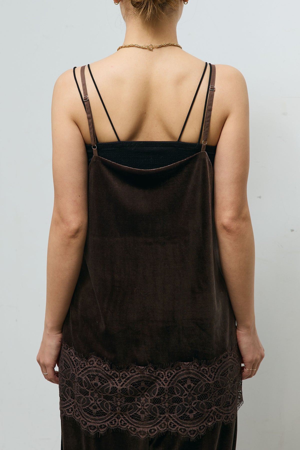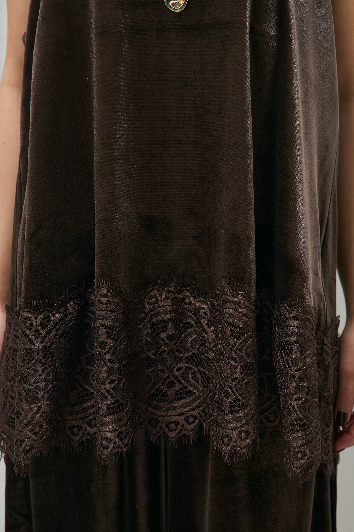 滑らかな光沢を放つベロア生地に、裾へ繊細なレースをあしらったキャミソール。ほんのり広がるシルエットが身体を包み込み、動きに合わせて優しく揺れるデザインです。華奢なストラップが上半身をすっきり見せ、インナー合わせやレイヤードにも取り入れやすい一枚。ニットやジャケットとの組み合わせで、季節を問わず幅広いスタイリングが楽しめる万能アイテムです。