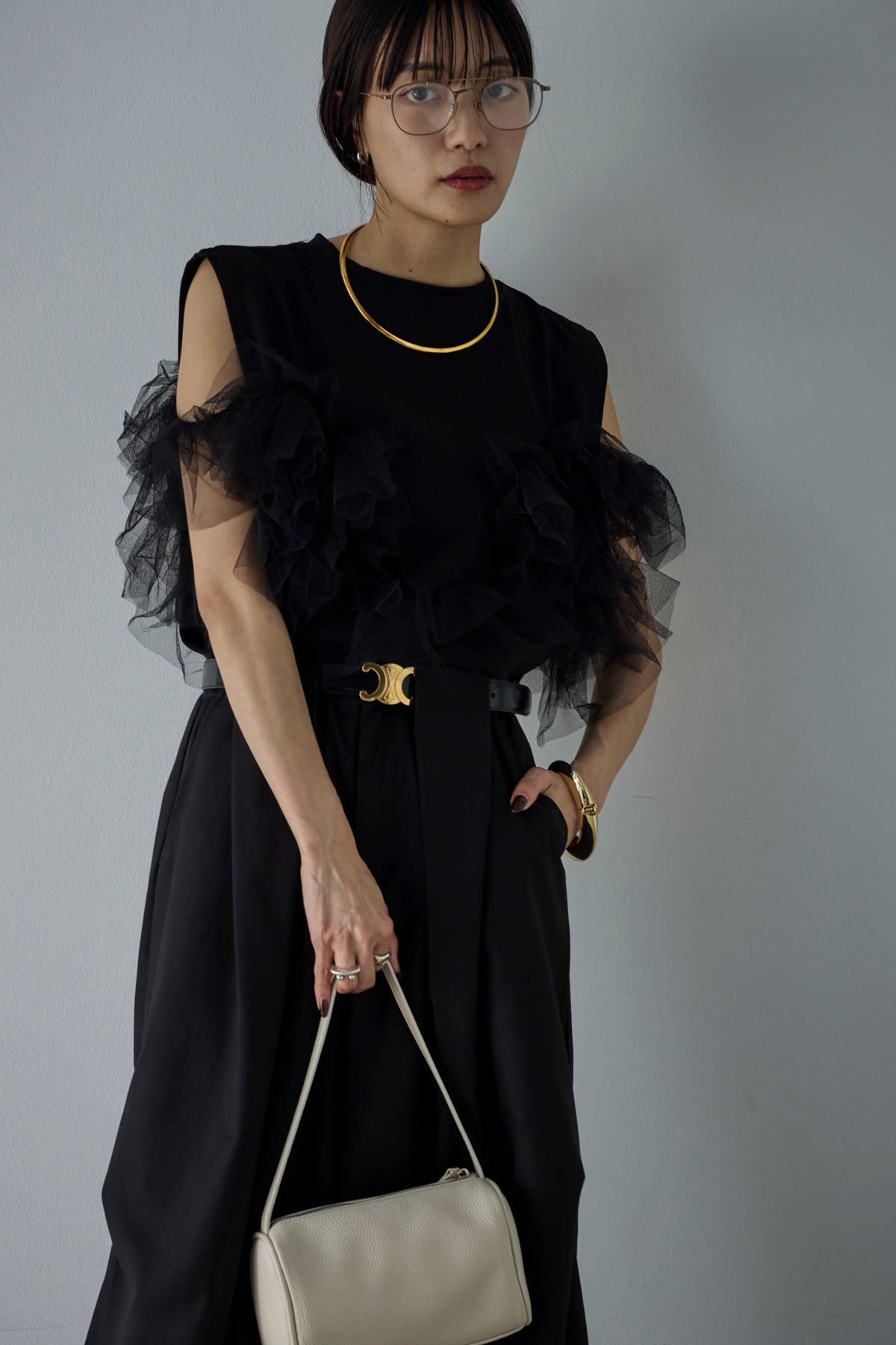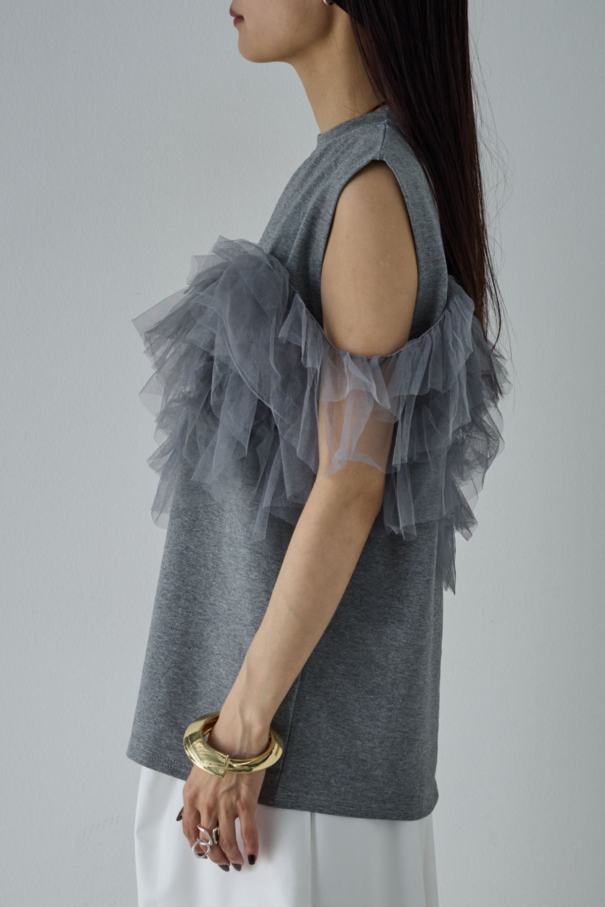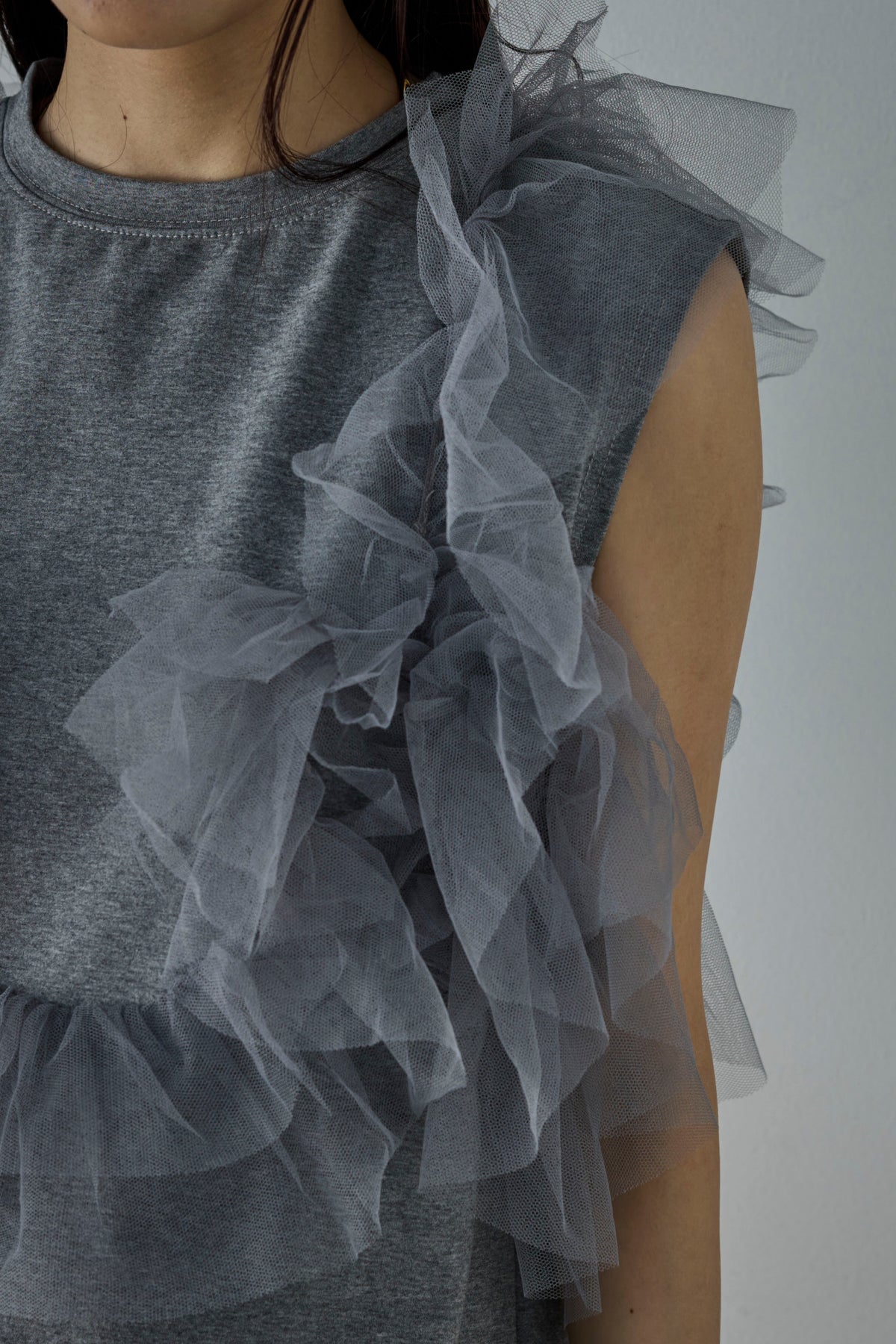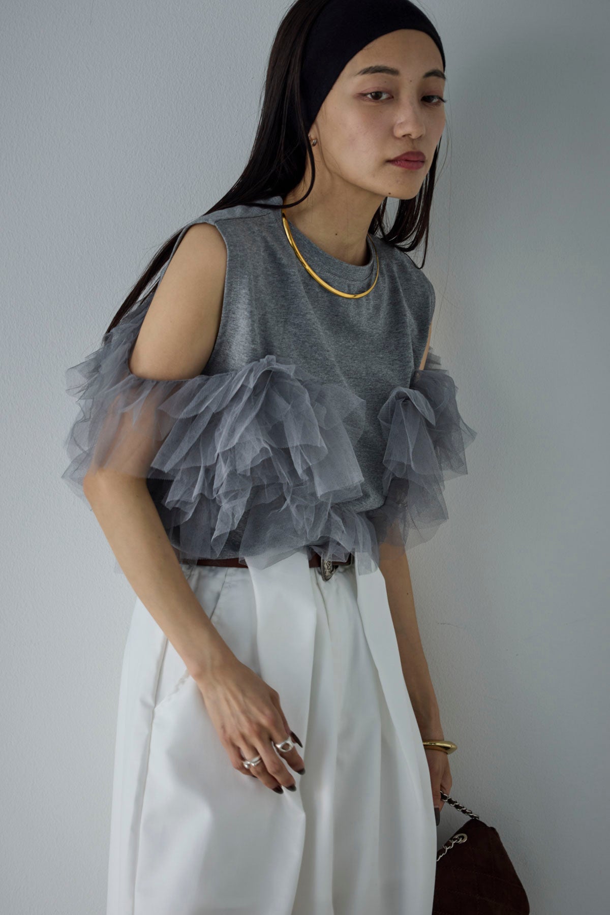 天竺チュールドッキングプルオーバーは、柔らかなカットソー素材に軽やかなチュールをふんだんにドッキングし、立体感のある華やかなデザインが魅力で、カジュアルながらもフェミニンさを兼ね備えた大人の遊び心を感じさせる一枚です。