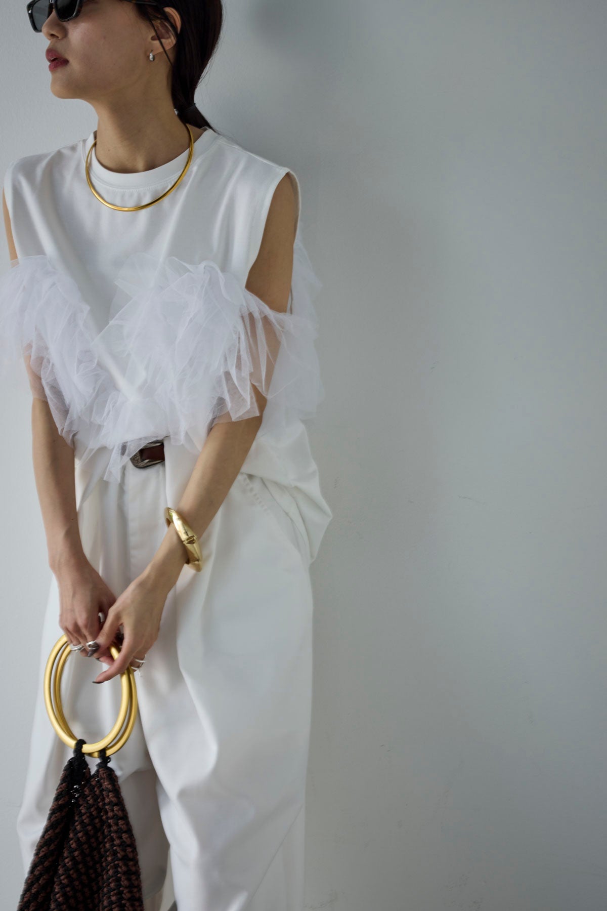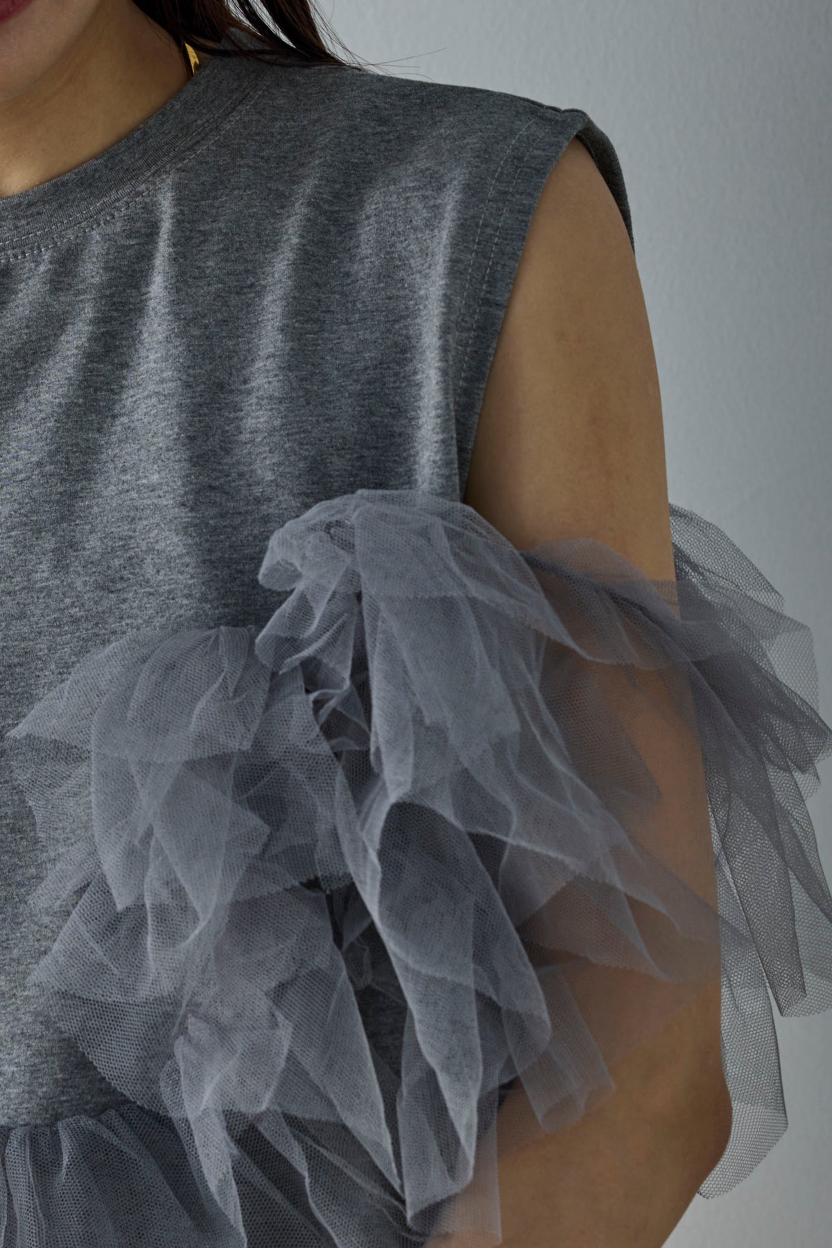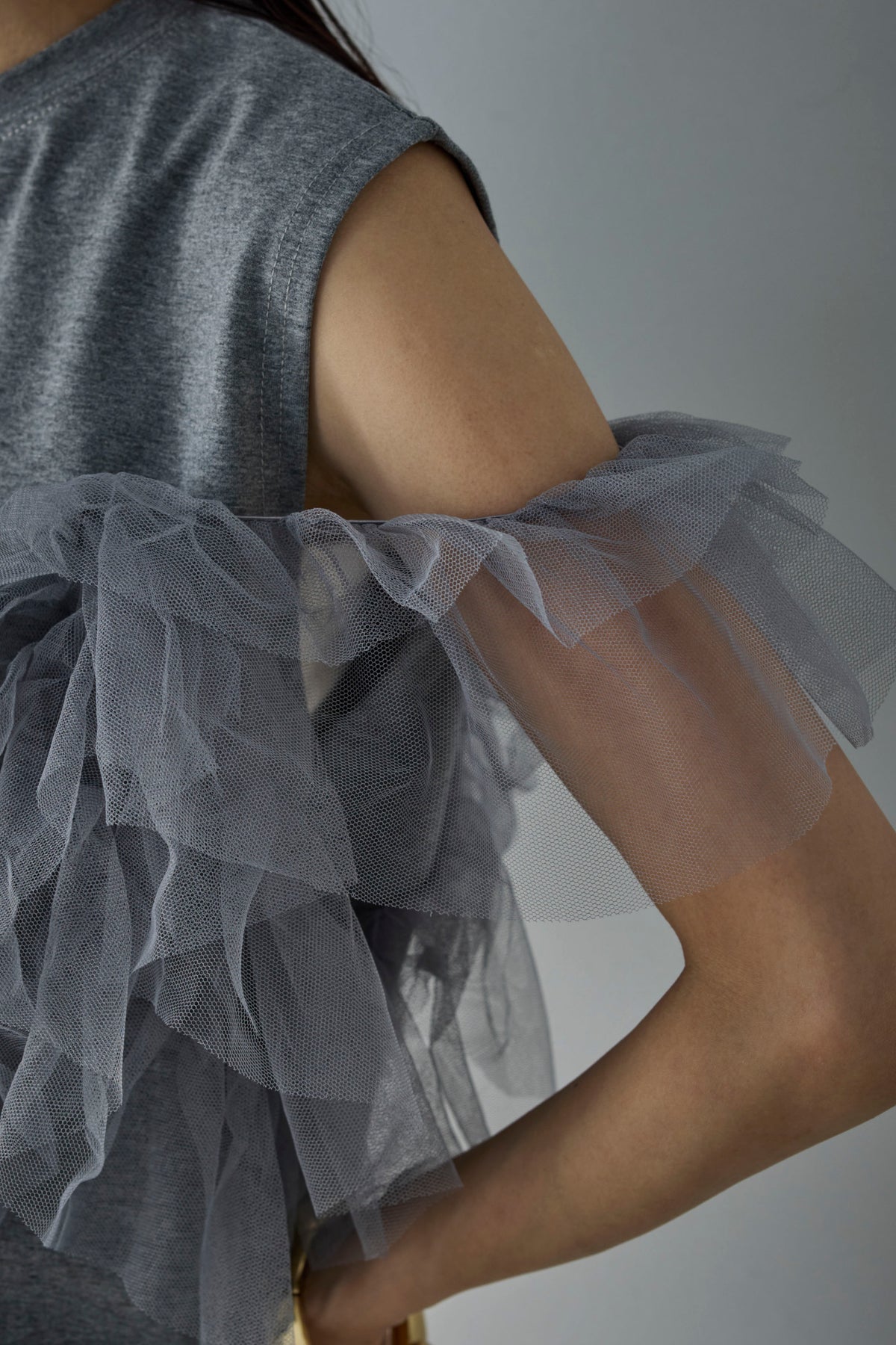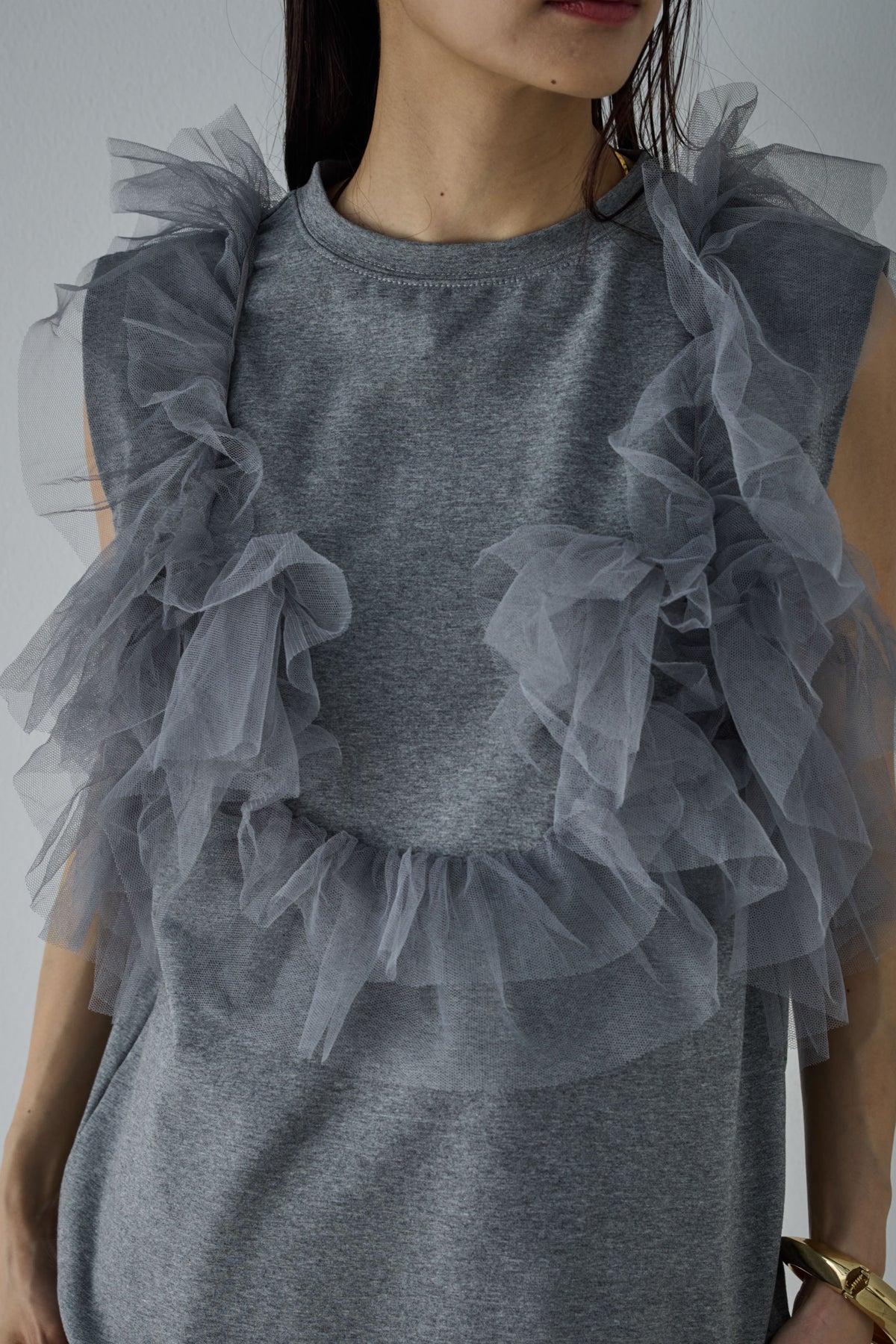 天竺チュールドッキングプルオーバーは、柔らかなカットソー素材に軽やかなチュールをふんだんにドッキングし、立体感のある華やかなデザインが魅力で、カジュアルながらもフェミニンさを兼ね備えた大人の遊び心を感じさせる一枚です。