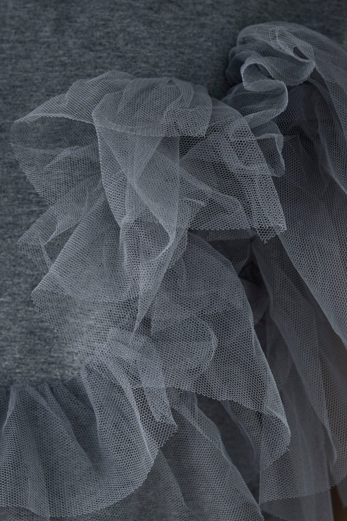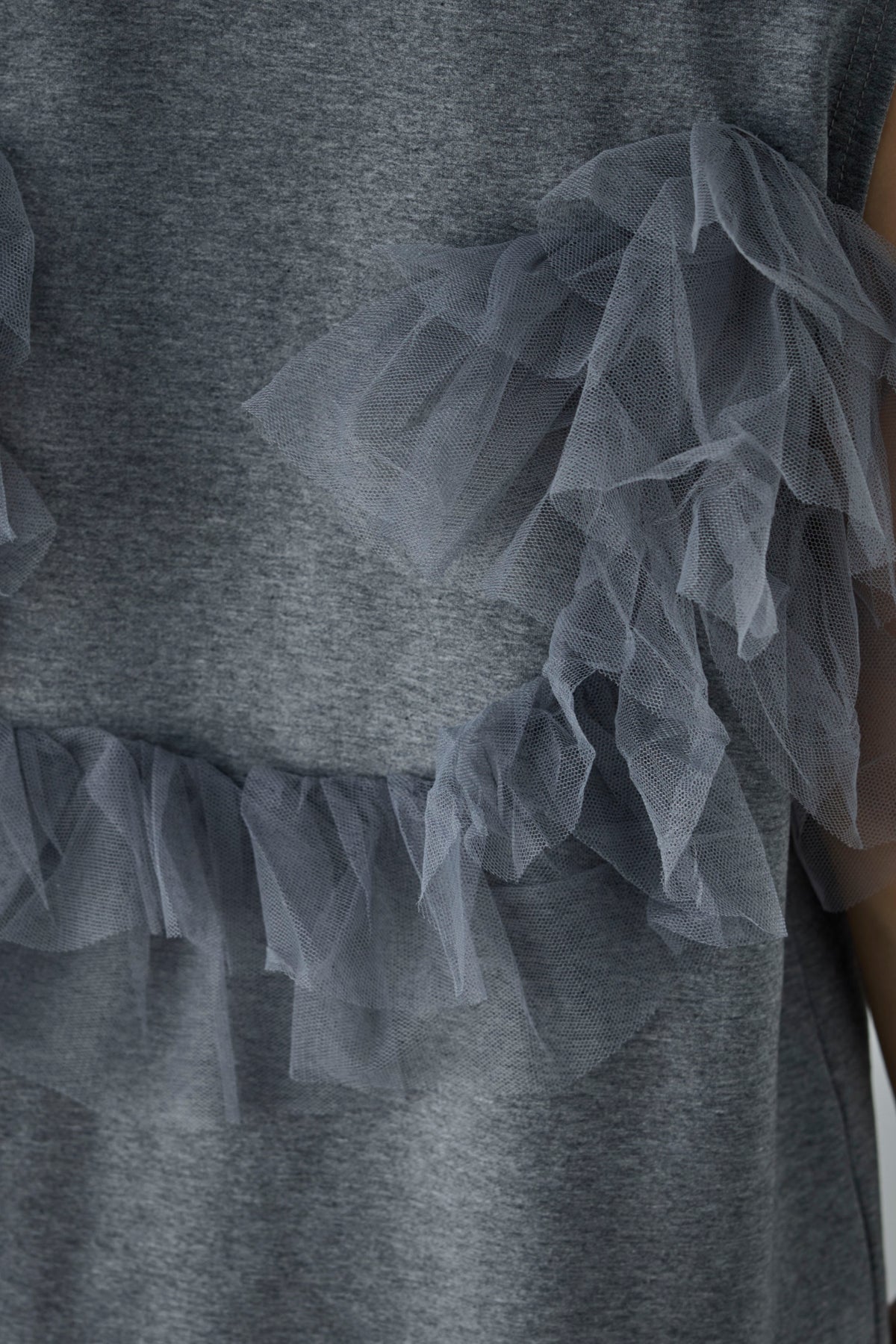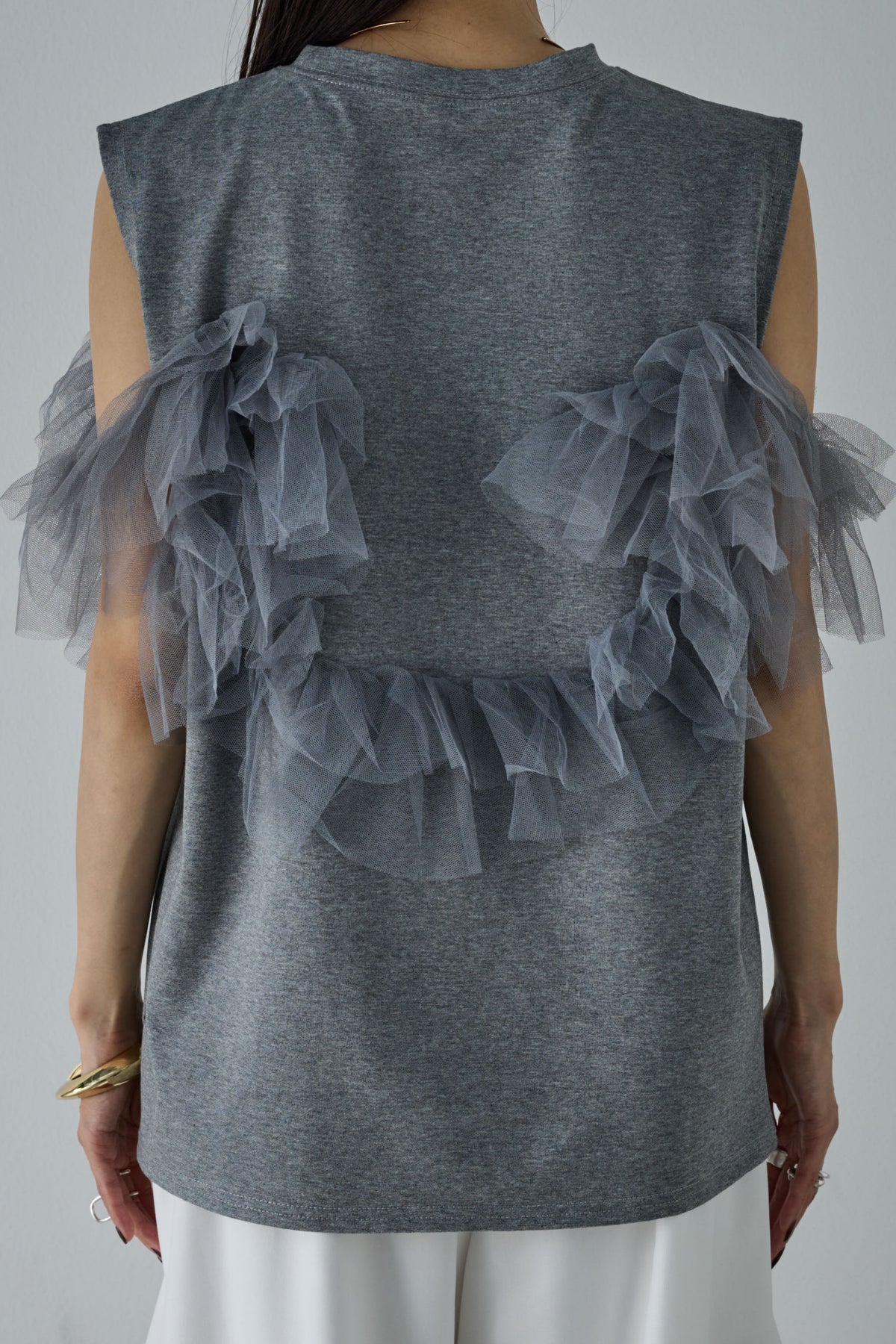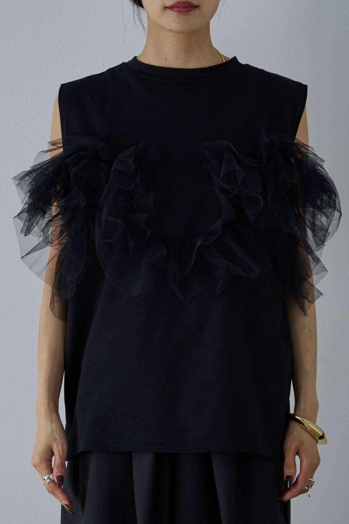天竺チュールドッキングプルオーバーは、柔らかなカットソー素材に軽やかなチュールをふんだんにドッキングし、立体感のある華やかなデザインが魅力で、カジュアルながらもフェミニンさを兼ね備えた大人の遊び心を感じさせる一枚です。