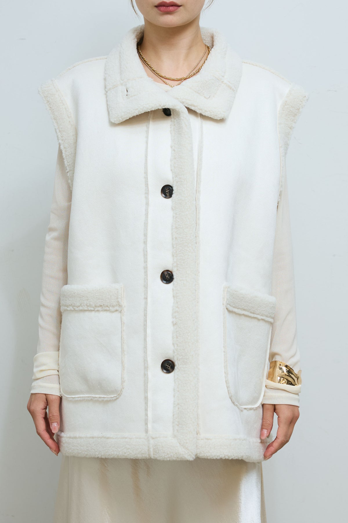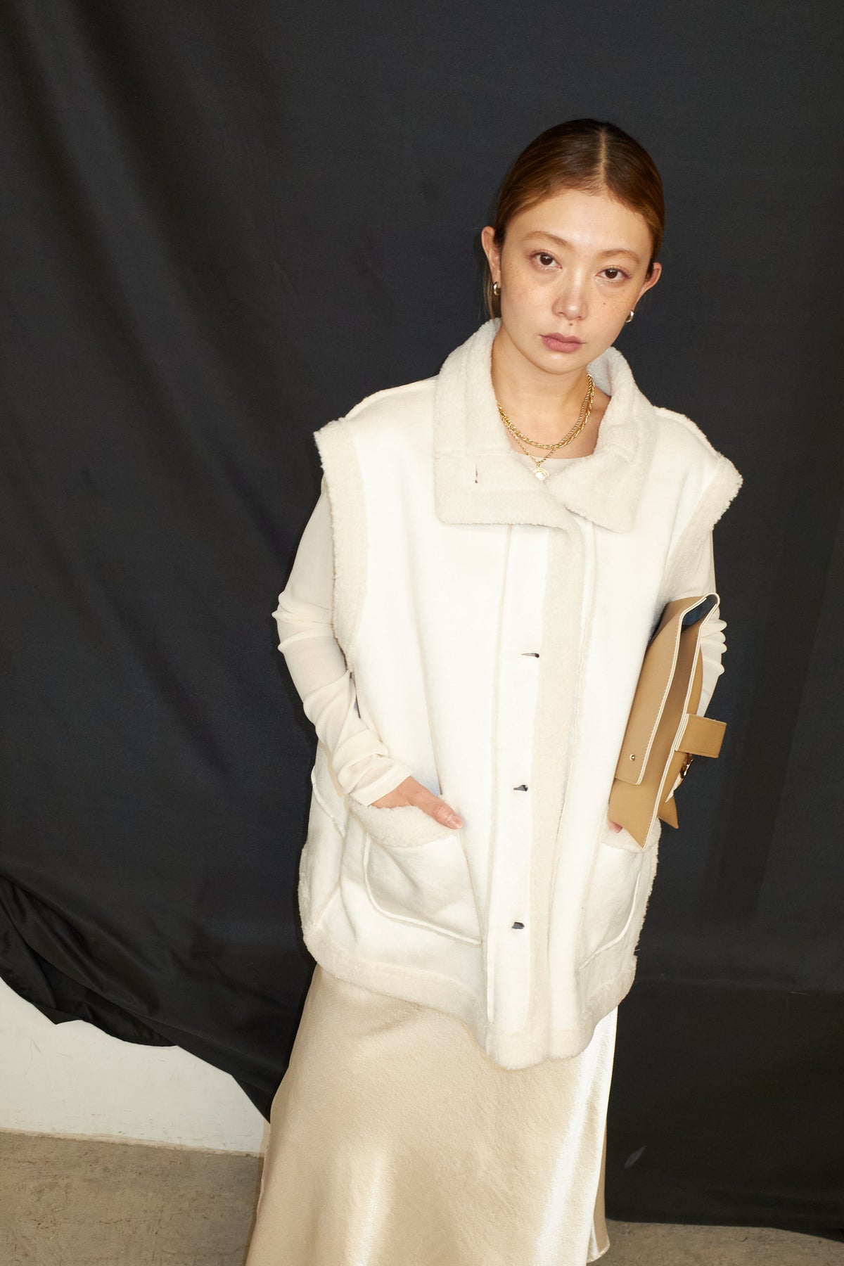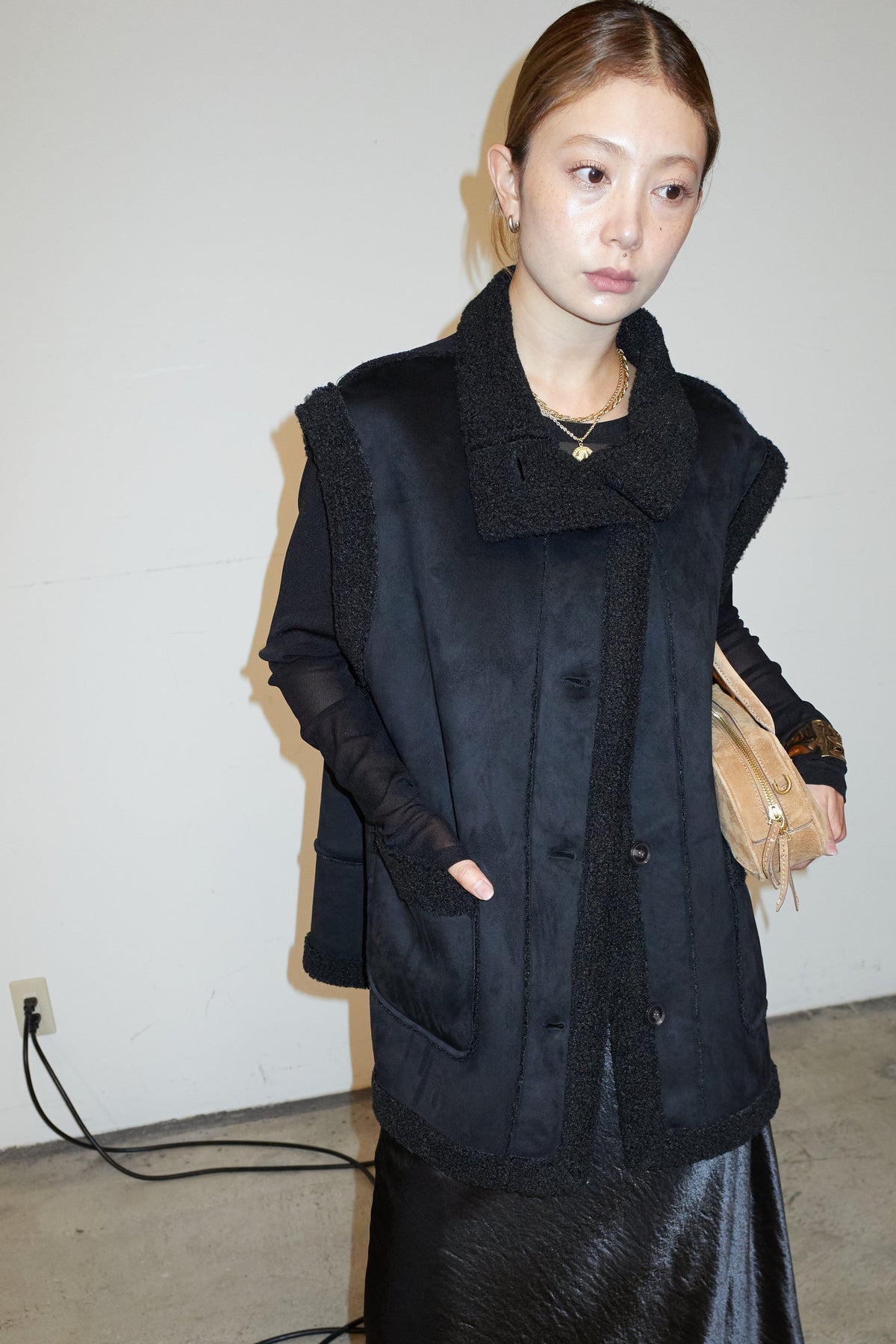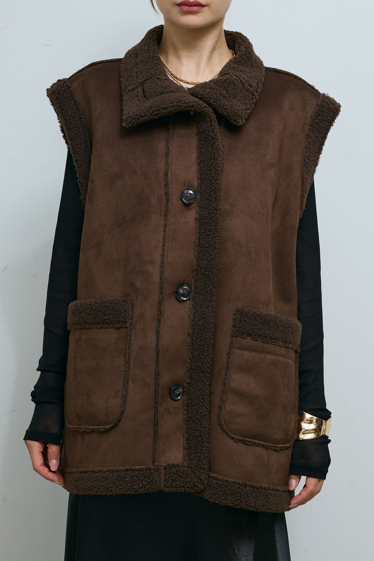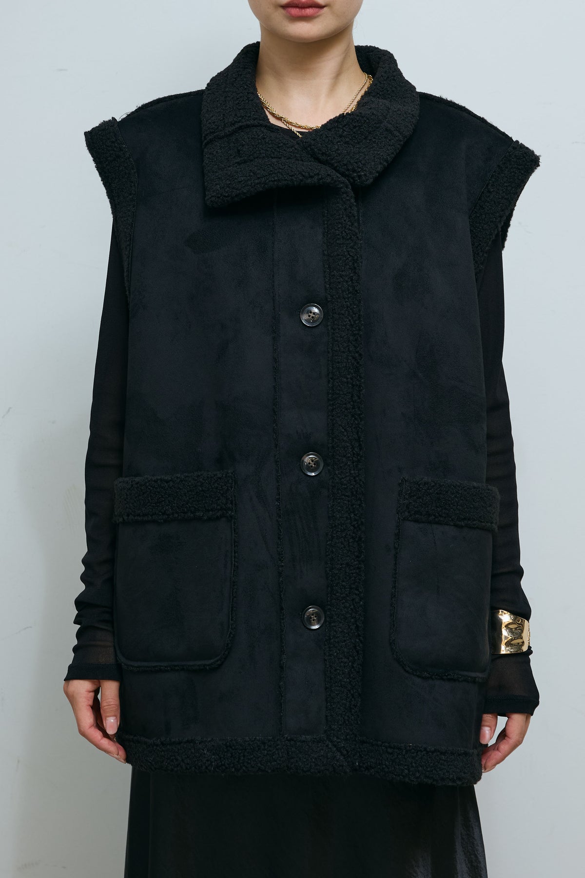 表面感のあるフェイクスエードと、トリミングのボア素材が絶妙なコントラストを生むベスト。首元までしっかり留められるスタンドネック仕様で、見た目も着心地も暖かく、季節の変わり目の軽アウターとして活躍します。カジュアルなパーカーからシャツ、ワンピースまで幅広くレイヤードでき、スタイリングに奥行きをプラス。両サイドの大きめポケットがアクセントになり、実用性も兼ね備えています。