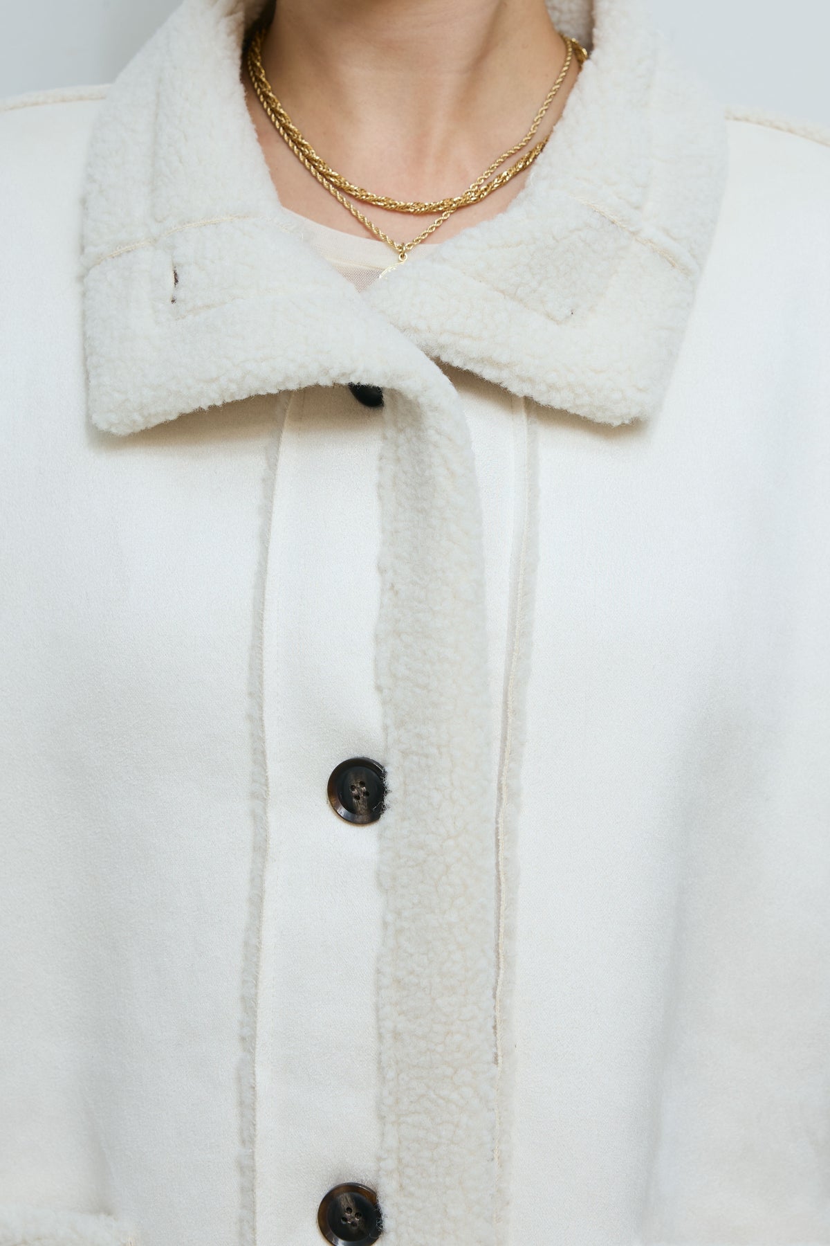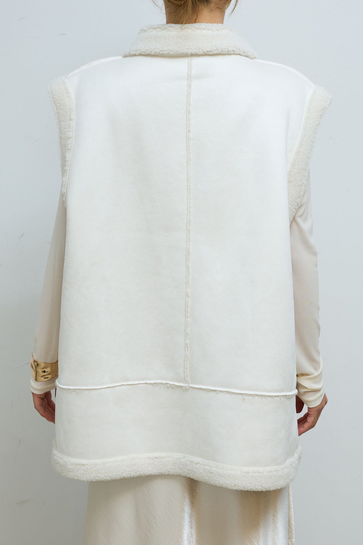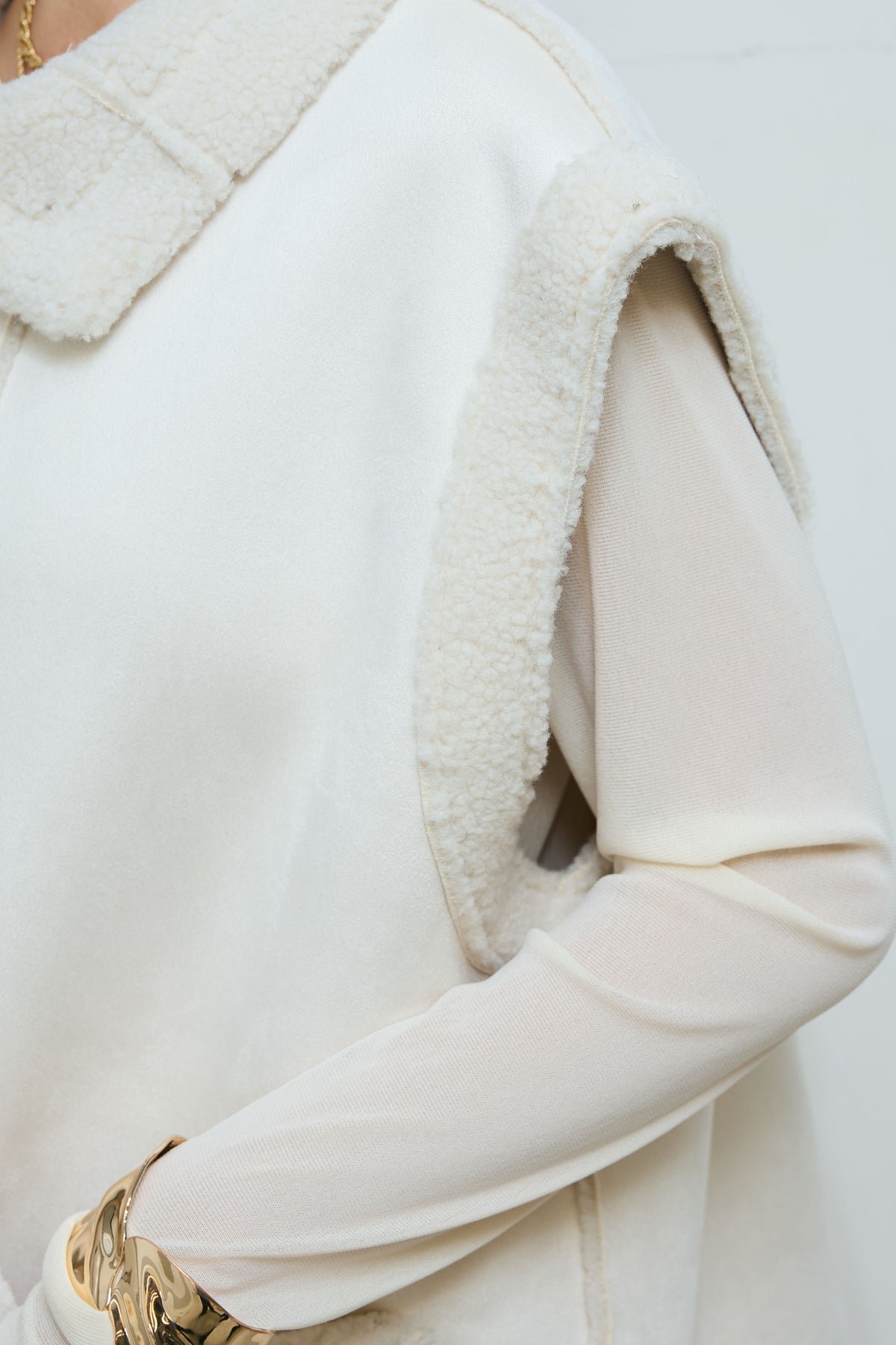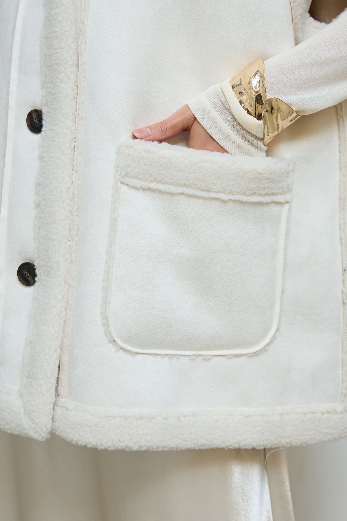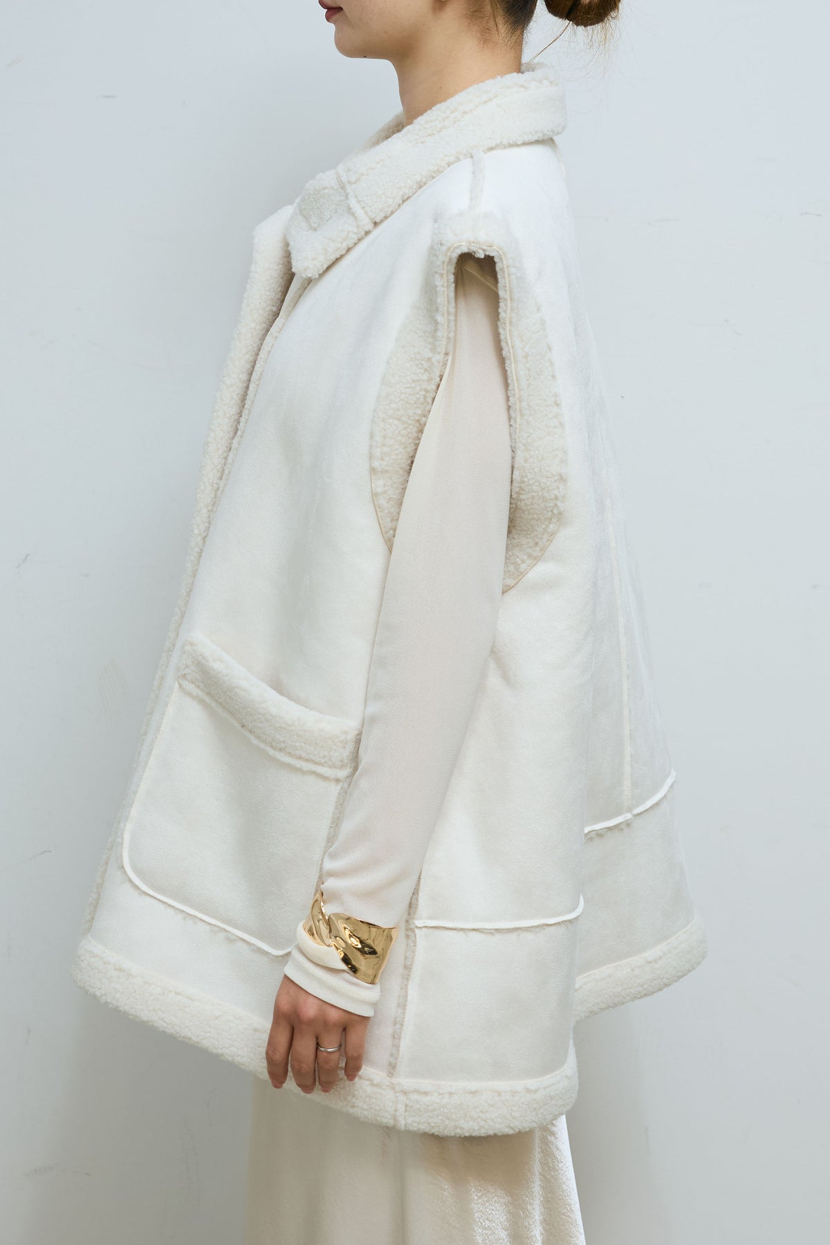表面感のあるフェイクスエードと、トリミングのボア素材が絶妙なコントラストを生むベスト。首元までしっかり留められるスタンドネック仕様で、見た目も着心地も暖かく、季節の変わり目の軽アウターとして活躍します。カジュアルなパーカーからシャツ、ワンピースまで幅広くレイヤードでき、スタイリングに奥行きをプラス。両サイドの大きめポケットがアクセントになり、実用性も兼ね備えています。
